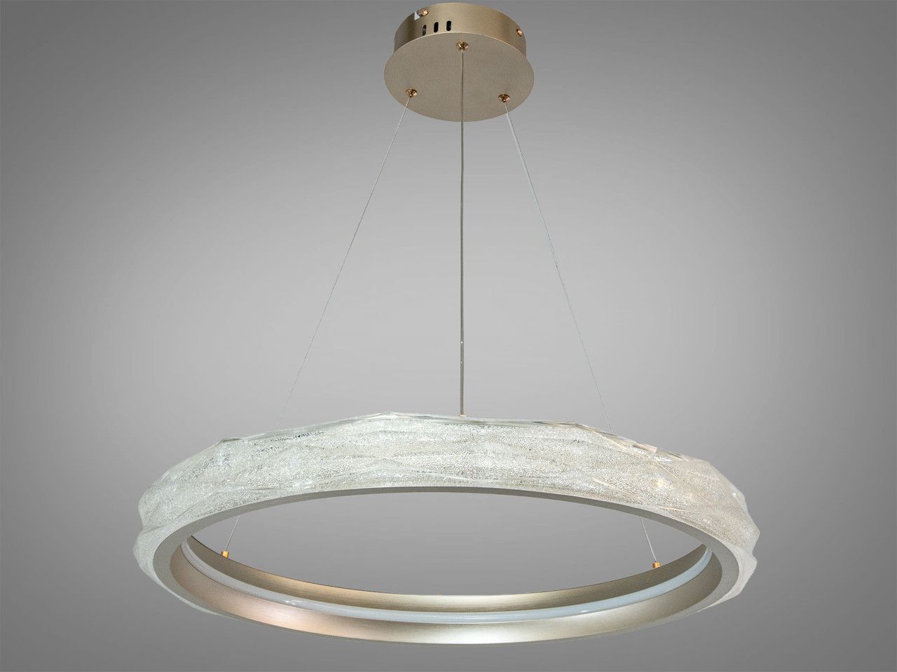 Підвісний світлодіодний прилад у формі одиночного кільця з дистанційним керуванням. Модель розроблена для основного освітлення холів, передпокоїв, віталень та інших житлових зон площею до 20–25 м². Конструкція поєднує металевий каркас та акриловий розсіювач із кристалічною фактурою.