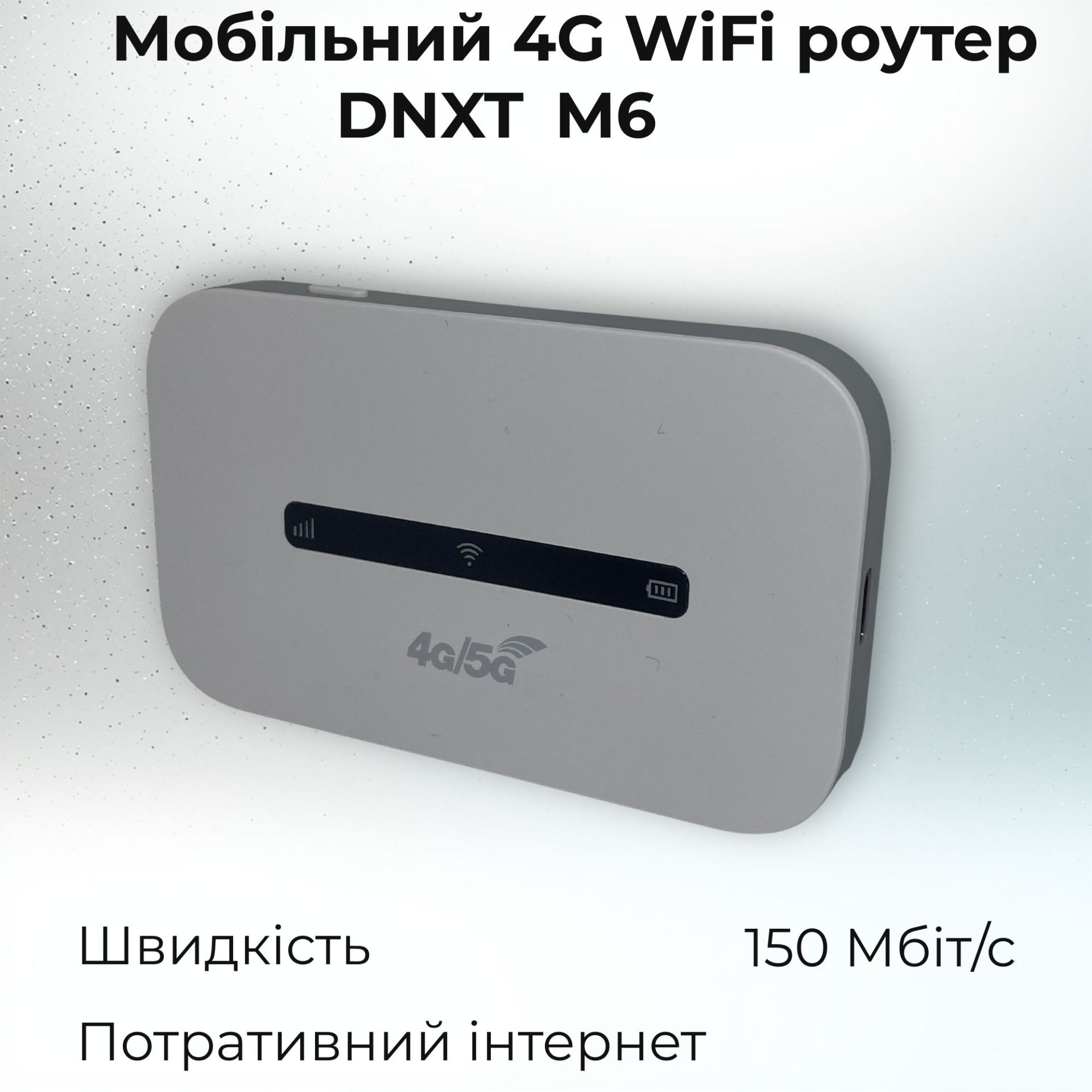 Мобільний Wi-Fi роутер DNXT M6 — це компактний портативний пристрій для доступу до інтернету через SIM-картку мобільного оператора. Роутер створює стабільну Wi‑Fi-мережу та дозволяє підключити до 10 пристроїв одночасно: смартфони, ноутбуки, планшети та інші гаджети.