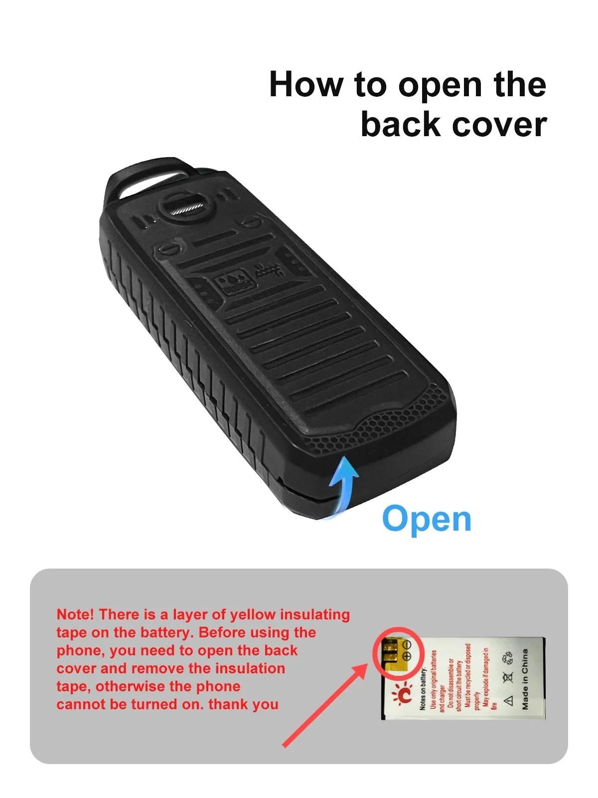 - На акумуляторі мобільного телефону є шар ізоляційної стрічки. Перед використанням телефону відкрийте задню кришку та зніміть ізоляційну стрічку.