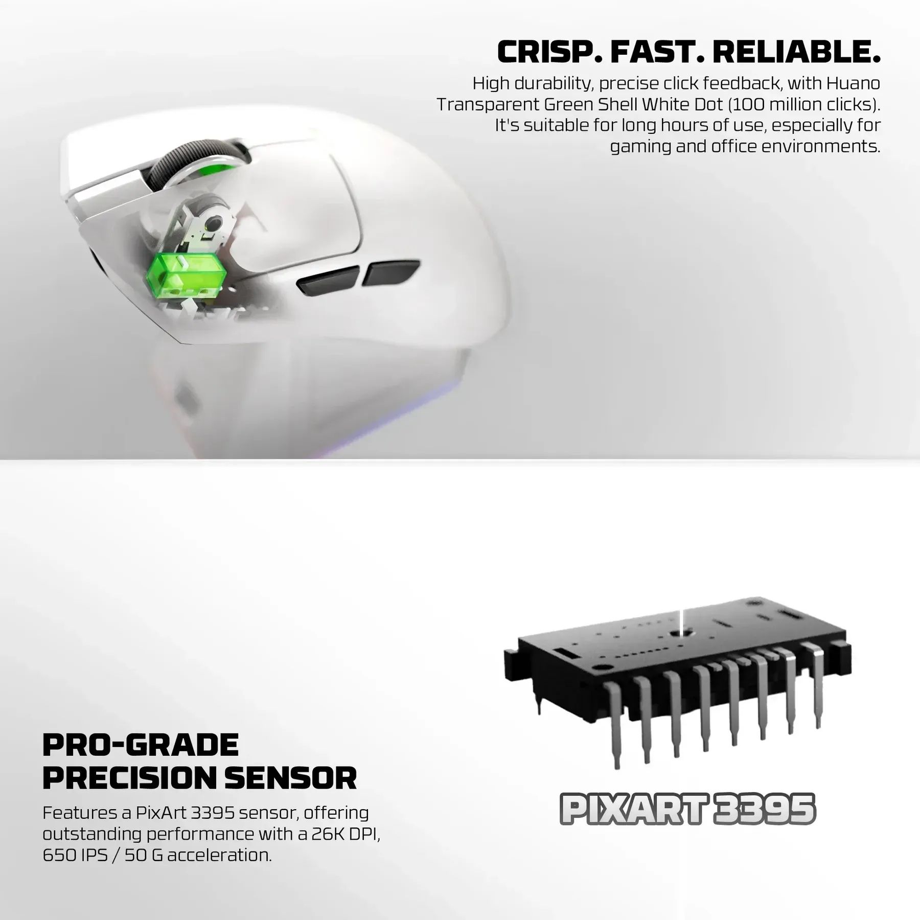 - Основні кнопки оснащені перемикачами Huano Transparent Green Shell White Dot, які розраховані приблизно на 100 мільйонів натискань. Вони забезпечують чіткий і швидкий відгук кожного кліку.