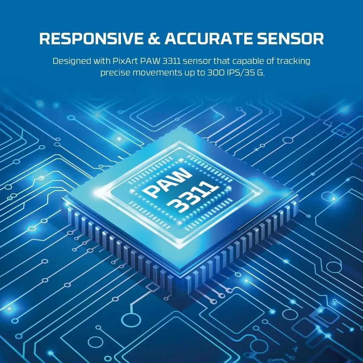 - Сенсор PixArt 3311 забезпечує точне та швидке відстеження рухів – від 400 до 12000 DPI.