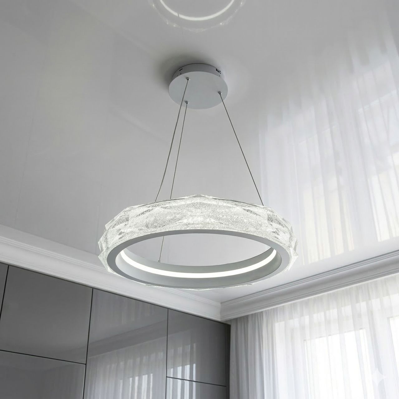 Підвісний світлодіодний прилад у формі одиночного кільця з дистанційним керуванням. Модель розроблена для основного освітлення спалень, невеликих віталень та житлових зон площею до 10-15 м². Конструкція поєднує металевий каркас та акриловий розсіювач із кристалічною фактурою.