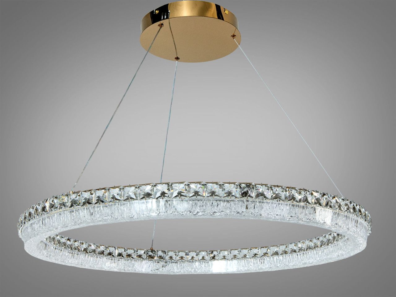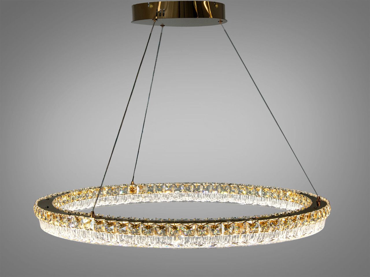 Дизайн люстри базується на ідеальній геометрії кола діаметром 82 см. Металевий каркас вкритий преміальною золотою гальванікою з дзеркальним блиском. Головною особливістю є масивний акриловий розсіювач із внутрішньою кристалічною фактурою (ефект «колотого льоду»). При увімкненні світло багаторазово заломлюється у гранях, створюючи ілюзію розсипу мільйонів діамантів у золотому обрамленні. Система тросових підвісів дозволяє регулювати висоту від 45 до 115 см.