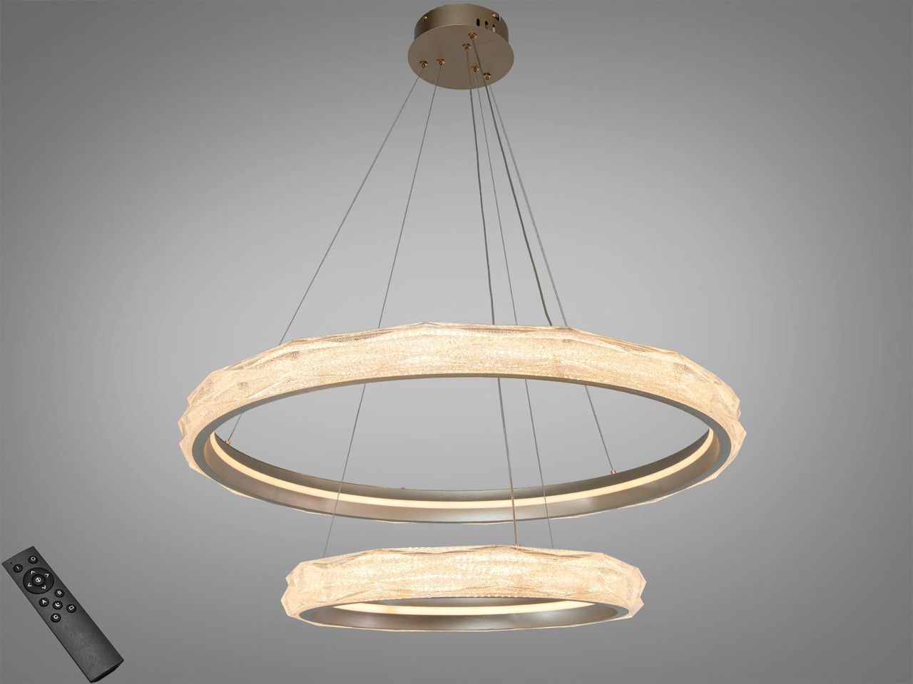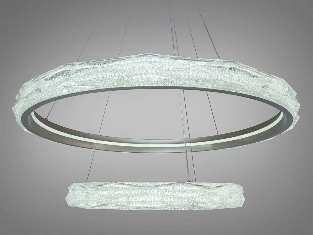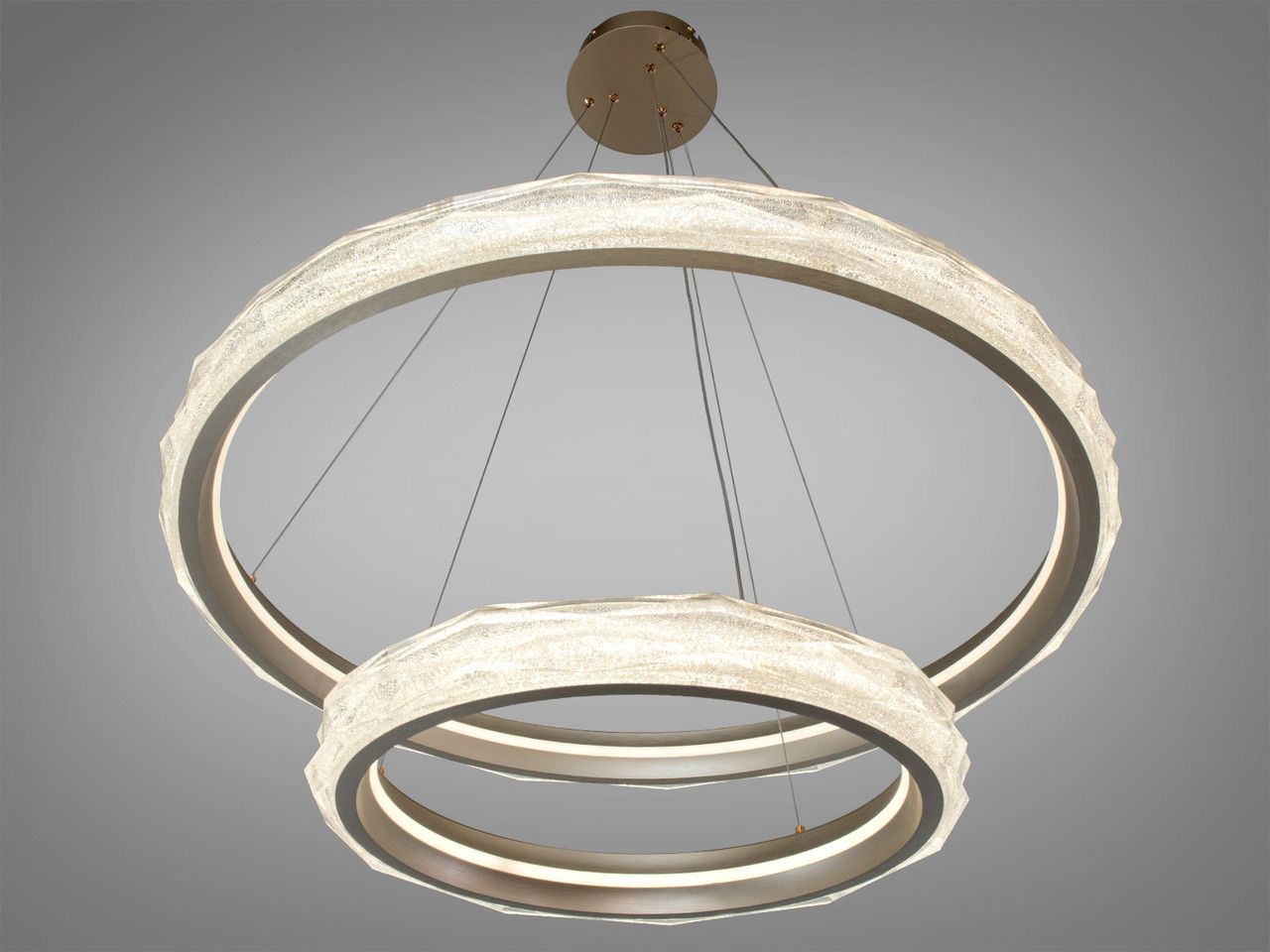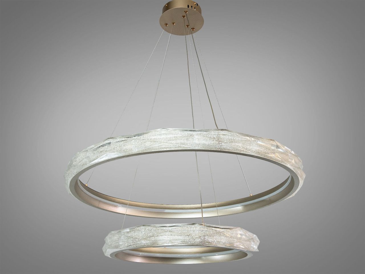 Дизайн люстри побудований на дворівневій композиції концентричних кіл діаметром 80 см та 50 см. Металевий каркас має преміальне золотаве покриття, що додає інтер'єру теплоти та розкоші. Головною особливістю є масивні акрилові розсіювачі з внутрішньою кристалічною фактурою (ефект «колотого льоду»). При увімкненні світлодіодної стрічки світло багаторазово заломлюється у гранях акрилу, створюючи ілюзію розсипу мільйонів діамантів у золотому обрамленні. Система тросових підвісів дозволяє регулювати висоту кожного кільця окремо, що дає змогу створювати каскадні або паралельні світлові сценарії.