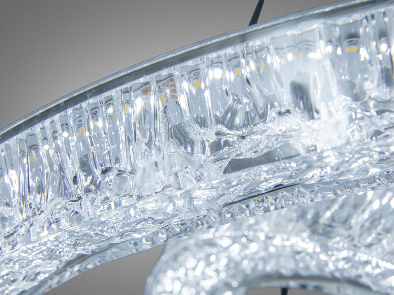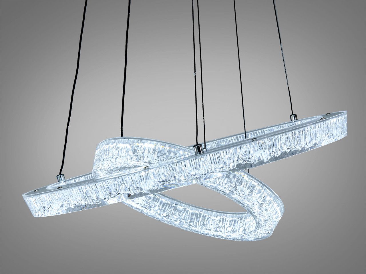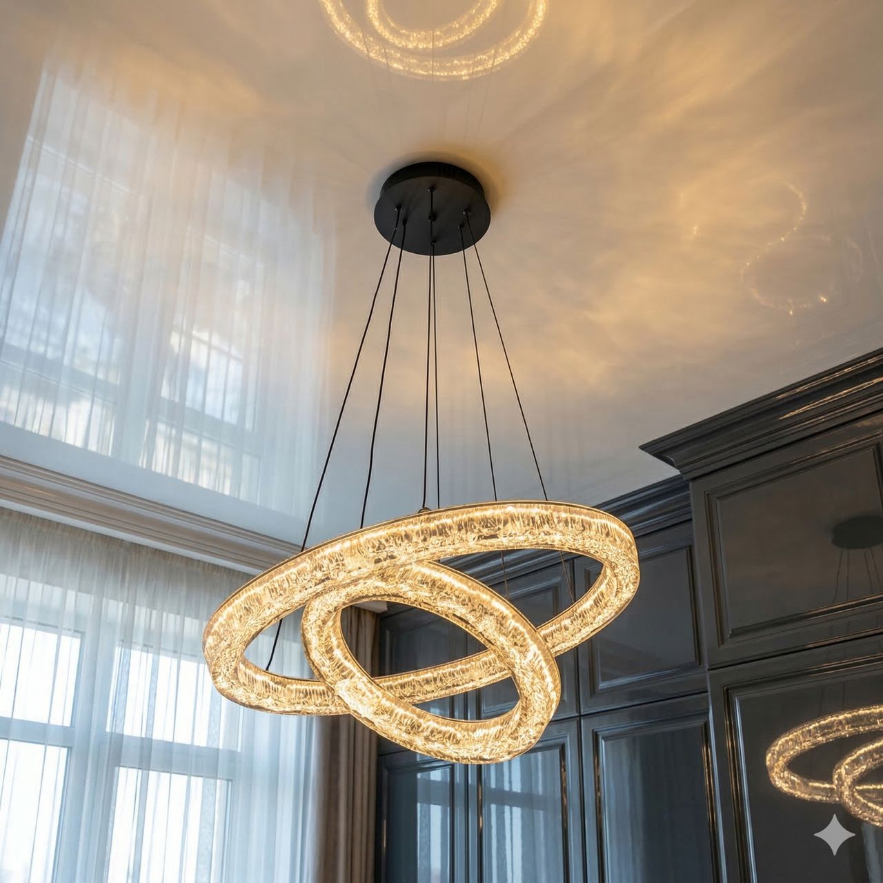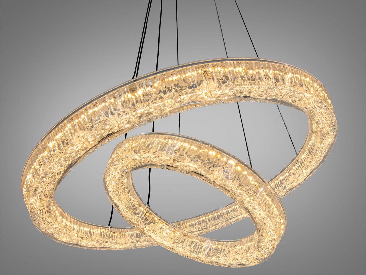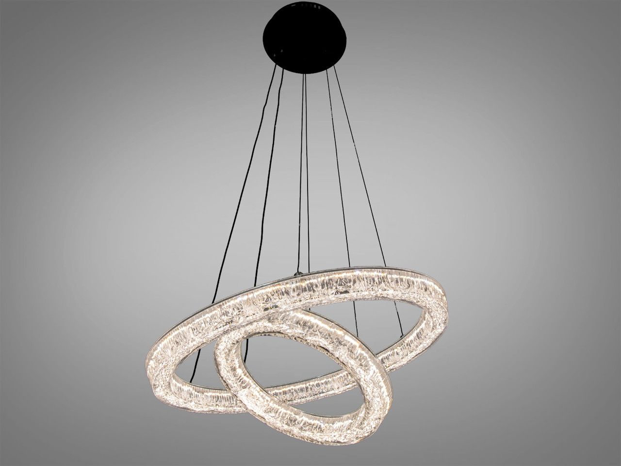 Дизайн люстри базується на поєднанні двох незалежних світлових кілець діаметром 50 см та 30 см. Металевий каркас вкритий якісним чорним гальванічним покриттям, що створює чіткий архітектурний силует на фоні стелі. Головною особливістю є розсіювачі з акрилу з внутрішньою кристалічною фактурою (ефект «колотого льоду»). При увімкненні світлодіодної стрічки промені багаторазово заломлюються у гранях акрилу, створюючи іскристе сяйво. Система підвісів дозволяє регулювати висоту кожного кільця окремо, що дає змогу створювати каскадні, паралельні або переплетені світлові сценарії.