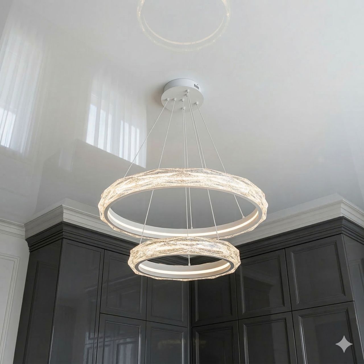 Дизайн люстри базується на дворівневій композиції концентричних кіл діаметром 60 см та 40 см. Металевий каркас вкритий якісною білою матовою емаллю, що дозволяє конструкції практично «розчинитися» на фоні світлої стелі, залишаючи акцент лише на світлових лініях. Головною особливістю є масивні акрилові розсіювачі з внутрішньою кристалічною фактурою (ефект «колотого льоду»). При увімкненні світлодіодної стрічки промені багаторазово заломлюються у гранях акрилу, створюючи ілюзію розсипу іскристих діамантів. Система підвісів дозволяє регулювати висоту кожного кільця окремо, що дає змогу створювати каскадні або паралельні світлові сценарії.