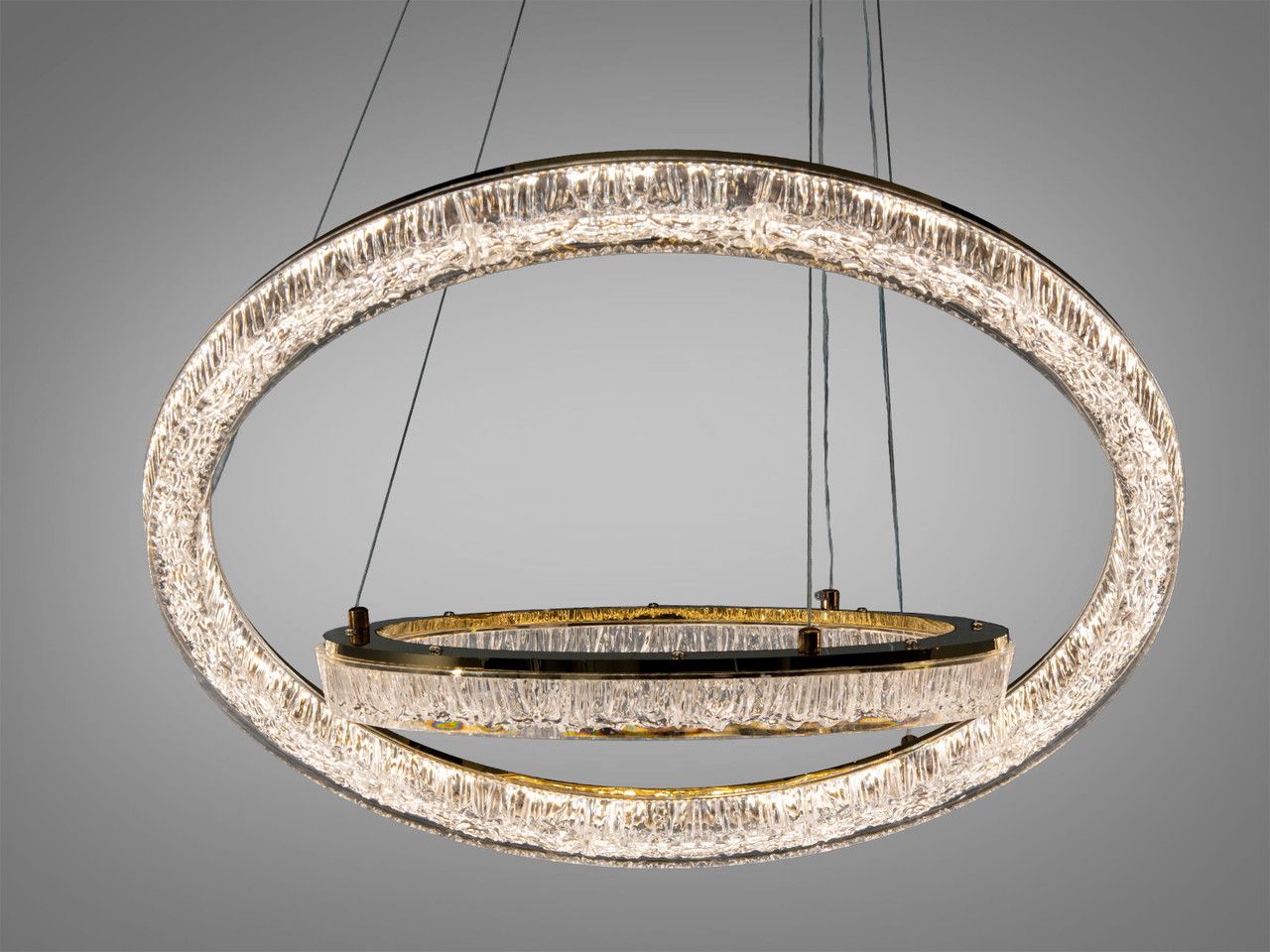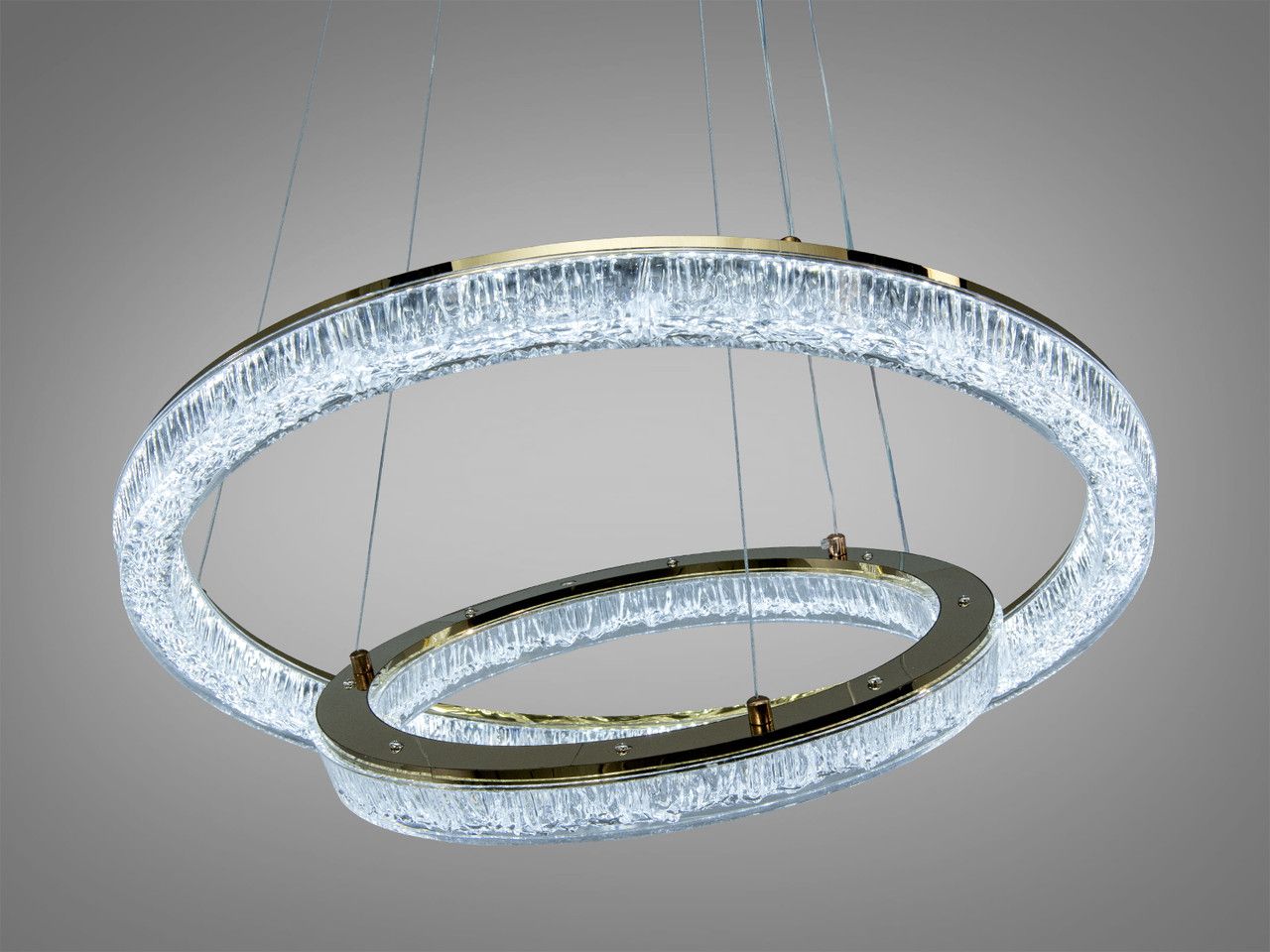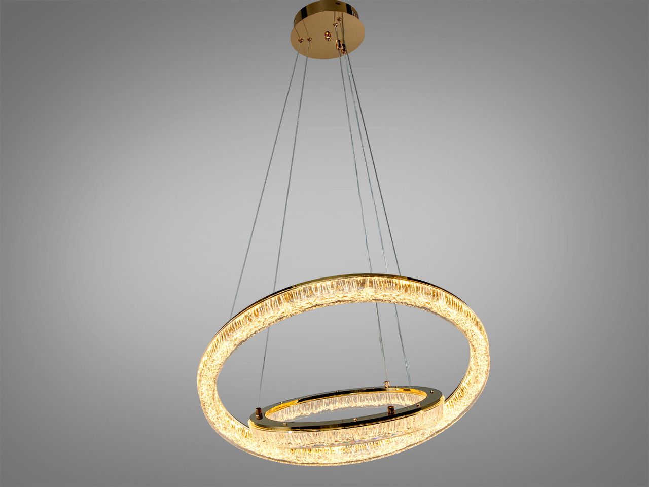 Дизайн люстри побудований на дворівневій композиції концентричних кіл діаметром 60 см та 40 см. Металевий каркас вкритий преміальною золотою гальванікою, яка створює бездоганний дзеркальний відблиск, додаючи інтер'єру теплоти та розкоші. Головною особливістю є масивні акрилові розсіювачі з внутрішньою кристалічною фактурою (ефект «колотого льоду»). При увімкненні світлодіодної стрічки промені багаторазово заломлюються у гранях акрилу, створюючи ілюзію розсипу іскристих діамантів у золотому обрамленні. Система підвісів дозволяє регулювати висоту кожного кільця окремо.