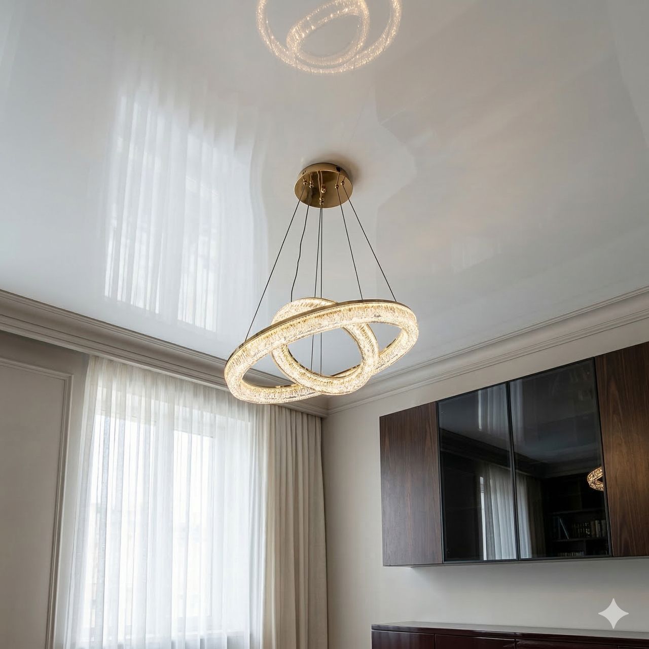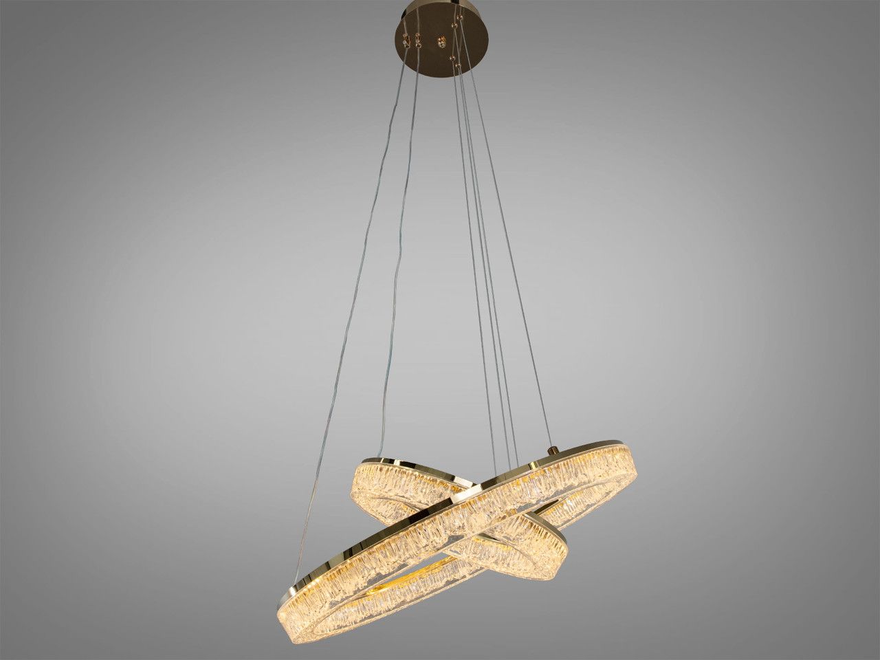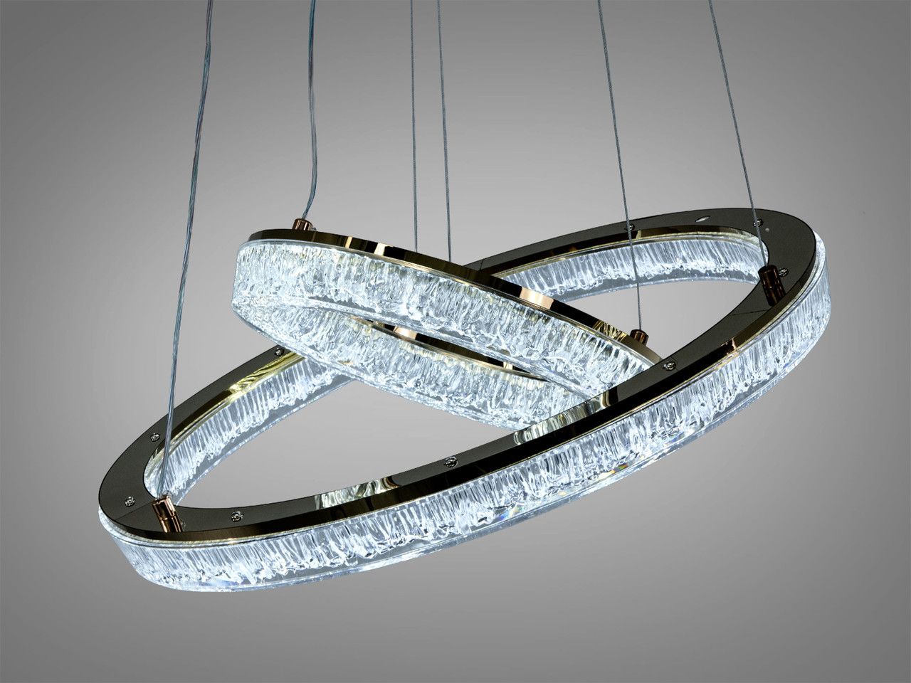 Дизайн люстри побудований на поєднанні двох незалежних світлових контурів діаметром 50 см та 30 см. Металевий каркас вкритий преміальною золотою гальванікою, яка створює бездоганний дзеркальний відблиск. Головною особливістю є масивні акрилові розсіювачі з внутрішньою кристалічною фактурою (ефект «колотого льоду»). При увімкненні світлодіодної стрічки промені багаторазово заломлюються у гранях акрилу, створюючи ілюзію розсипу діамантів у золотому обрамленні. Система підвісів дозволяє регулювати висоту кожного кільця окремо, що дає змогу створювати каскадні або переплетені композиції.