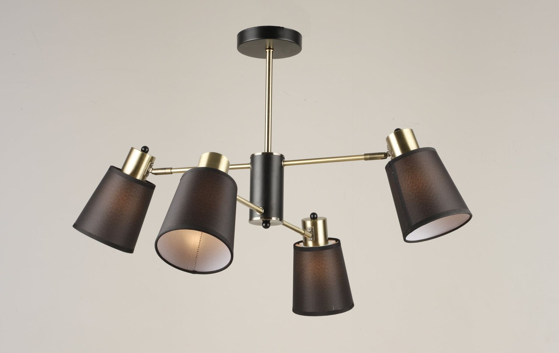 Тканинні плафони м'яко розсіюють світло, створюючи затишну та теплу атмосферу, притаманну стилям неокласика, арт-деко або модерн. Завдяки металевому каркасу конструкція відрізняється надійністю, а чотири джерела світла забезпечують достатній рівень освітленості для вітальні, спальні або кабінету.