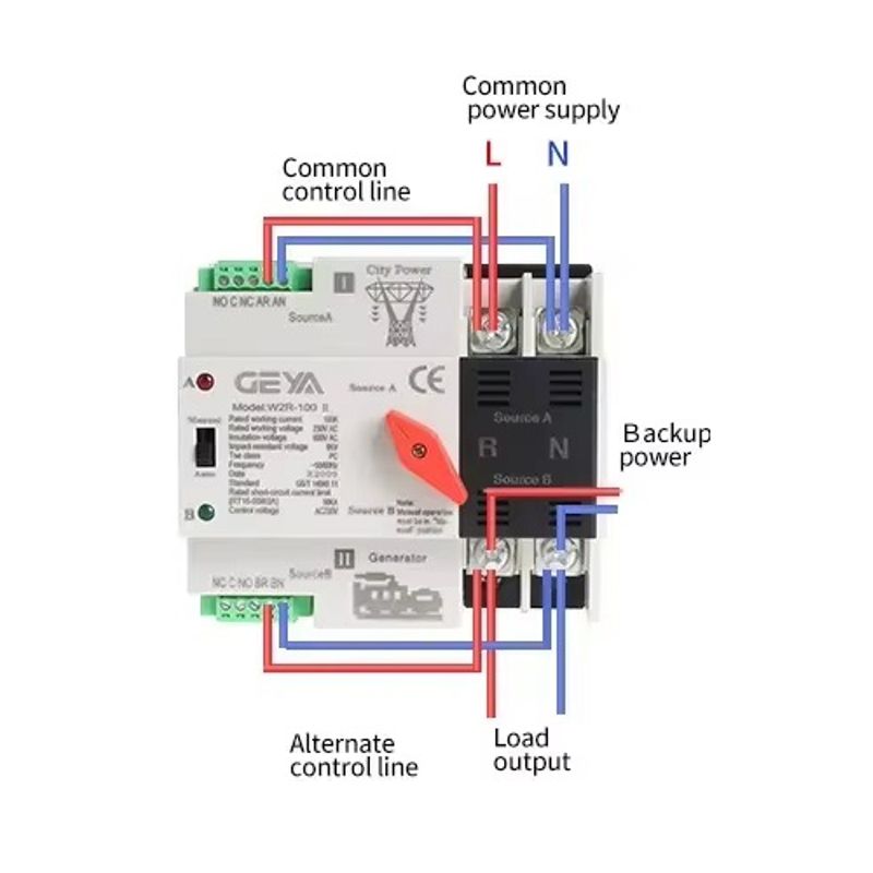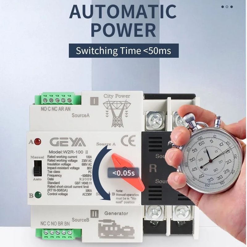 Автомат введення резерву (АВР) GEYA W2R-2P 100А 2 полюсний 1 фаза + нуль – це автоматичний перемикач між основною мережею електроживлення і резервною (інвертор, генератор, ecoflow і т.д.). Це надійний автомат введення резерву, шириною 10,75 см, займає 6,5 модулів та монтується на стандартну DIN рейку.