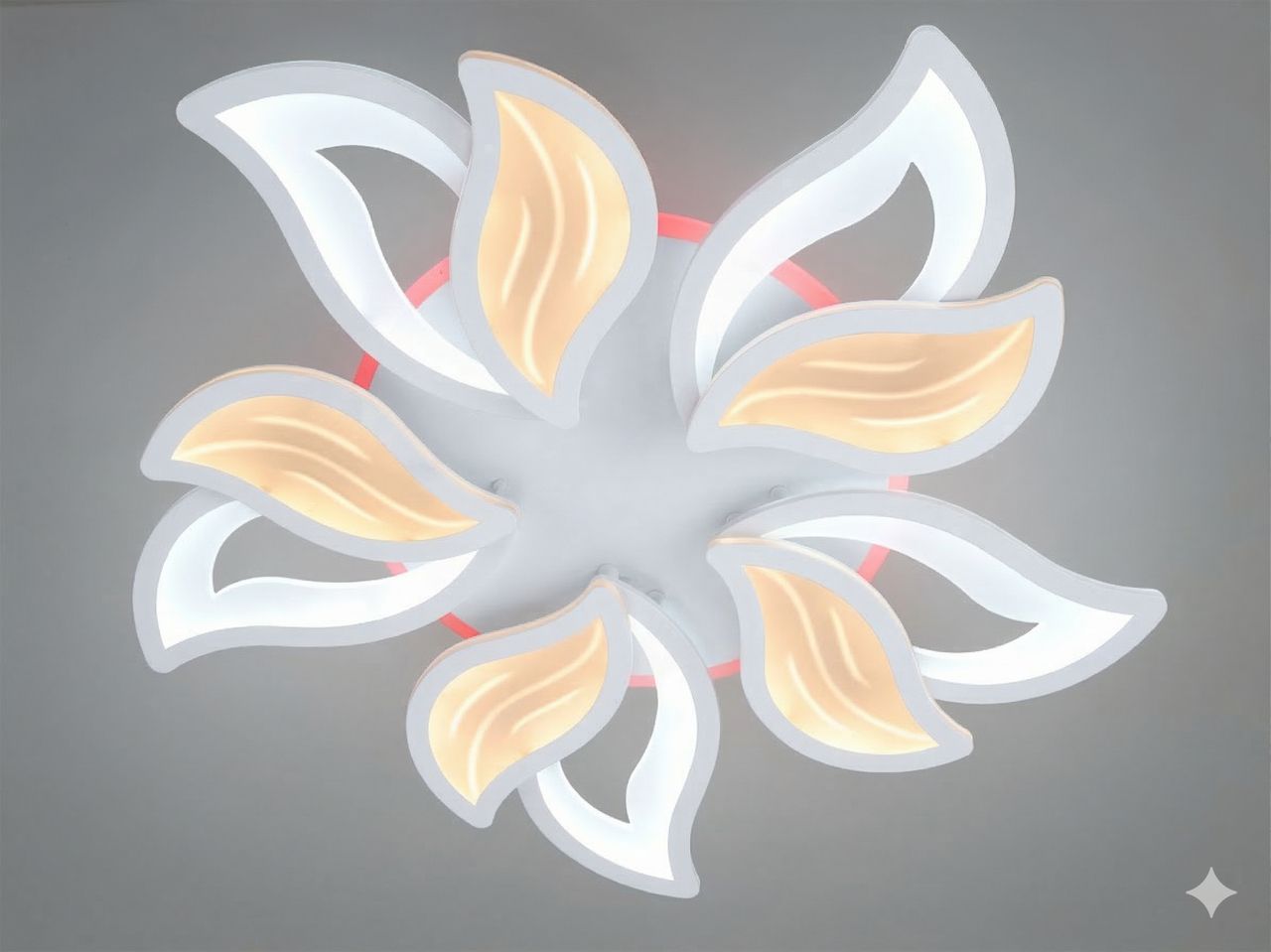 Джерелом світла у люстрі є світлодіодна стрічка, прокладена всередині кожної пелюстки. Це створює суцільну світлову лінію без видимих точок. Металевий каркас вкритий якісною білою матовою фарбою, що робить виріб візуально легким на фоні стелі. Розсіювачі виготовлені з травмобезпечного акрилу, який м'яко заломлює промені. В основу вбудовано додатковий LED-контур для декоративної підсвітки стелі, що працює у трьох кольорах (синій, червоний, бузковий), перетворюючи люстру на ідеальний нічник для дитини.