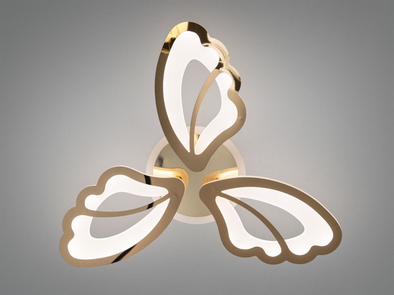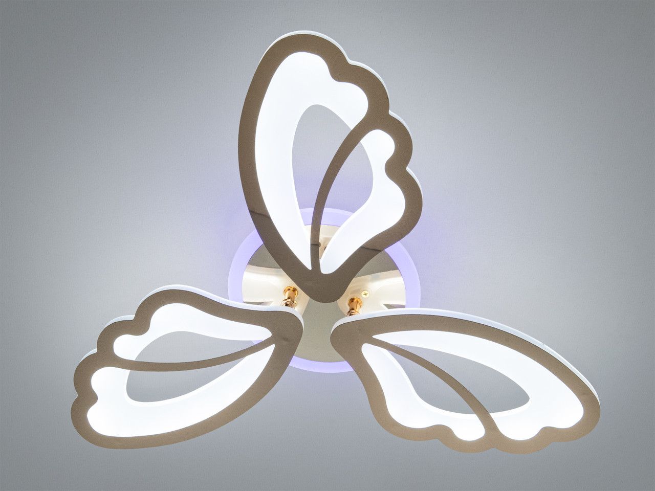 Джерелом світла у люстрі є світлодіодна стрічка, прокладена всередині кожної з 3 пелюсток. Це створює суцільну світлову лінію без видимих крапок. Металевий каркас вкритий якісною золотою гальванікою з дзеркальним блиском, стійкою до вицвітання. Матові акрилові розсіювачі забезпечують м'яке випромінювання без ефекту засліплення. В основу вбудовано додатковий LED-контур для декоративної підсвітки стелі, що працює у трьох кольорах (синій, червоний, бузковий).