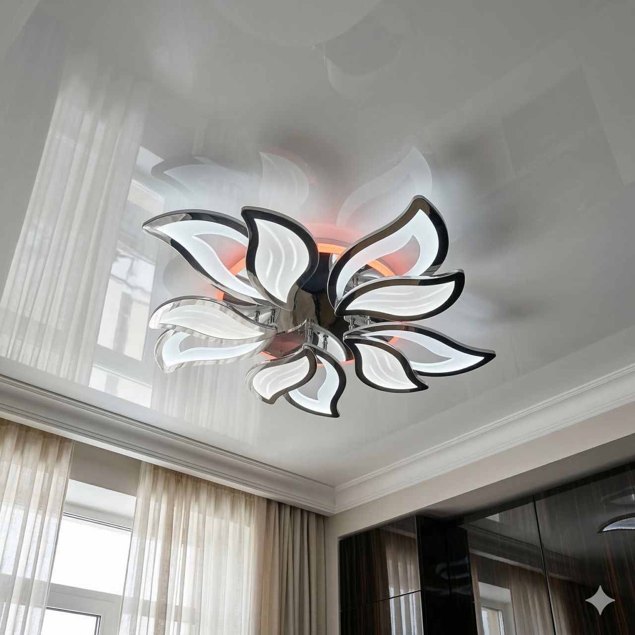 Джерелом світла у люстрі є світлодіодна стрічка, прокладена всередині кожної з 5 пелюсток. Це створює суцільну світлову лінію без видимих точок. Металевий каркас має преміальне хромоване покриття (гальваніка) з дзеркальним блиском, що візуально додає простору легкості. Матові акрилові розсіювачі забезпечують м'яке випромінювання без ефекту засліплення. В основу вбудовано додатковий LED-контур для декоративної підсвітки стелі, що працює у трьох кольорах (синій, червоний, бузковий).
