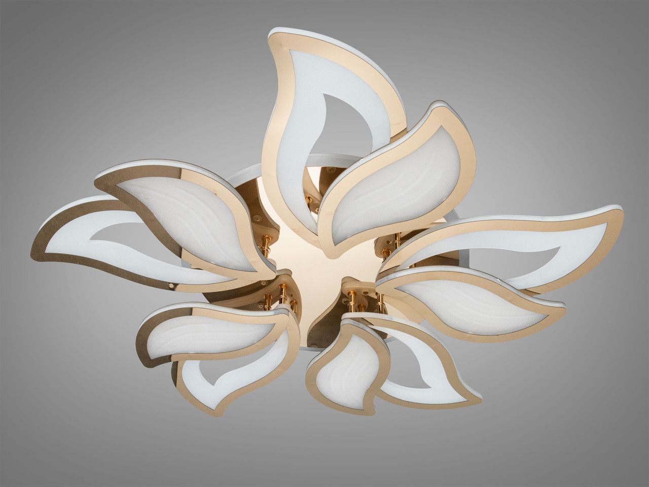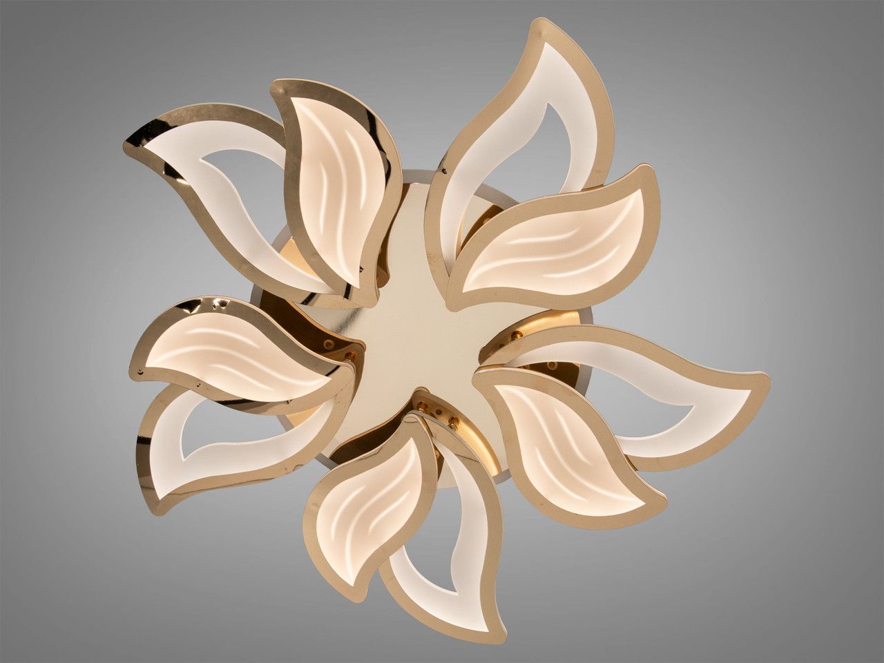Джерелом світла у люстрі є світлодіодна стрічка, прокладена всередині кожної з 9 пелюсток. Це створює суцільну світлову лінію без видимих точок. Металевий каркас має преміальне золоте гальванічне покриття з дзеркальним блиском. Розсіювачі виготовлені з акрилу з внутрішньою кристалічною фактурою, яка заломлює промені та створює ефект іскристого кришталю. В основу вбудовано додатковий LED-контур для декоративної підсвітки стелі, що працює у трьох кольорах (синій, червоний, бузковий).