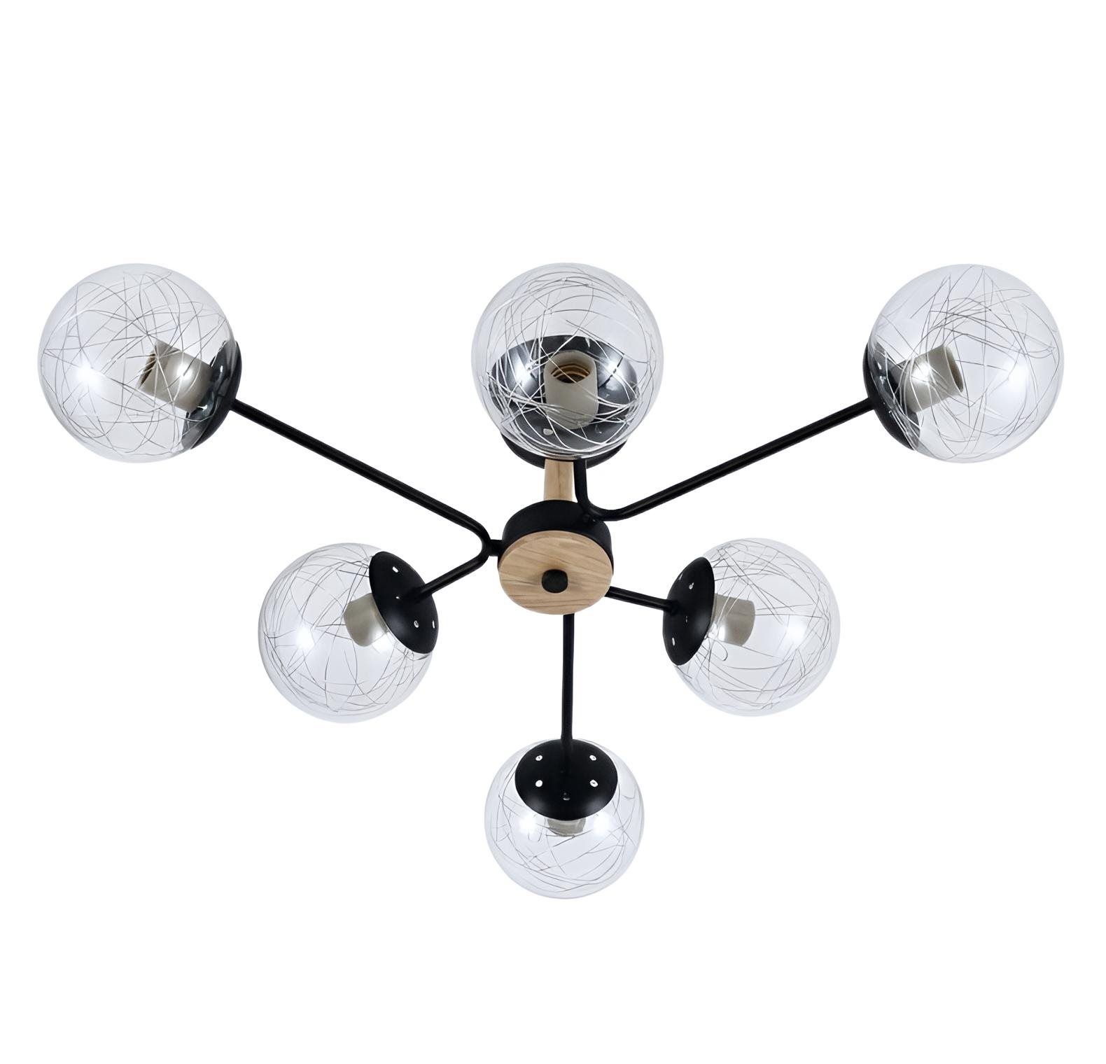 Велика стельова люстра від бренду VALESO на шість плафонів — це ідеальне рішення для створення основного освітлення у просторих приміщеннях. Модель виконана в універсальному чорному кольорі, що робить її виразним елементом інтер'єру в стилі лофт, модерн або сучасна класика. Поєднання міцного металевого каркаса та скляних плафонів забезпечує надійність конструкції та рівномірне розсіювання світла.