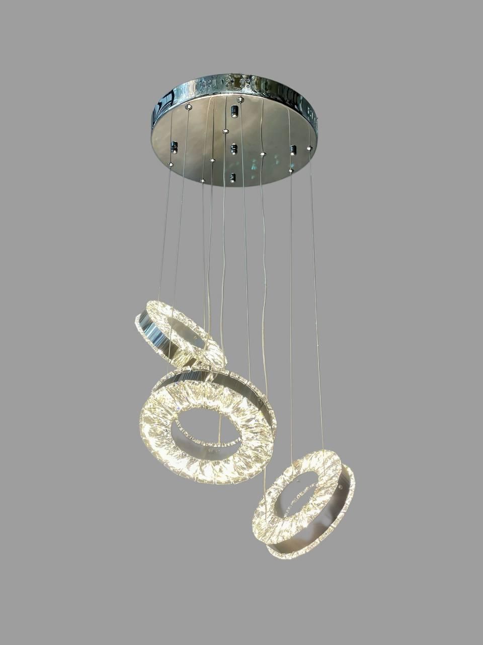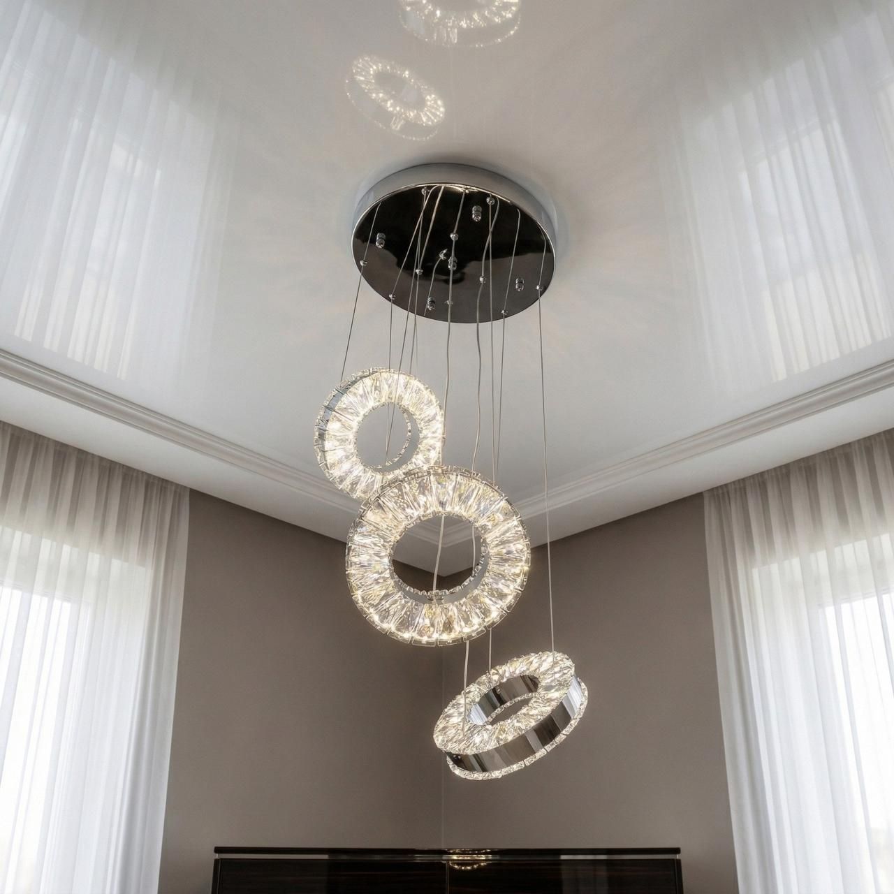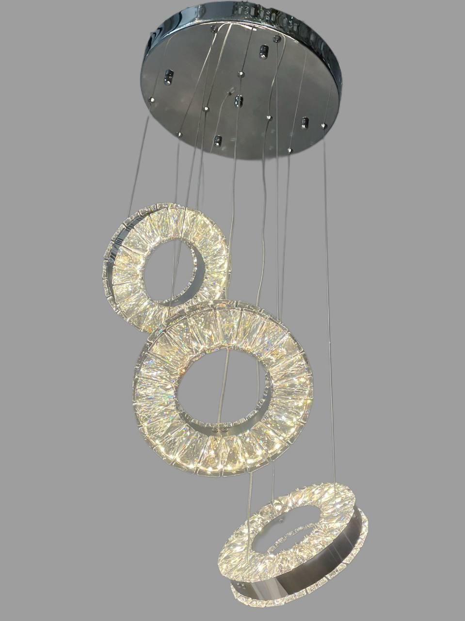 Елегантна LED люстра з кристалічними підвісками у формі кільця – стильне рішення для акцентного освітлення. Завдяки вбудованому драйверу, ви можете вибрати потрібну колірну температуру (3000K/4000K/6000K), а сам корпус чудово вписується в сучасні інтер'єри від хай-теку до ар-деко. Використовується у житлових та комерційних зонах Києва, Харкова, Львова.