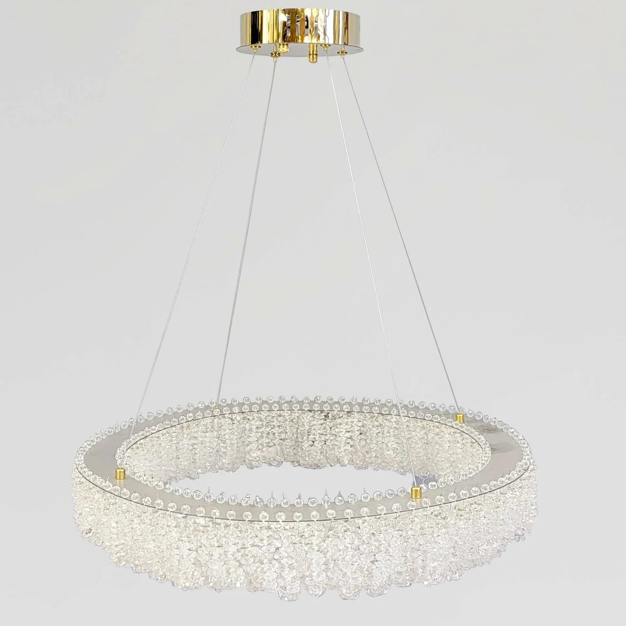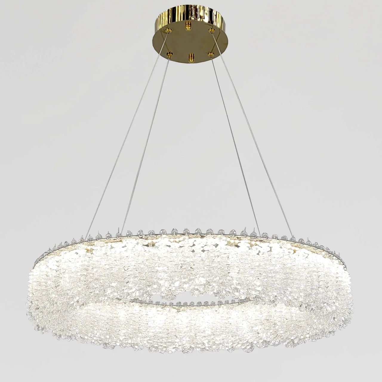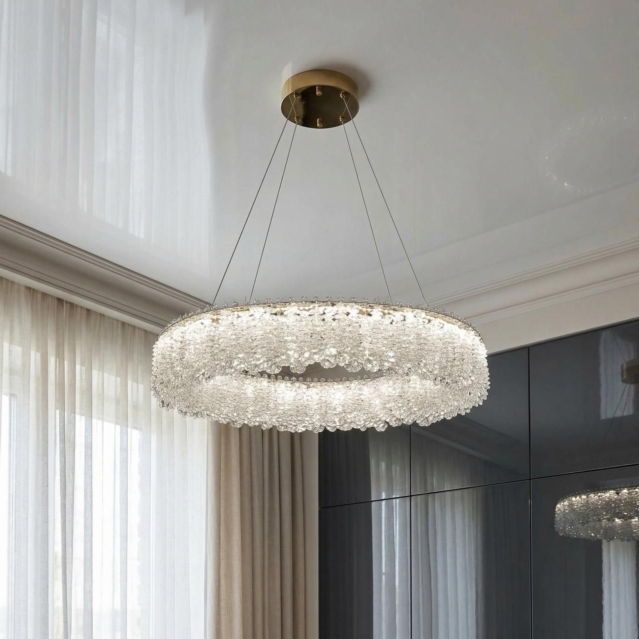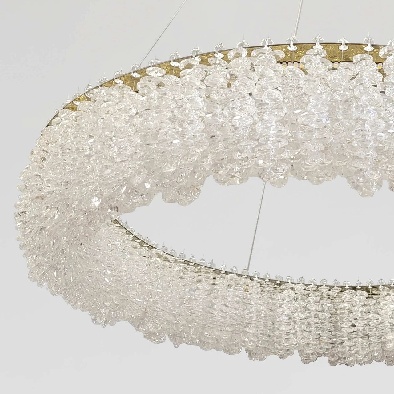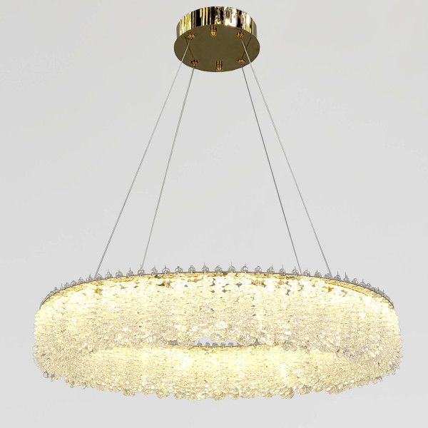Хочете додати інтер'єру витонченого блиску та сучасного лиску? Люстра "Relief Crystal Halo" - це ефектне поєднання дзеркального золота та щільного масиву кришталевих кристалів. Вона створює магічну гру заломлень, перетворюючи звичайне освітлення на ювелірну прикрасу вашого будинку.