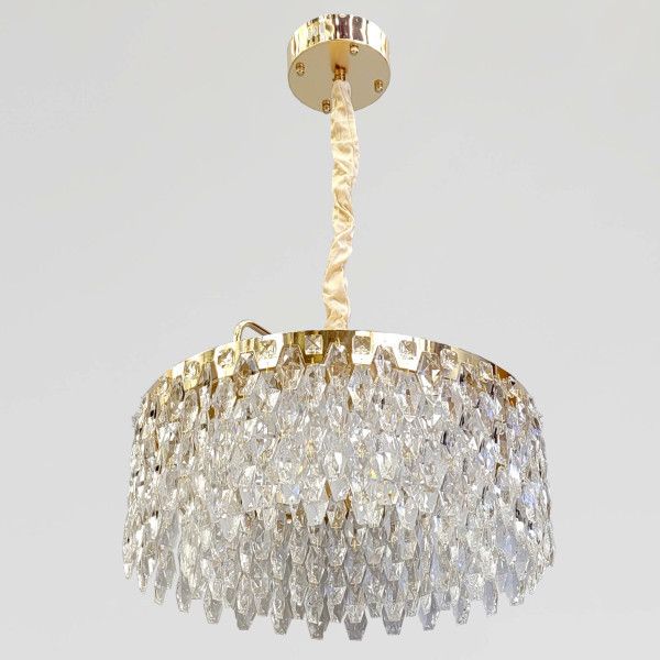 Дизайн моделі базується на класичній формі «барабана», адаптованій під сучасний стиль. Золотиста металева основа слугує надійною оправою для багаторівневого каскаду прозорого скла. Завдяки високій щільності декору, світло вбудованих LED-модулів м'яко розсіюється, створюючи ефект діамантового сяйва.