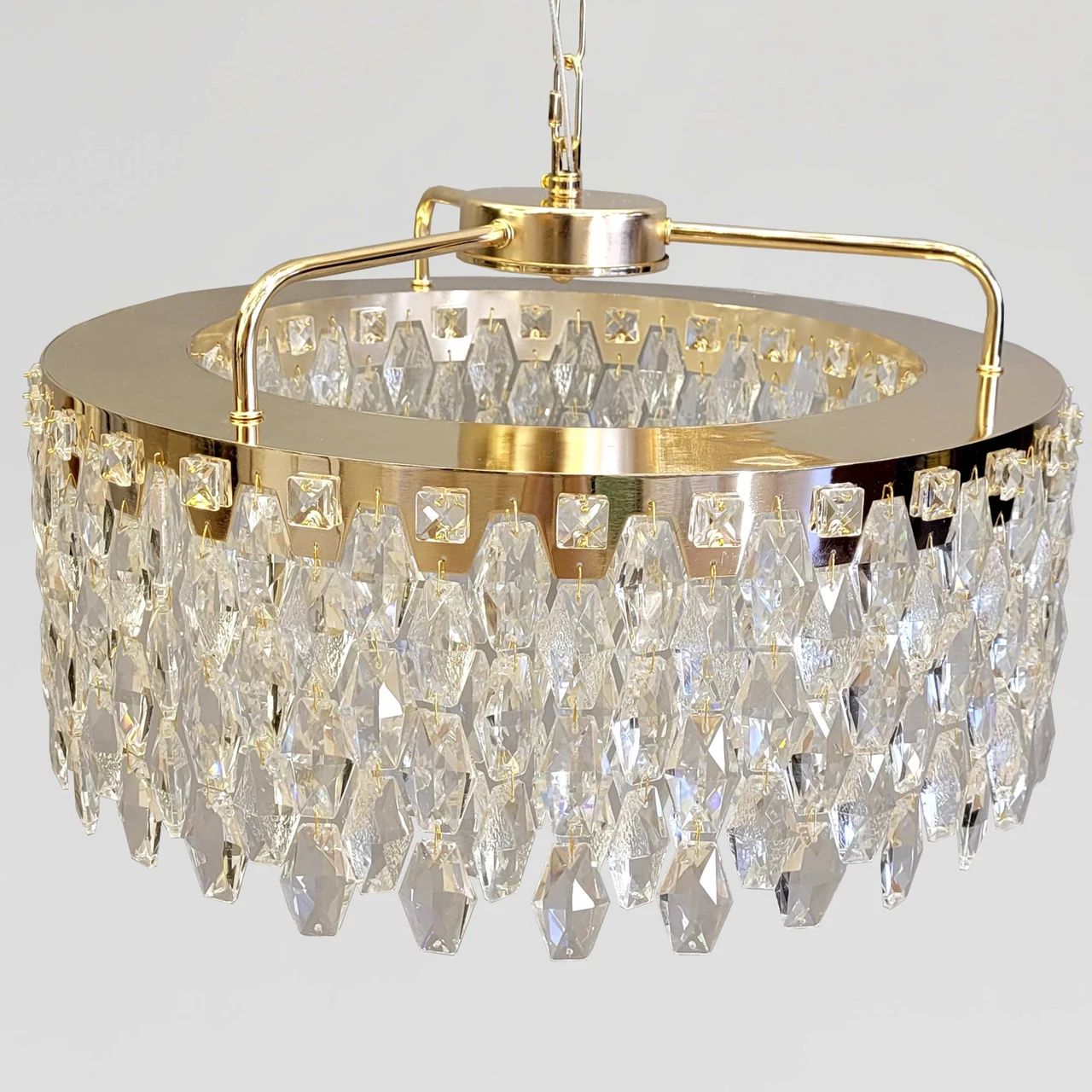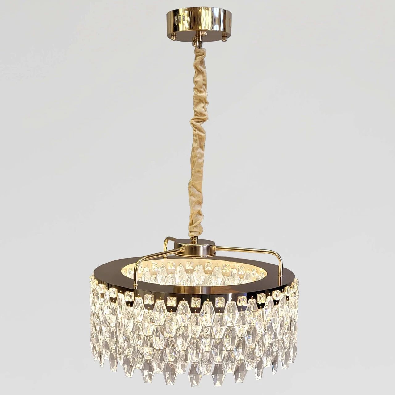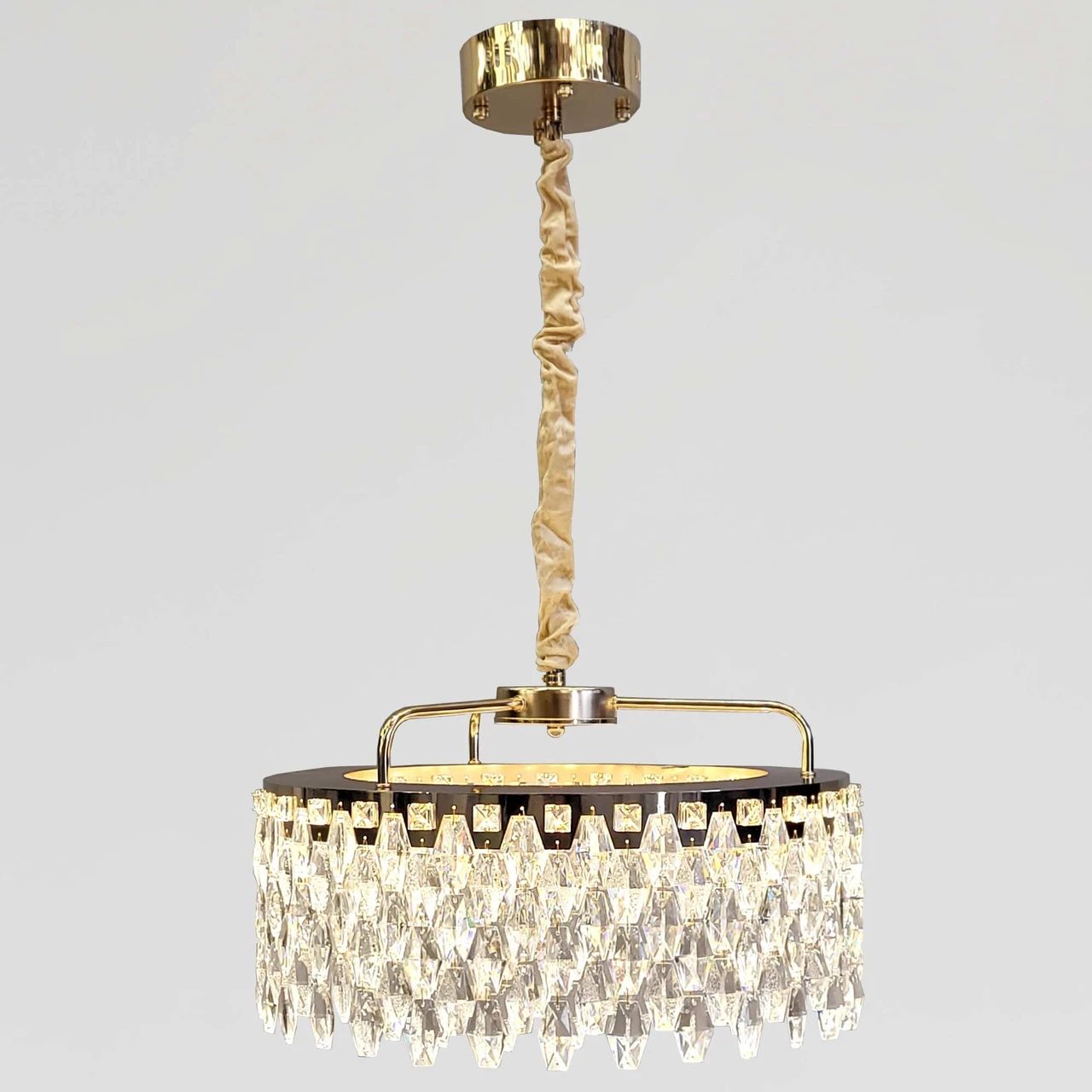 Бажаєте наповнити інтер'єр шляхетним блиском та сучасним затишком? Ця люстра — вишукана світлова інсталяція, де дзеркальне золото поєднується з щільним масивом кришталевих граней. Вона створює магічну гру заломлень, перетворюючи простір на розкішну залу, сповнену іскристих відблисків.