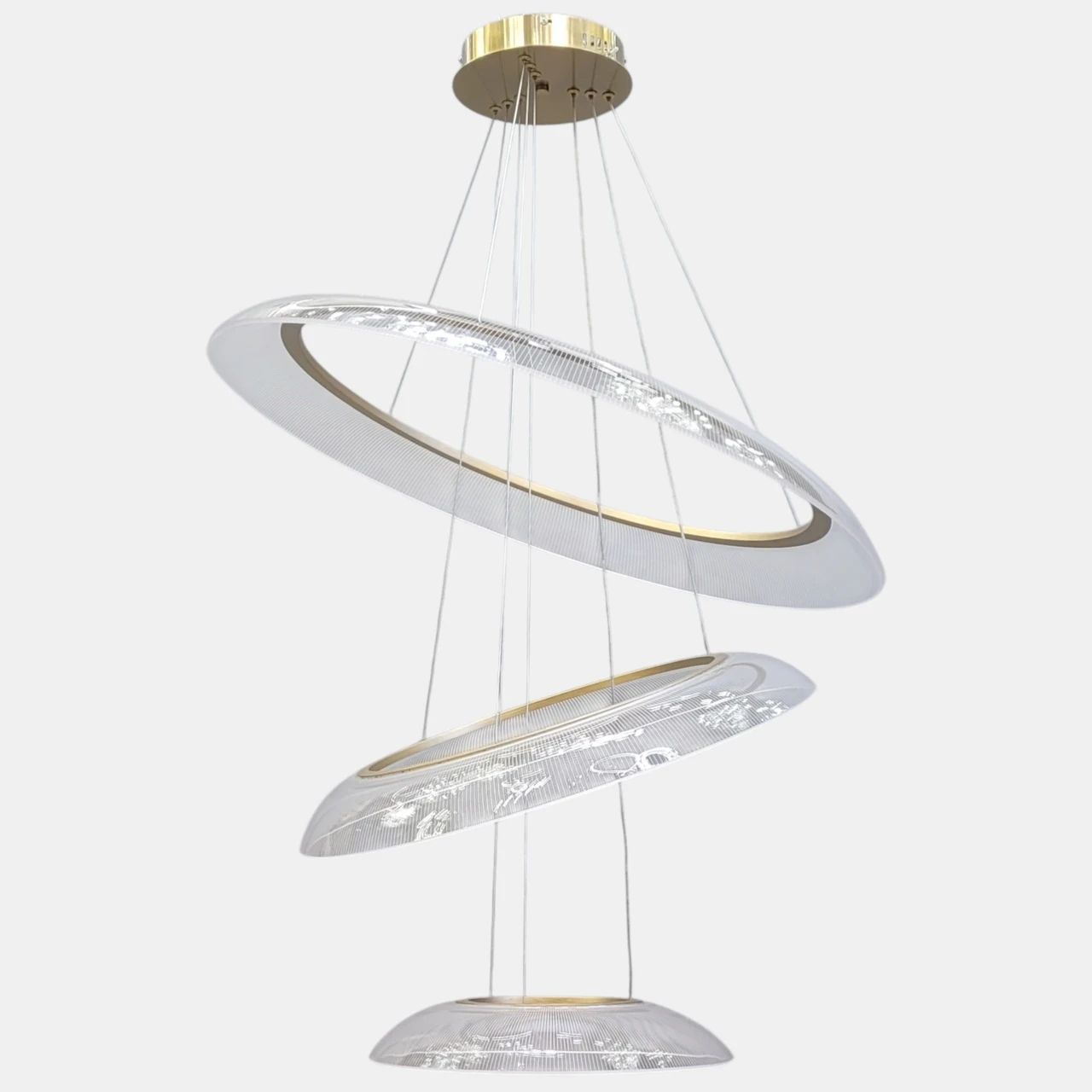Бажаєте наповнити дім сонячним сяйвом та сучасною розкошшю? Люстра "Triple Cascade Gold" — це велична композиція з трьох сяючих кілець, що поєднує в собі шляхетний блиск золотого сатину та кришталеву прозорість акрилу. Вона створює ефект невагомої світлової скульптури, додаючи інтер'єру статусності та об'єму.