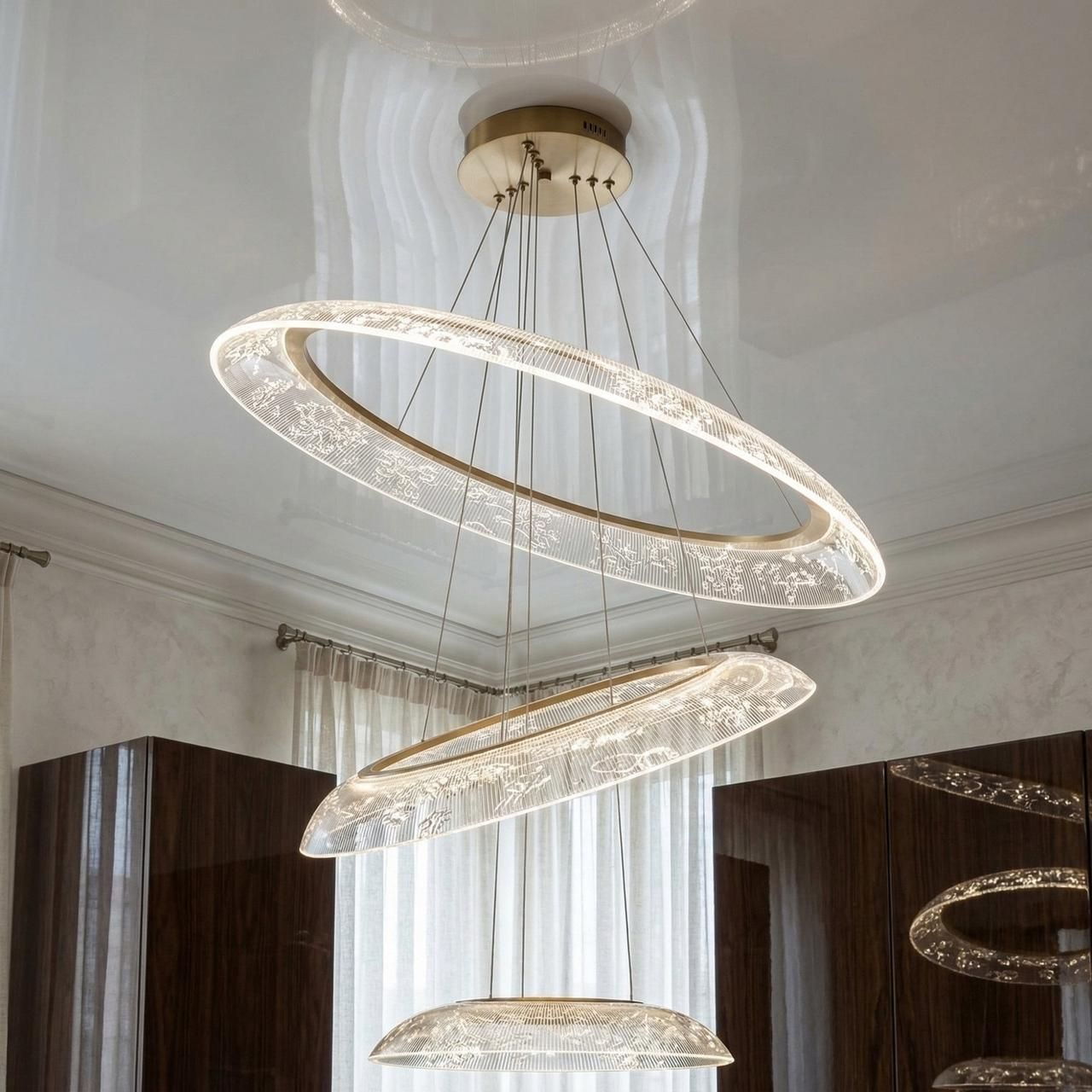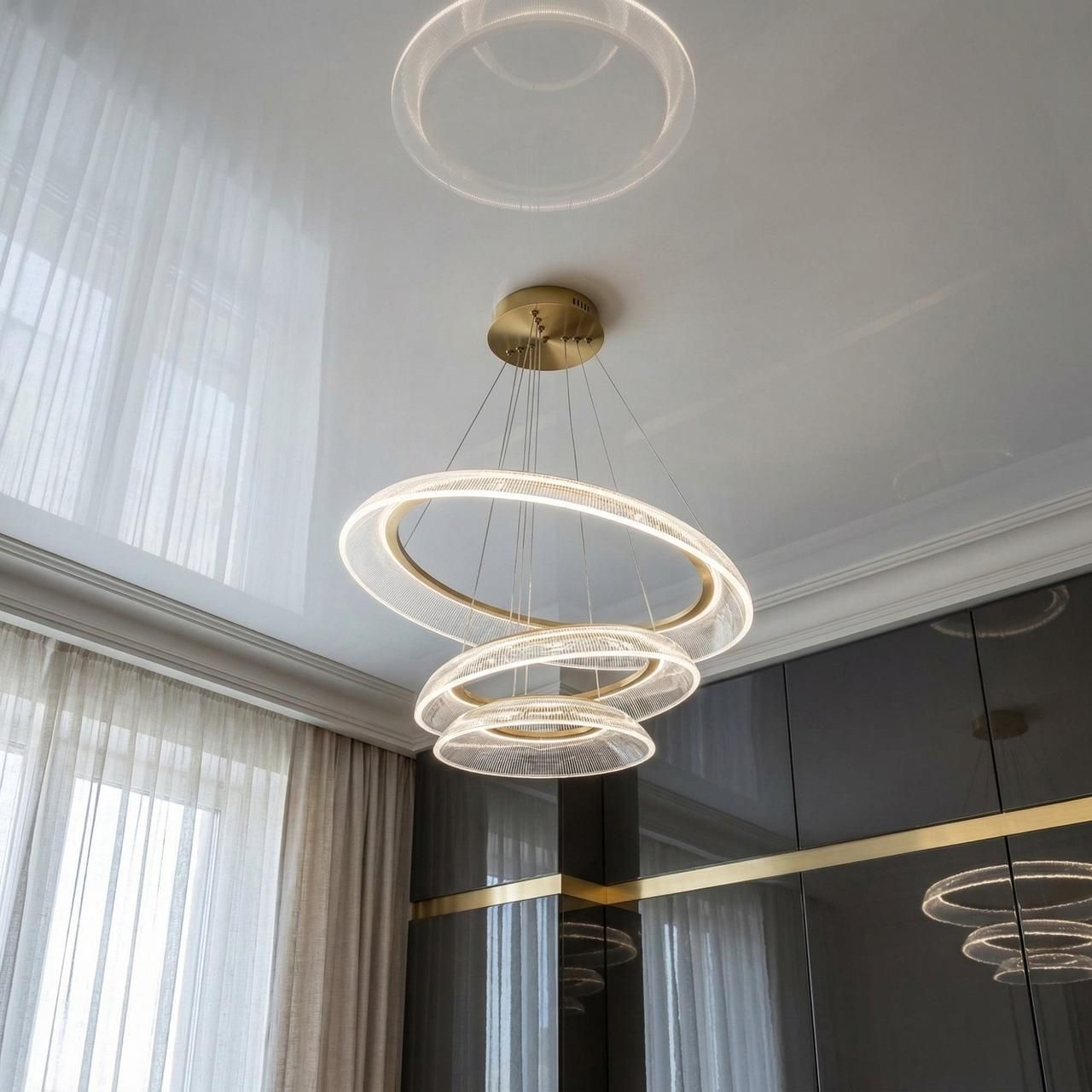 Каскадний вау-ефект: Завдяки значному діаметру найбільшого кільця (75.0 см) та багаторівневій структурі, люстра виглядає масштабно і стає центральним елементом декору.