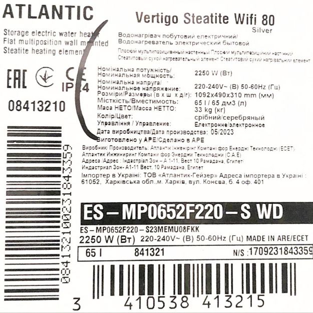 Бойлер 65 літрів Atlantic Vertigo Steatite з Wi-Fi 80 ES-MP0652 F220-S WD 2250W (сріблястий)