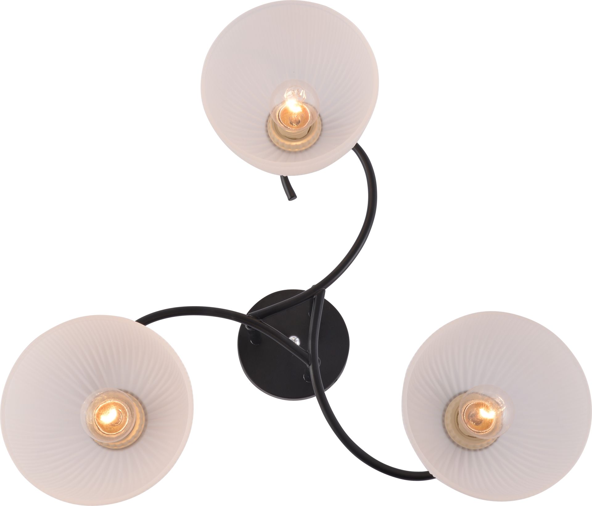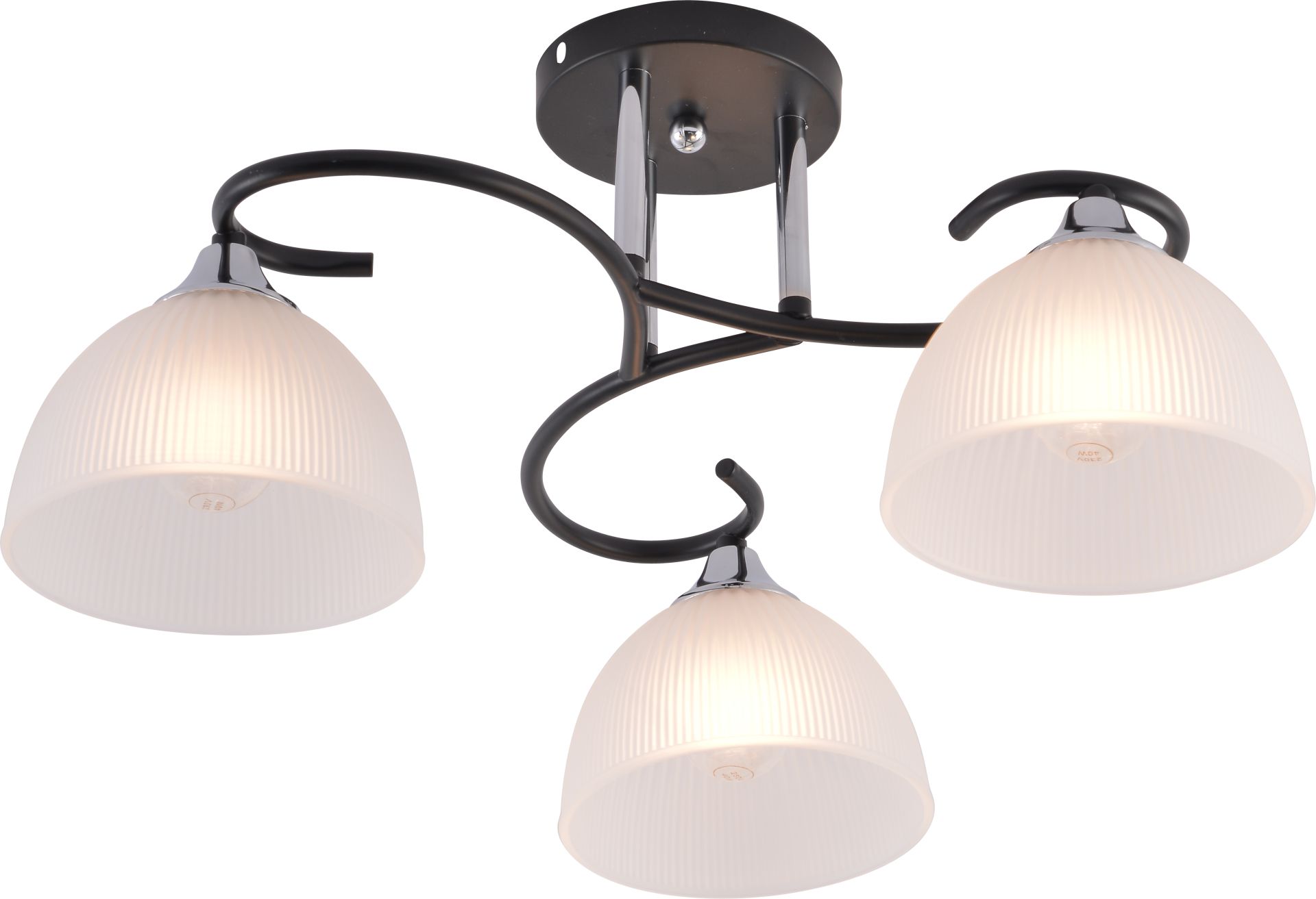 Світильник оснащений трьома плафонами зі скла матового кольору, які забезпечують м’яке та рівномірне розсіювання світла. Завдяки цьому освітлення не засліплює, а створює комфортну атмосферу для відпочинку чи роботи. Особливої привабливості додає рельєфна (ребриста) поверхня плафонів — вона формує делікатну гру світла й тіней, додаючи інтер’єру глибини та вишуканості.