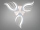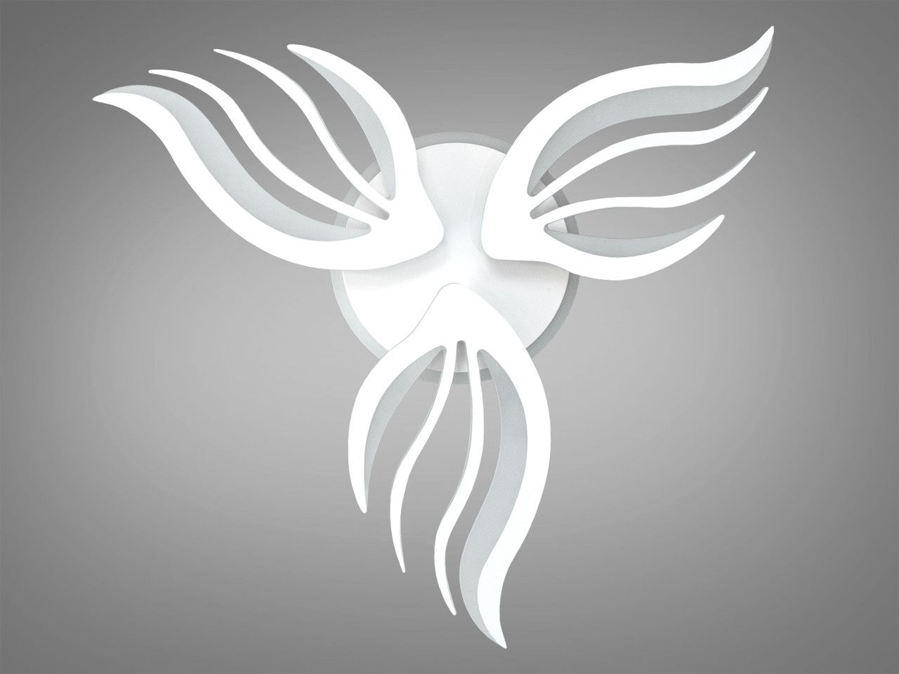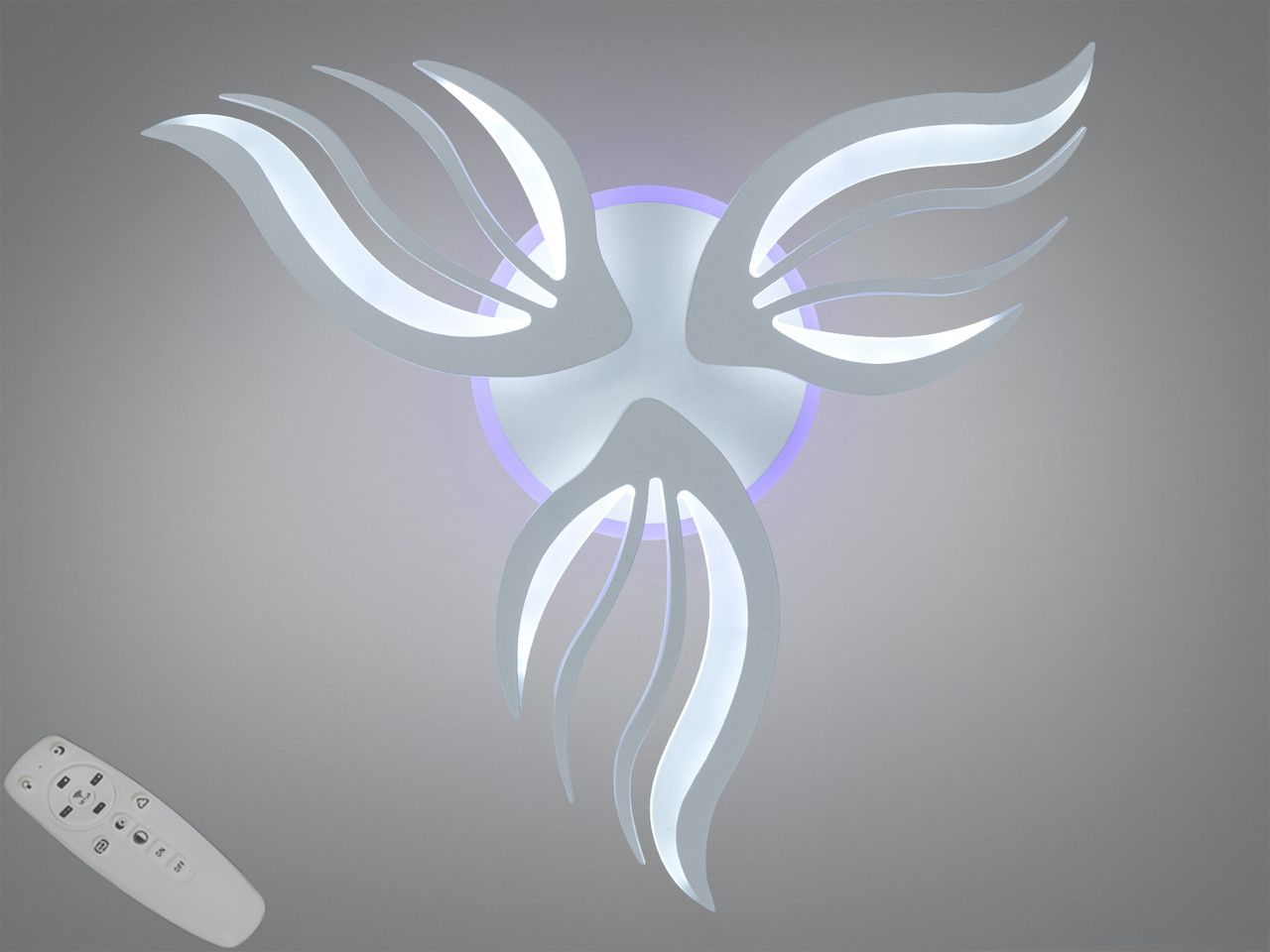 Виріб має плоский пристельовий корпус білого кольору. Основний дизайн сформований трьома вигнутими елементами, що нагадують крила або пелюстки, які розходяться від центру. Світлові елементи виконані з акрилу, що забезпечує рівномірне розсіювання. Основа діаметром 24 см оснащена вбудованим світлодіодним підсвічуванням, яке створює кольоровий ореол на стелі. Загальний діаметр люстри становить 70 см, що робить її помітним елементом інтер'єру при збереженні компактності за висотою.