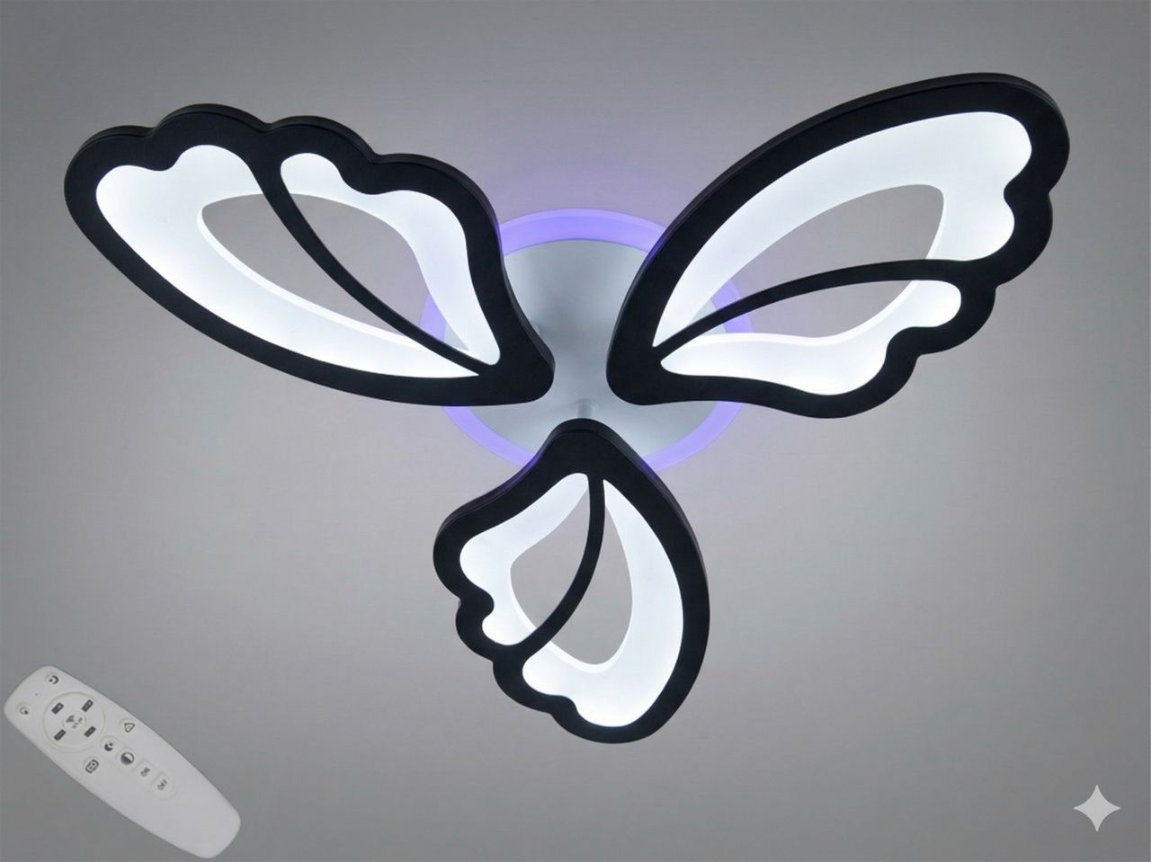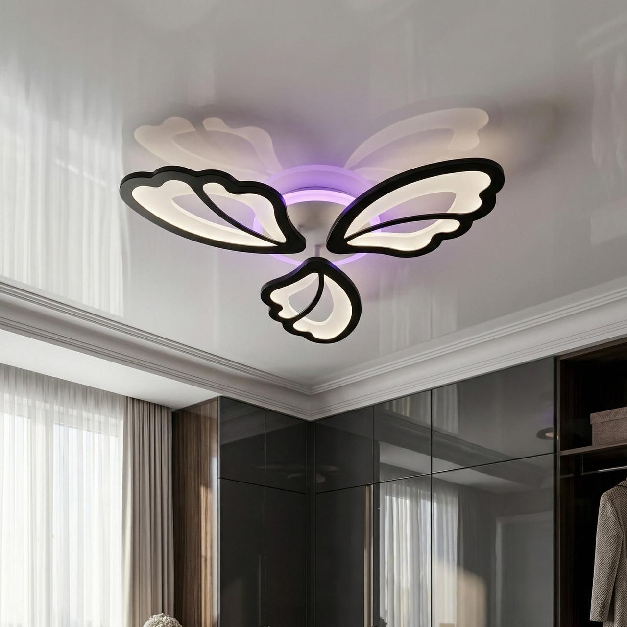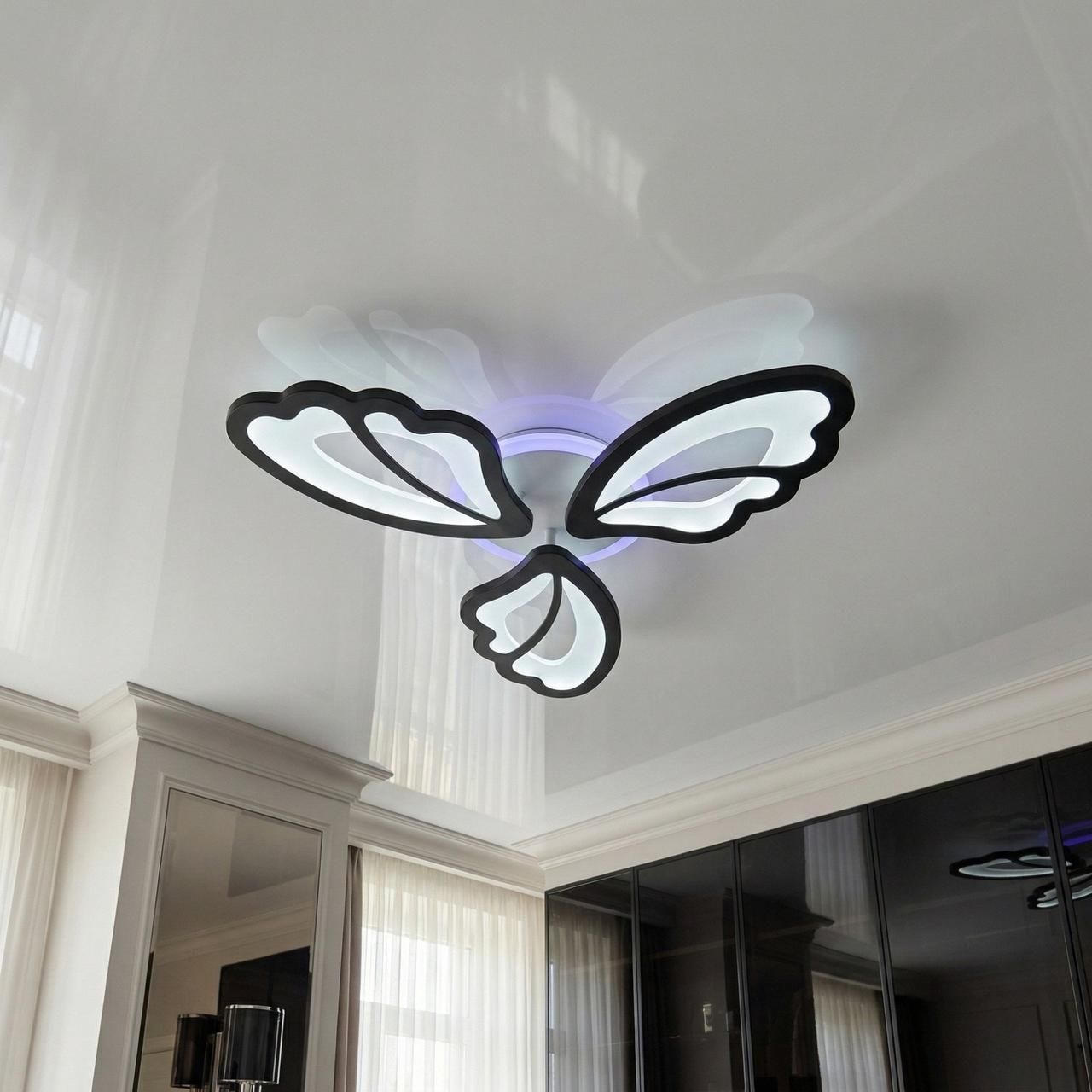 Ця компактна світлодіодна люстра потужністю 50W розроблена для затишного освітлення спалень, дитячих та невеликих залів площею до 12 м². Модель у формі трьох витончених крил метелика з ультратонким профілем (8 см) вирішує завдання ефективного розподілу світла 2750 lm у приміщеннях із низькими стелями, виступаючи яскравим контрастним акцентом в інтер'єрі.