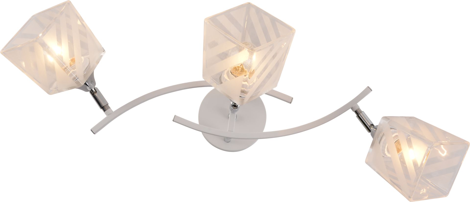 Модель оснащена двома плафонами квадратної форми, виконаними з прозорого скла. Такий дизайн додає виробу легкості та візуальної «чистоти», а матовий декор у вигляді діагональних смуг створює цікавий світловий ефект. Під час роботи світло м’яко розсіюється крізь візерунок, формуючи делікатну гру відблисків і додаючи простору глибини та затишку.