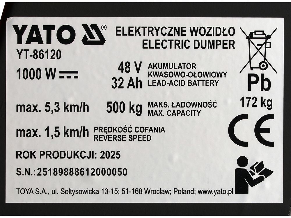 Електричний самоскид YATO YT-86120 – це ефективний та надійний транспортний засіб, призначений для використання в садах, на фермах, у фруктових садах, будівельних майданчиках та у приміщенні.