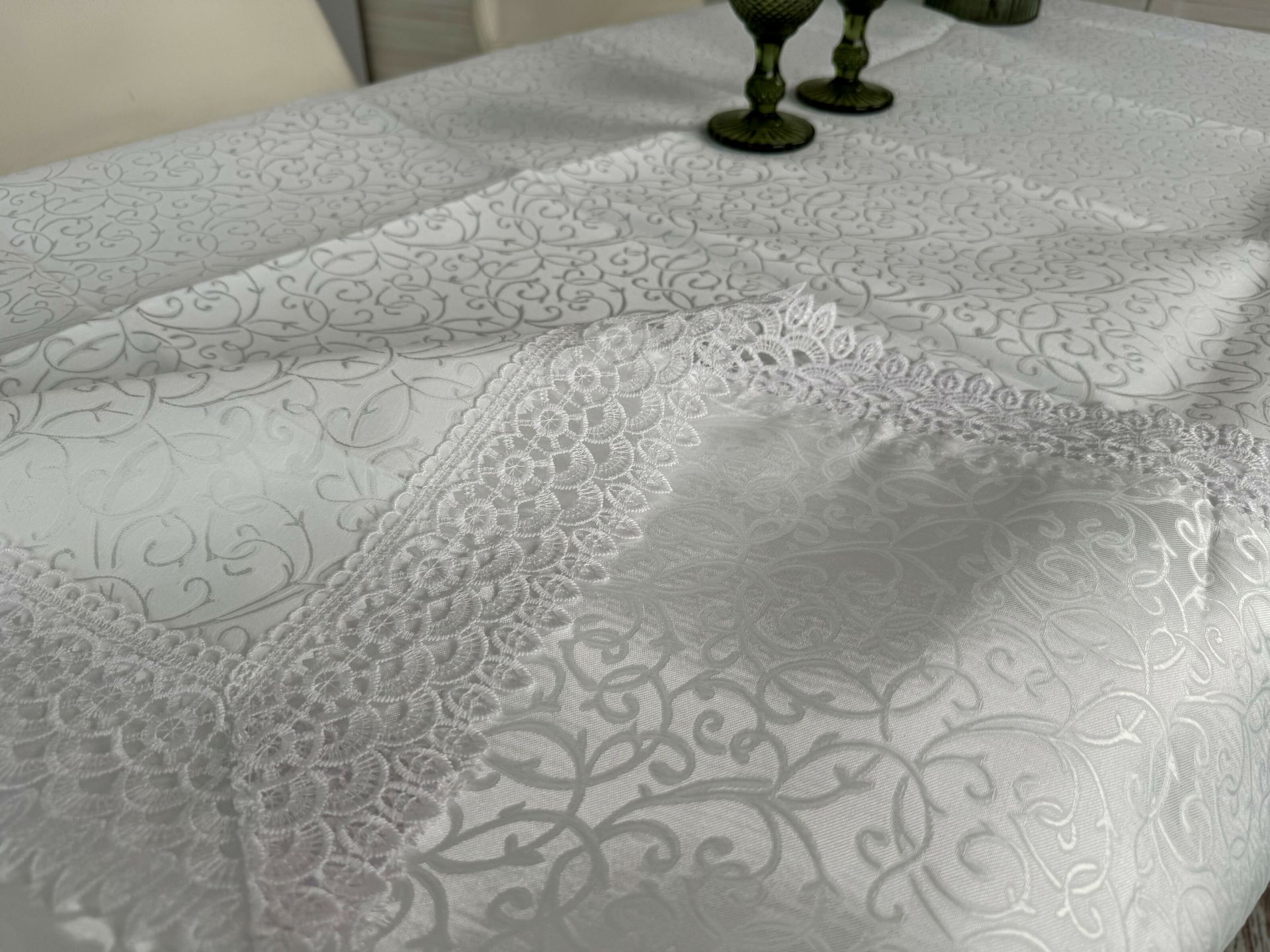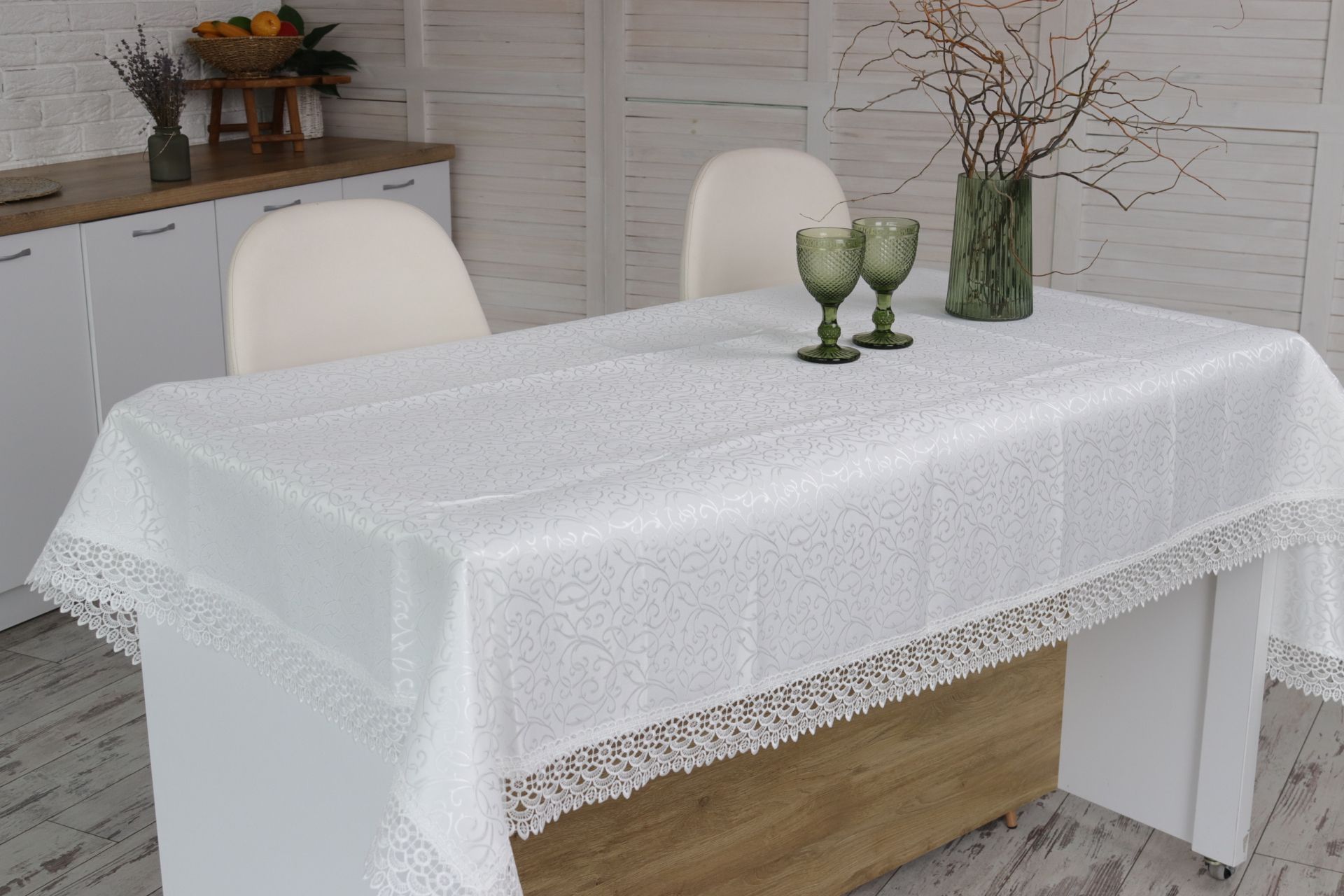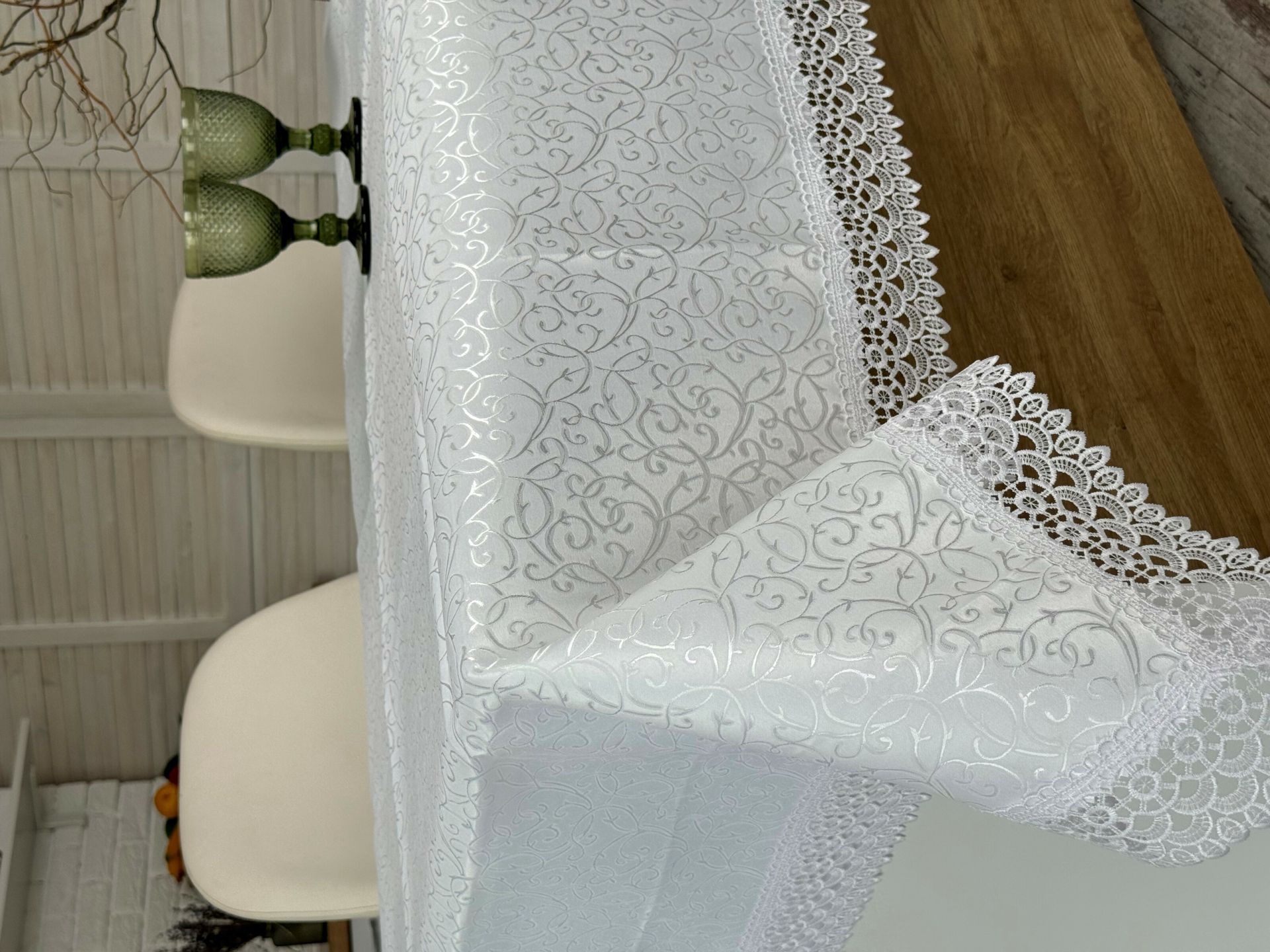 Скатертина з мереживом прямокутна. Розмір 120*150 см. Зроблена зі 100% поліестеру. Синтетична тканина має переваги відносно натуральних матеріалів, а саме - нижча ціна, відсутність усадки при пранні, при цьому має дорогий, святковий на вигляд. Дозволено прання в пральній машині при температурі до 40°, а також прасування. Пакування - п/е пакет.
