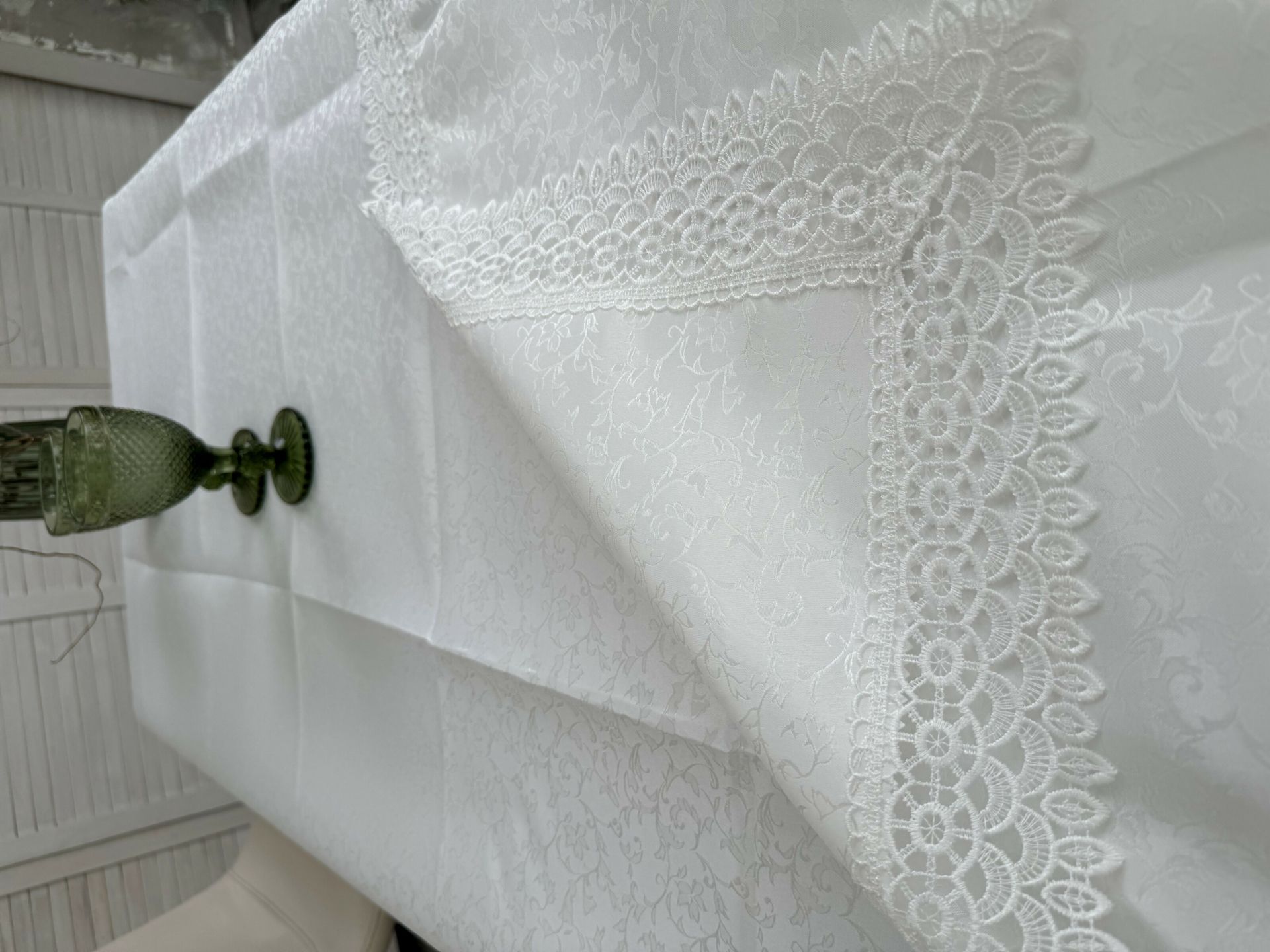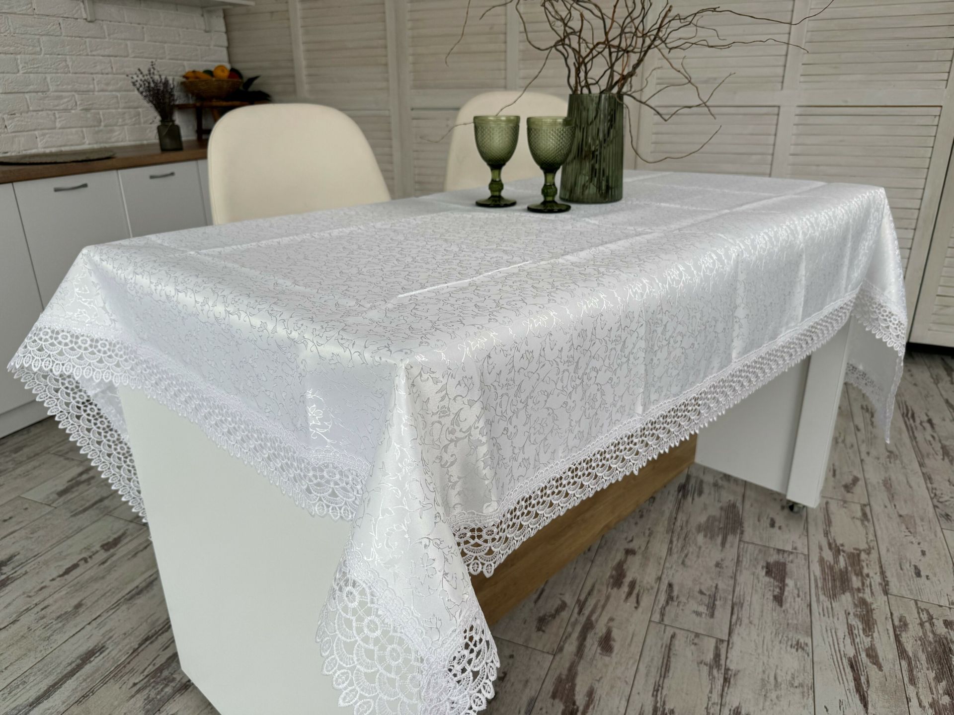 Скатертина з мереживом прямокутна. Розмір 120*150 см. Зроблена зі 100% поліестеру. Синтетична тканина має переваги відносно натуральних матеріалів, а саме - нижча ціна, відсутність усадки при пранні, при цьому має дорогий, святковий на вигляд. Дозволено прання в пральній машині при температурі до 40°, а також прасування. Пакування - п/е пакет.