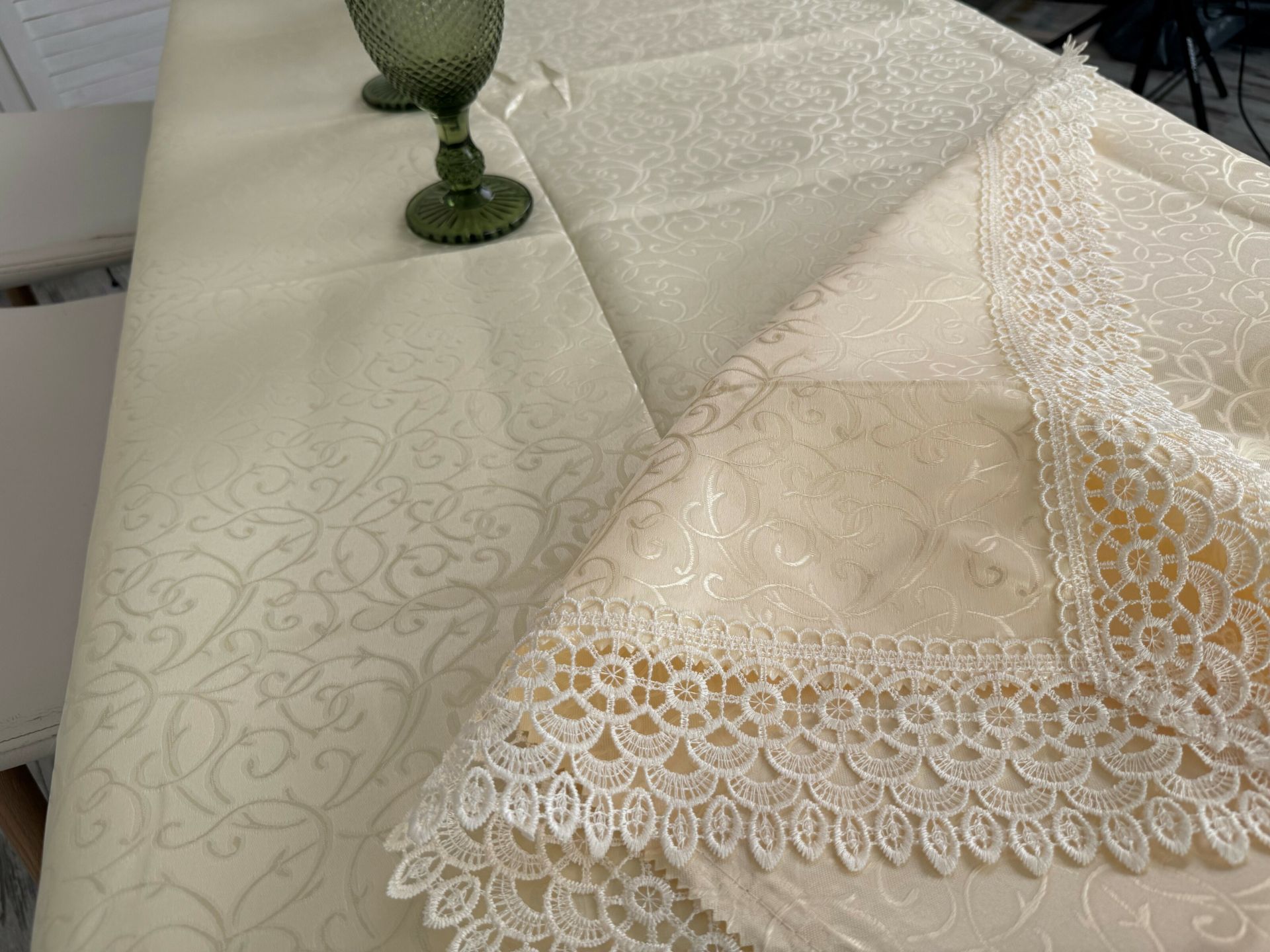 Скатертина з мереживом прямокутна. Розмір 120*150 см. Зроблена зі 100% поліестеру. Синтетична тканина має переваги відносно натуральних матеріалів, а саме - нижча ціна, відсутність усадки при пранні, при цьому має дорогий, святковий на вигляд. Дозволено прання в пральній машині при температурі до 40°, а також прасування. Пакування - п/е пакет.