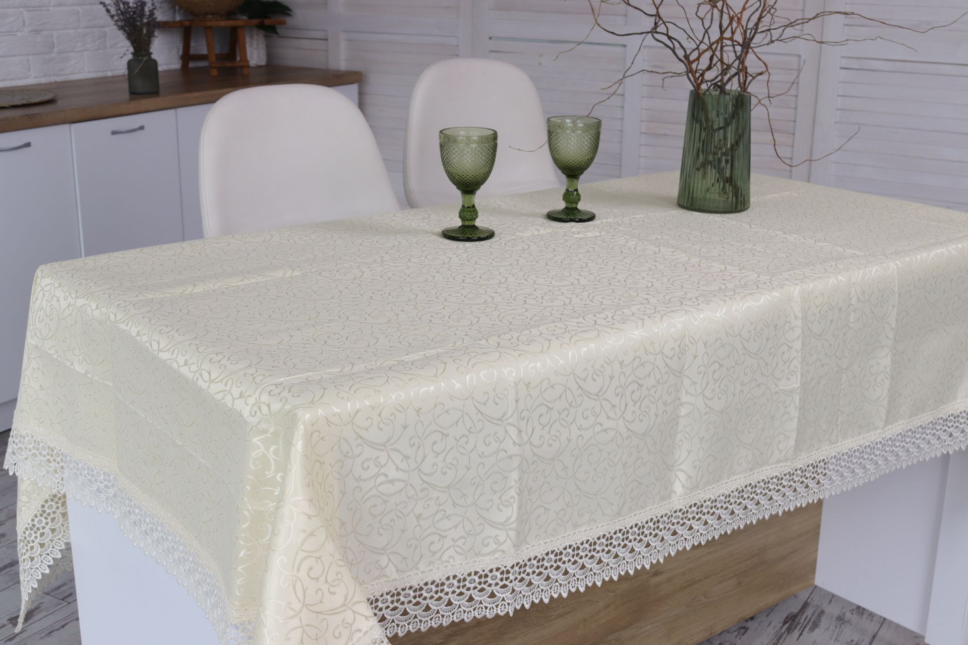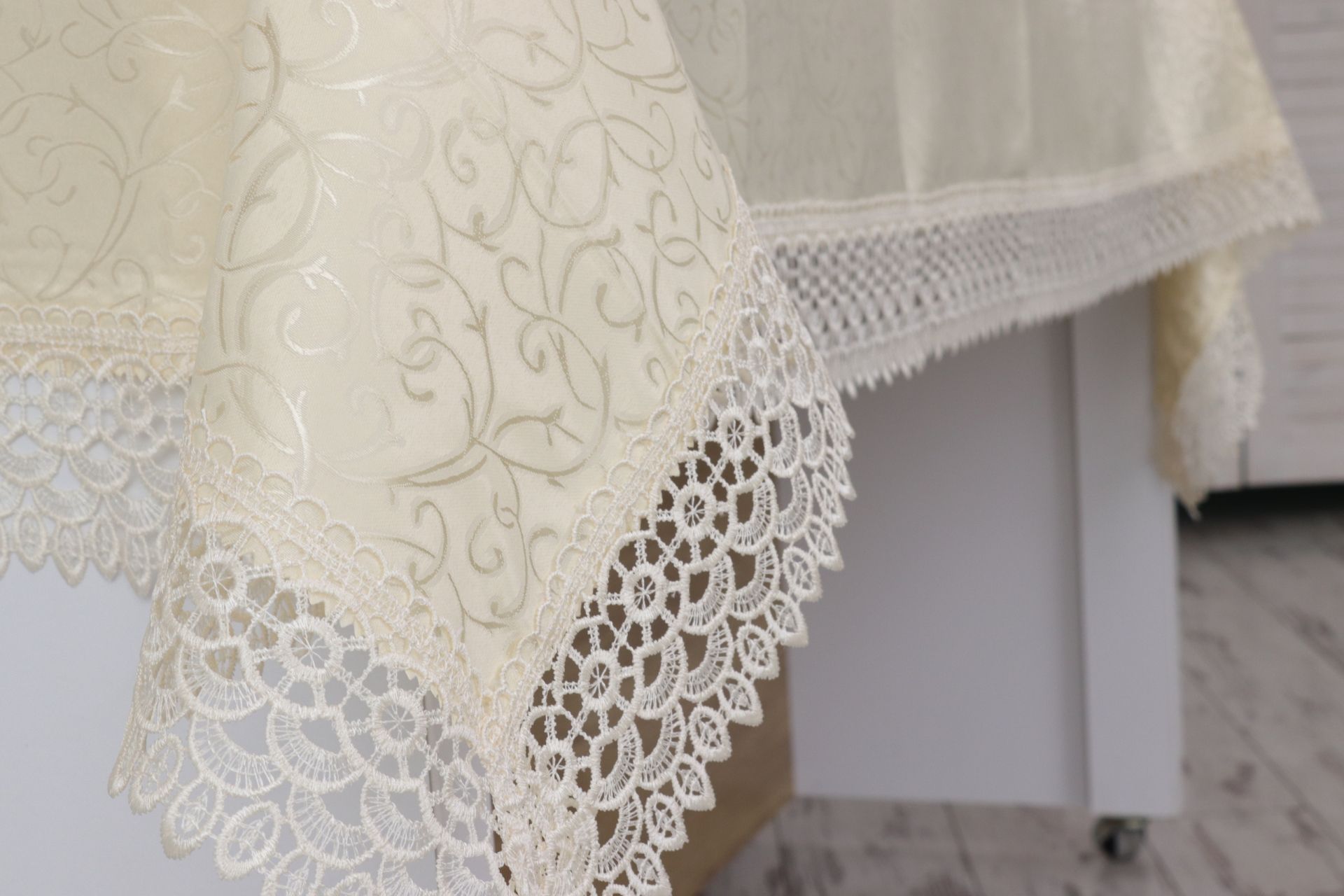 Скатертина з мереживом прямокутна. Розмір 120*150 см. Зроблена зі 100% поліестеру. Синтетична тканина має переваги відносно натуральних матеріалів, а саме - нижча ціна, відсутність усадки при пранні, при цьому має дорогий, святковий на вигляд. Дозволено прання в пральній машині при температурі до 40°, а також прасування. Пакування - п/е пакет.
