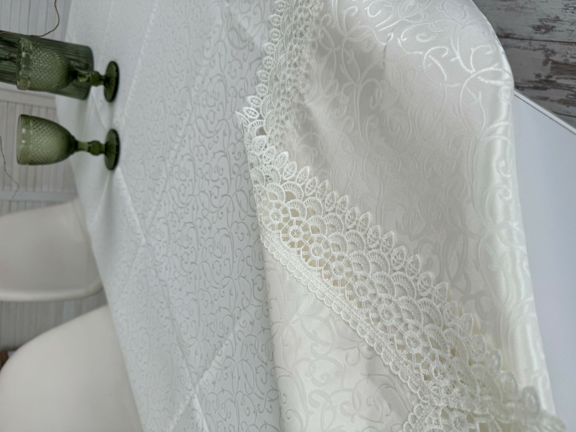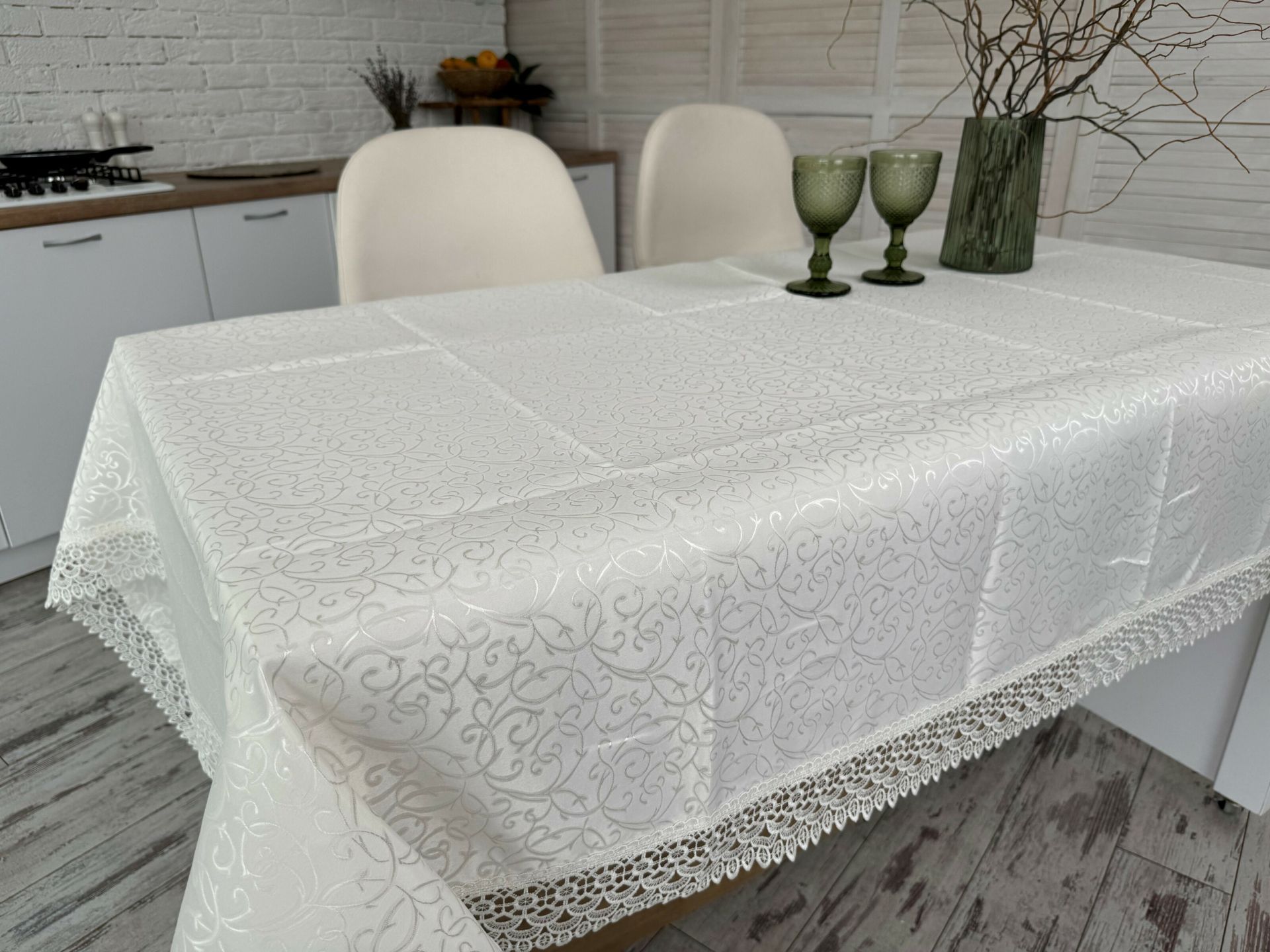 Скатертина з мереживом прямокутна. Розмір 120*150 см. Зроблена зі 100% поліестеру. Синтетична тканина має переваги відносно натуральних матеріалів, а саме - нижча ціна, відсутність усадки при пранні, при цьому має дорогий, святковий на вигляд. Дозволено прання в пральній машині при температурі до 40°, а також прасування. Пакування - п/е пакет.