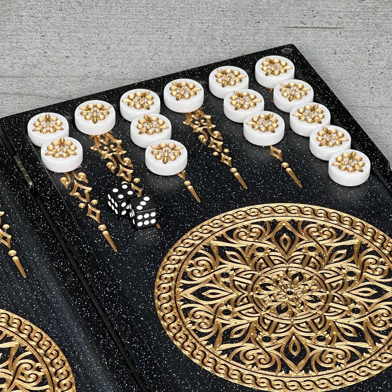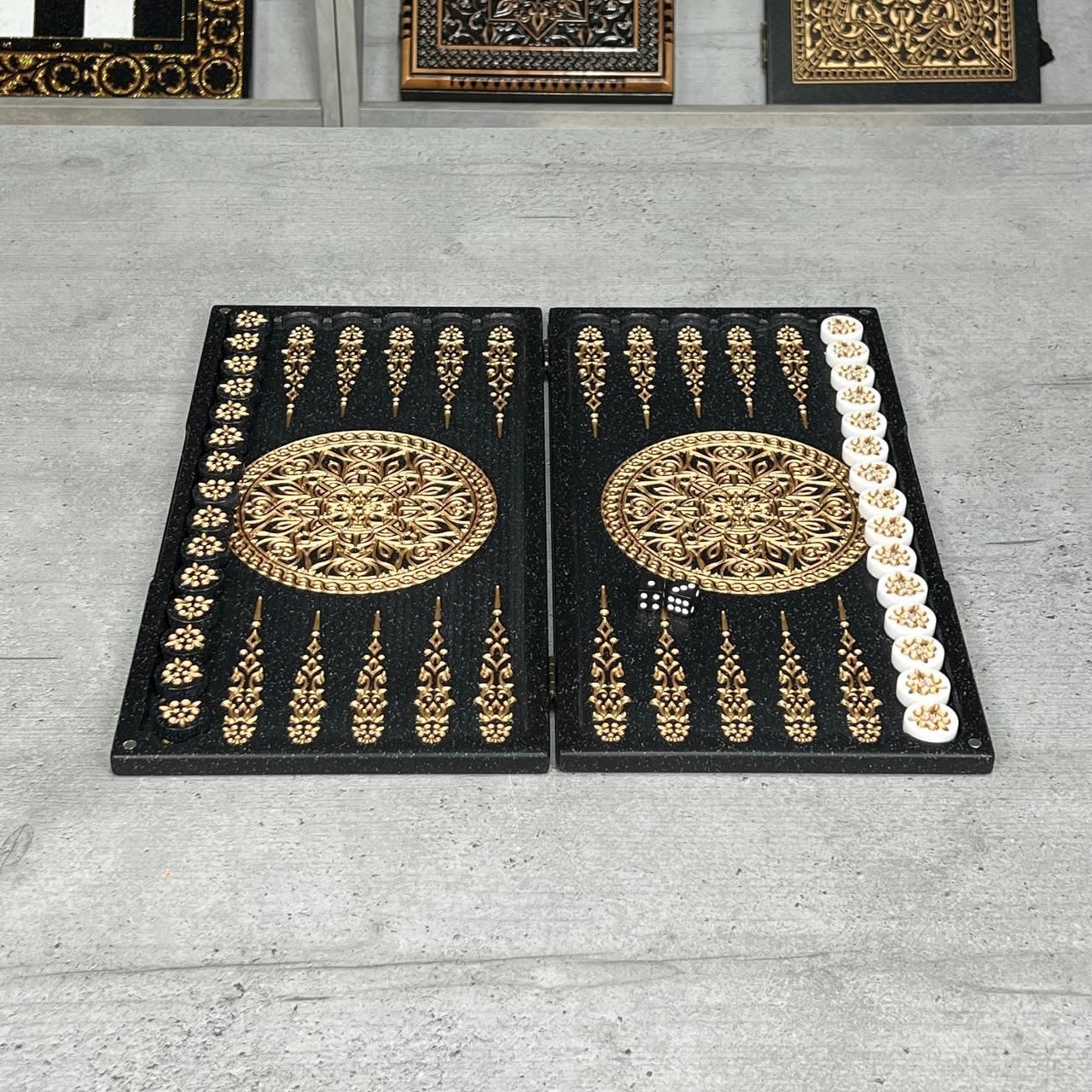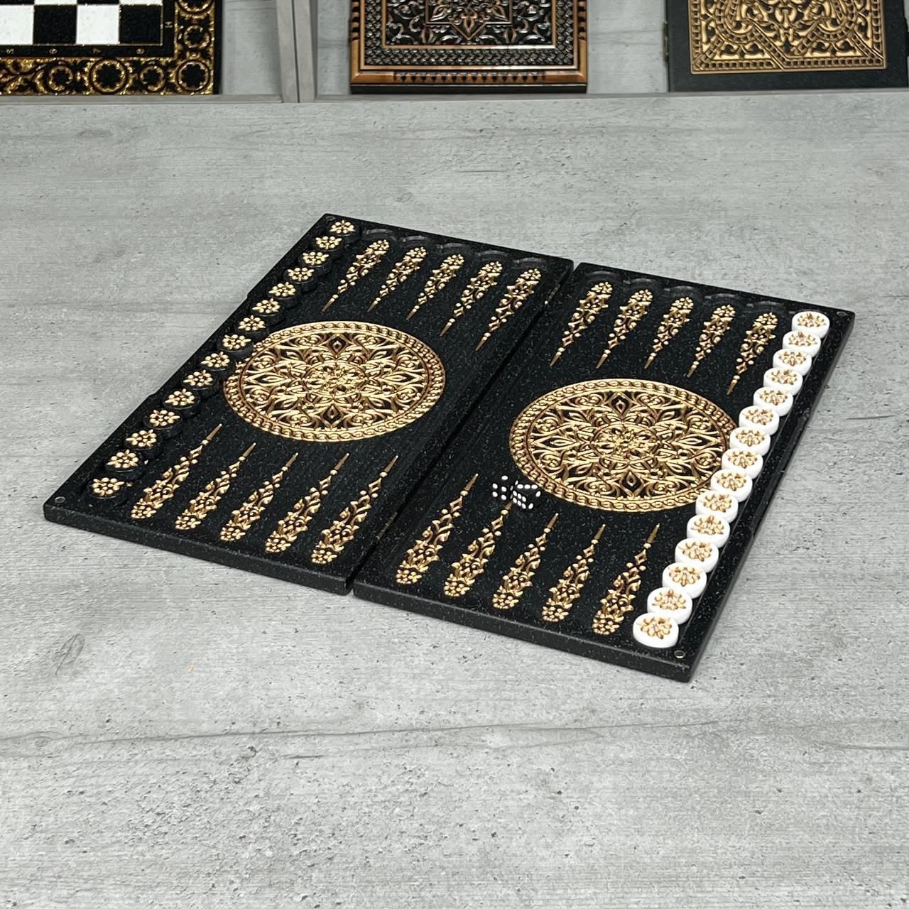 Компактні нарди з каменю «Золотий Орнамент» — витончений подарунок для ділових чоловіків Шукаєте презент, який поєднує в собі монументальність каменю та мобільність? Модель у розмірі 37х18 см — це ідеальне рішення для тих, хто цінує інтелектуальний відпочинок у подорожах, на ділових зустрічах або в затишному домашньому кабінеті. Незважаючи на компактність, набір зберіг солідність та благородний стиль старшої моделі. Особливості цієї моделі, що роблять її безальтернативною: Магічна міцність акрилового каменю. Використання монолітного чорного каменю робить набір практично вічним. Він не боїться вологи, перепадів температур чи активної експлуатації. Вага у 1,5 кг — це ідеальний баланс між легкістю для транспортування та відчуттям реальної, цінної речі в руках. Мистецтво в деталях. Глибока фрезеровка орнаменту заповнена спеціальною антикварною фарбою з ефектом «старого золота». Контраст золотих ліній на матовому чорному фоні виглядає дорого та стримано, підкреслюючи бездоганний смак власника. Комфортна механіка гри. Фішки діаметром 24 мм спеціально підібрані під цей розмір поля, що забезпечує зручність маневрів. Гладка поверхня каменю гарантує плавний хід, а благородний звук дотику фішок до поля додає грі особливого затишку. Стійкість та практичність. Акриловий композит надзвичайно стійкий до подряпин. Навіть при частих подорожах набір зберігатиме вигляд нового виробу, залишаючись предметом вашої гордості. Чому варто замовити саме зараз? Ми виготовляємо обмежену кількість компактних наборів, оскільки ручна обробка каменю такого розміру вимагає особливої ювелірної точності. Оформіть замовлення сьогодні, і ми забезпечимо швидку відправку. Це той випадок, коли ви отримуєте VIP-якість у зручному форматі, що завжди під рукою. Технічні характеристики: Параметр Значення Матеріал корпусу Акриловий камінь (чорний моноліт) Оформлення Антикварна золота фарба, художня різьба Розмір у складеному вигляді 37 х 18 х 2 см Розмір у розкладеному вигляді 37 х 36 х 1 см Діаметр фішки 24 мм Вага набору 1,5 кг Комплектація Нарди, фішки, кубики (зари) Не втрачайте можливість отримати унікальний виріб. Тисніть «Купити», і ми обговоримо деталі персоналізації (гравіювання ініціалів) протягом 10 хвилин!