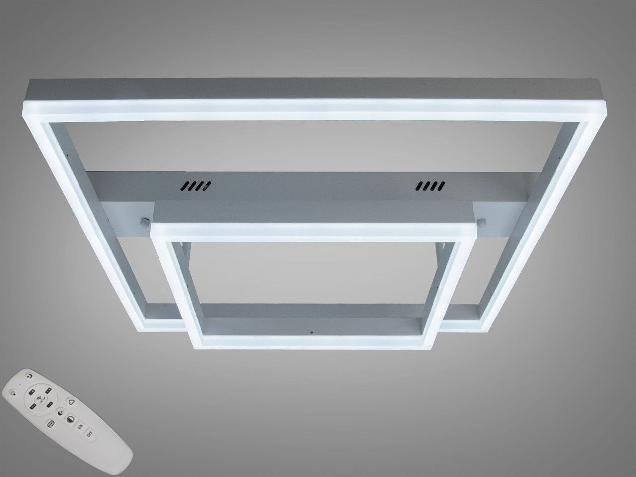 Сучасне архітектурне світлове рішення для приміщень площею до 15–18 м². Завдяки мінімалістичному дизайну «квадрат у квадраті» та чистому білому кольору, люстра візуально розширює простір, забезпечуючи потужний світловий потік та повний контроль над атмосферою за допомогою пульта.