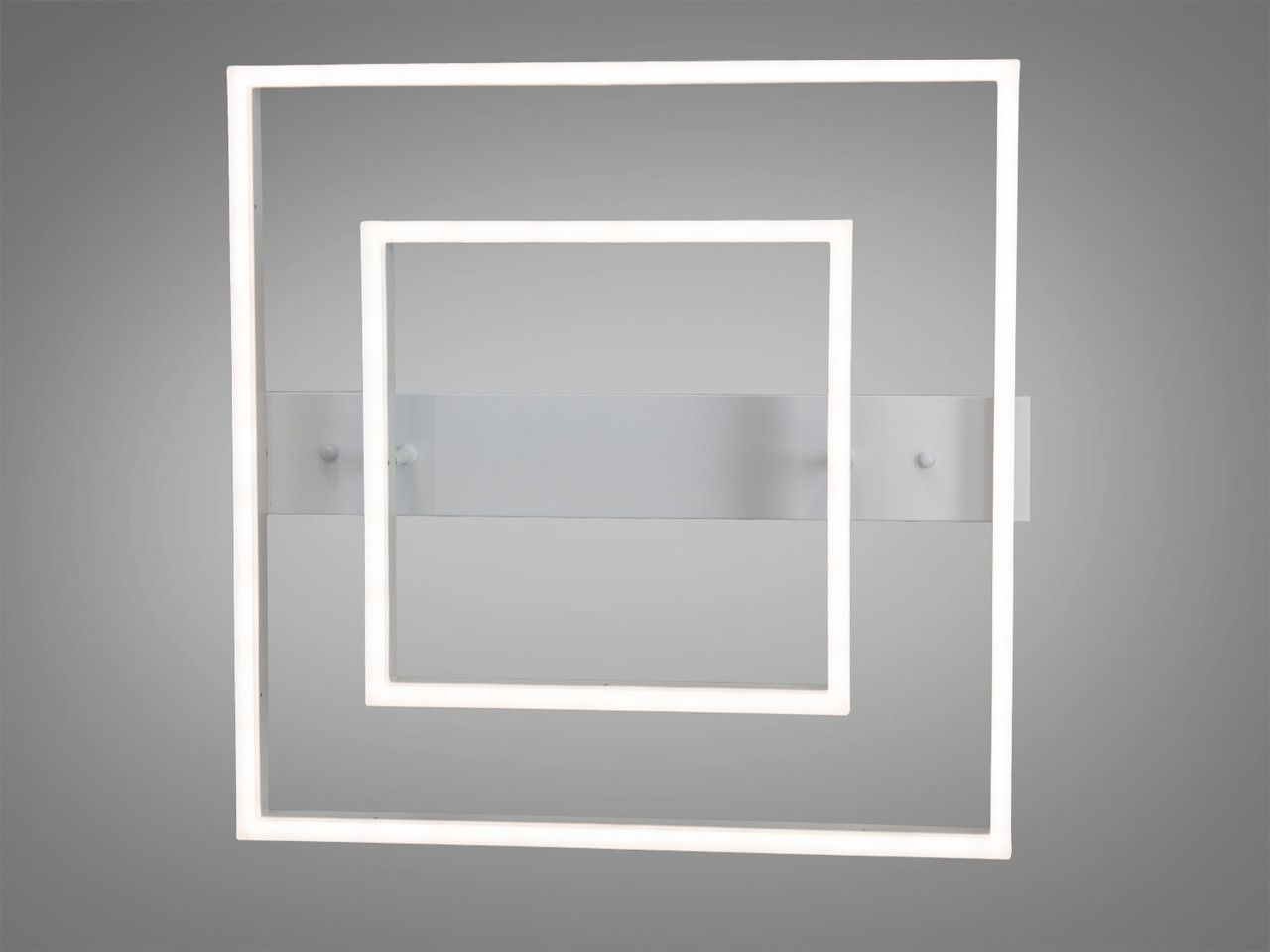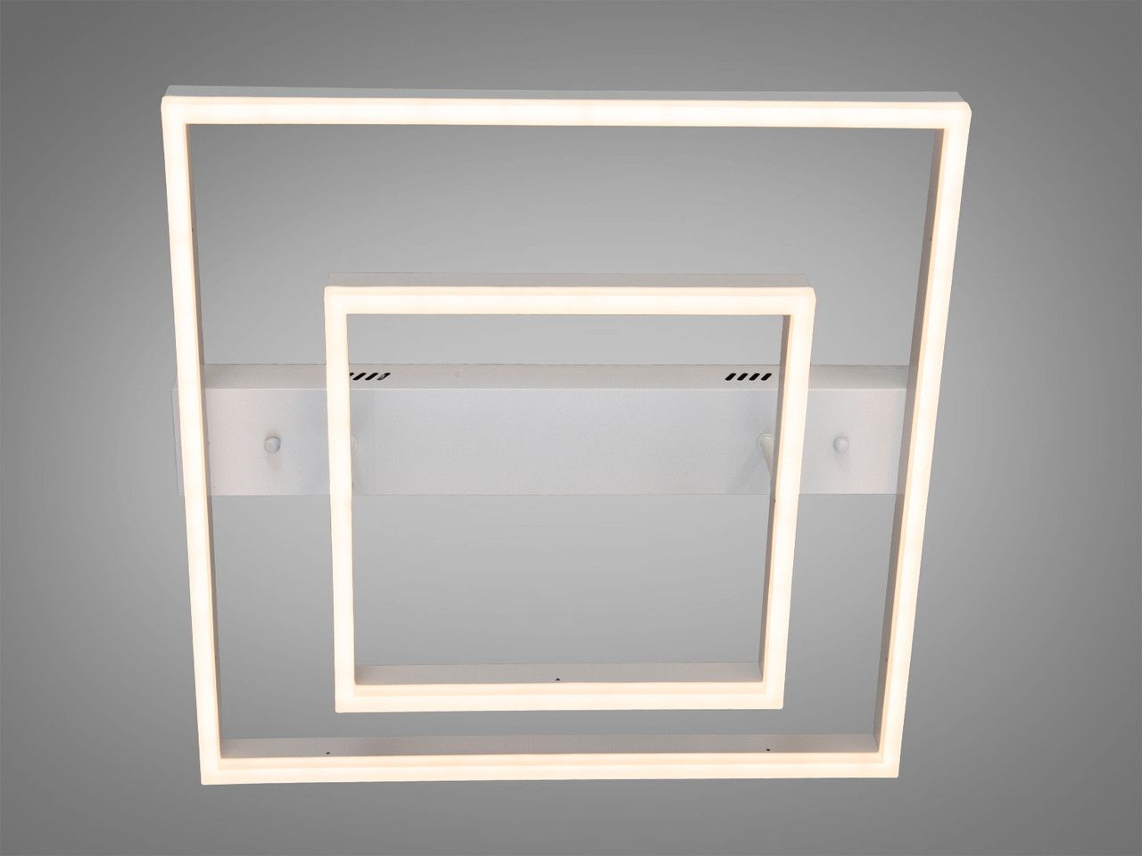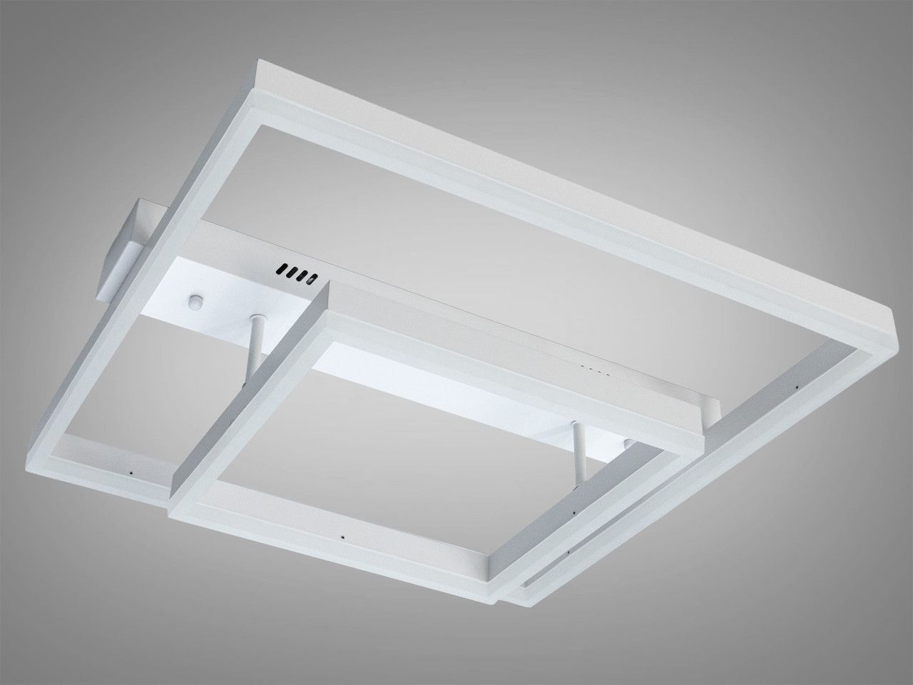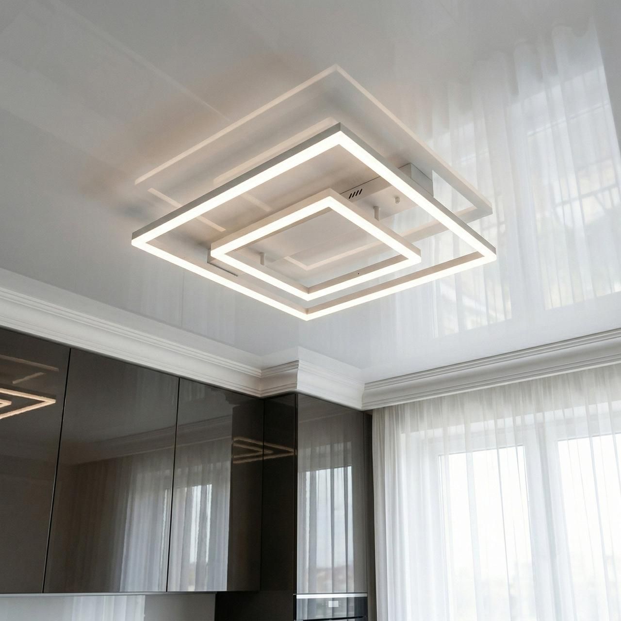 Модель виконана у стилі геометричного мінімалізму. Конструкція складається з двох світлових квадратів різного розміру, розташованих один в одному, що створює ефект об’ємної світлової рамки. Корпус виготовлений з металу з якісним білим матовим покриттям, а розсіювачі — з оптичного акрилу. Така форма забезпечує рівномірне заповнювальне освітлення без різких тіней, а білий колір робить прилад майже непомітним на фоні світлої стелі у вимкненому стані.