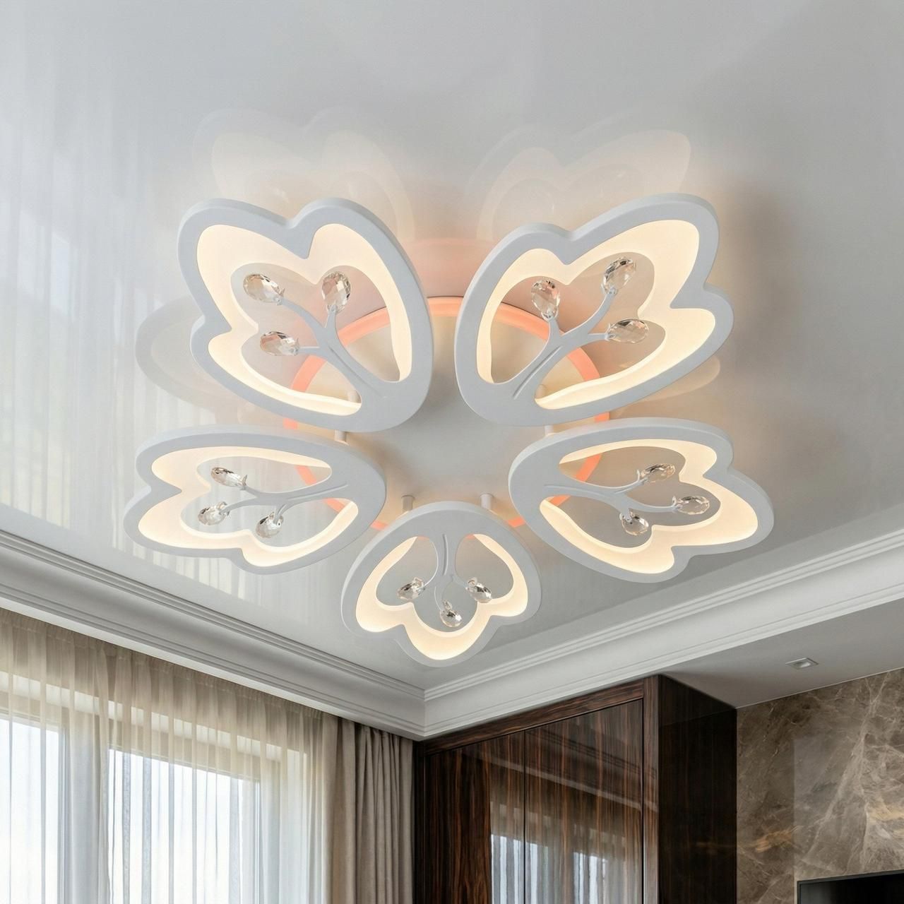 Вишукане та лаконічне світлове рішення у формі п'ятипелюсткової квітки для приміщень площею до 20 м². Завдяки чистому білому кольору та інтегрованій підсвітці основи, люстра створює відчуття легкості та візуально розширює простір, дозволяючи плавно керувати атмосферою дому за допомогою пульта.