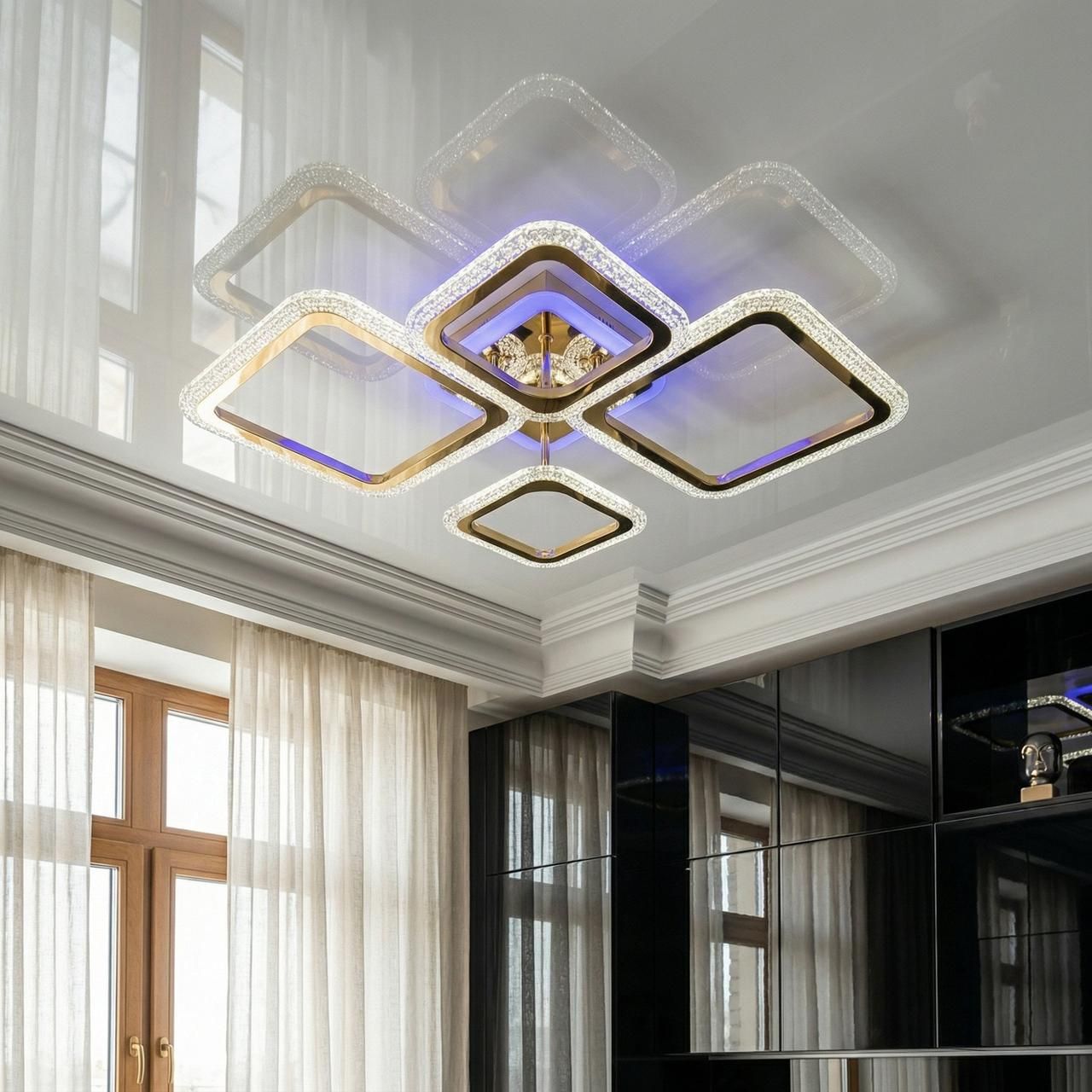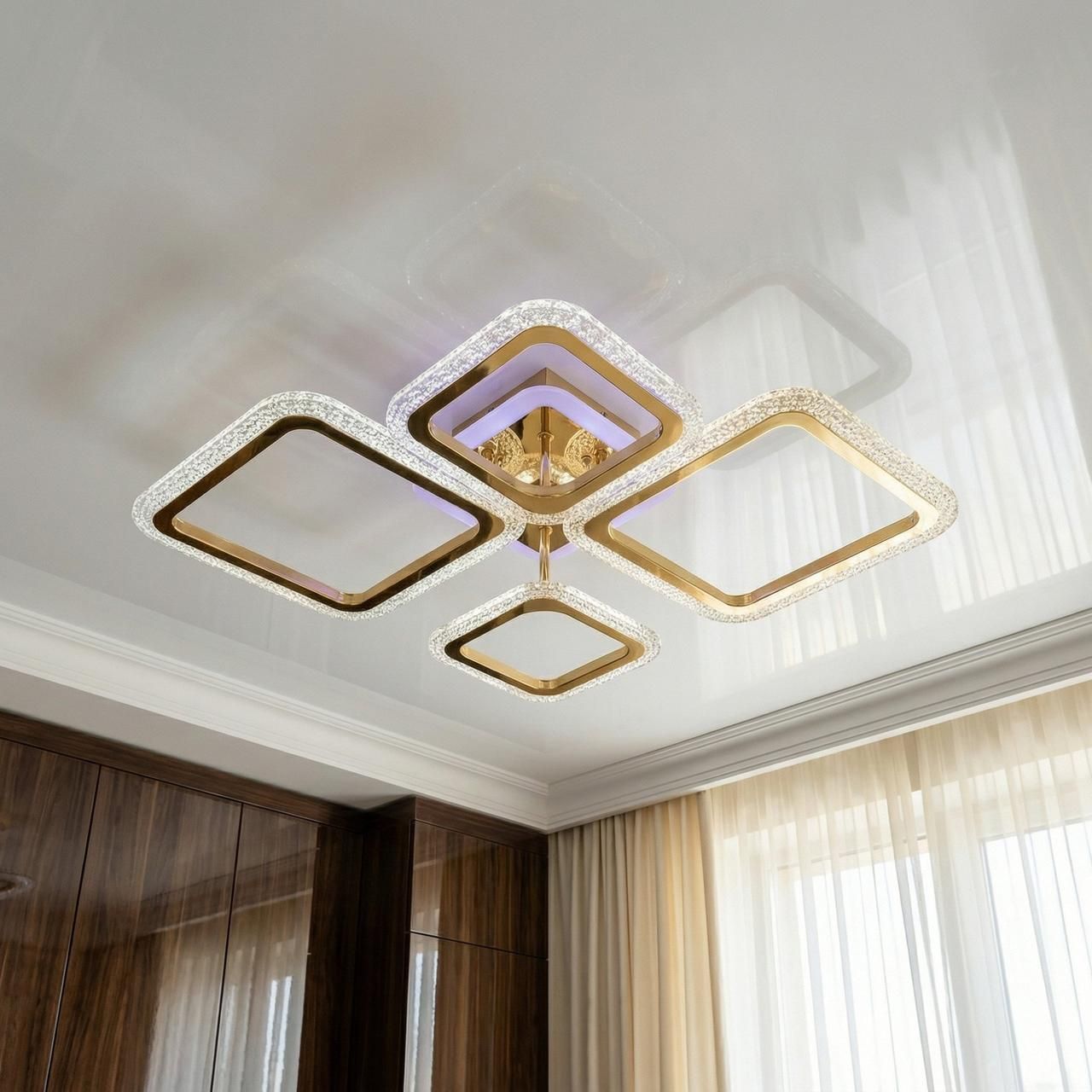 Дизайн моделі побудований на грі геометричних форм: чотири світлові рамки (два великих та два малих квадрати) створюють об'ємну асиметричну композицію. Металевий корпус має якісне гальванічне покриття кольору «золото», що забезпечує преміальний дзеркальний блиск. Бічні грані рамок оздоблені акрилом із ефектом «кришталевої крихти», який заломлює промені та створює іскристі відблиски. Додаткова підсвітка основи формує м’який кольоровий ореол на стелі, візуально піднімаючи її.