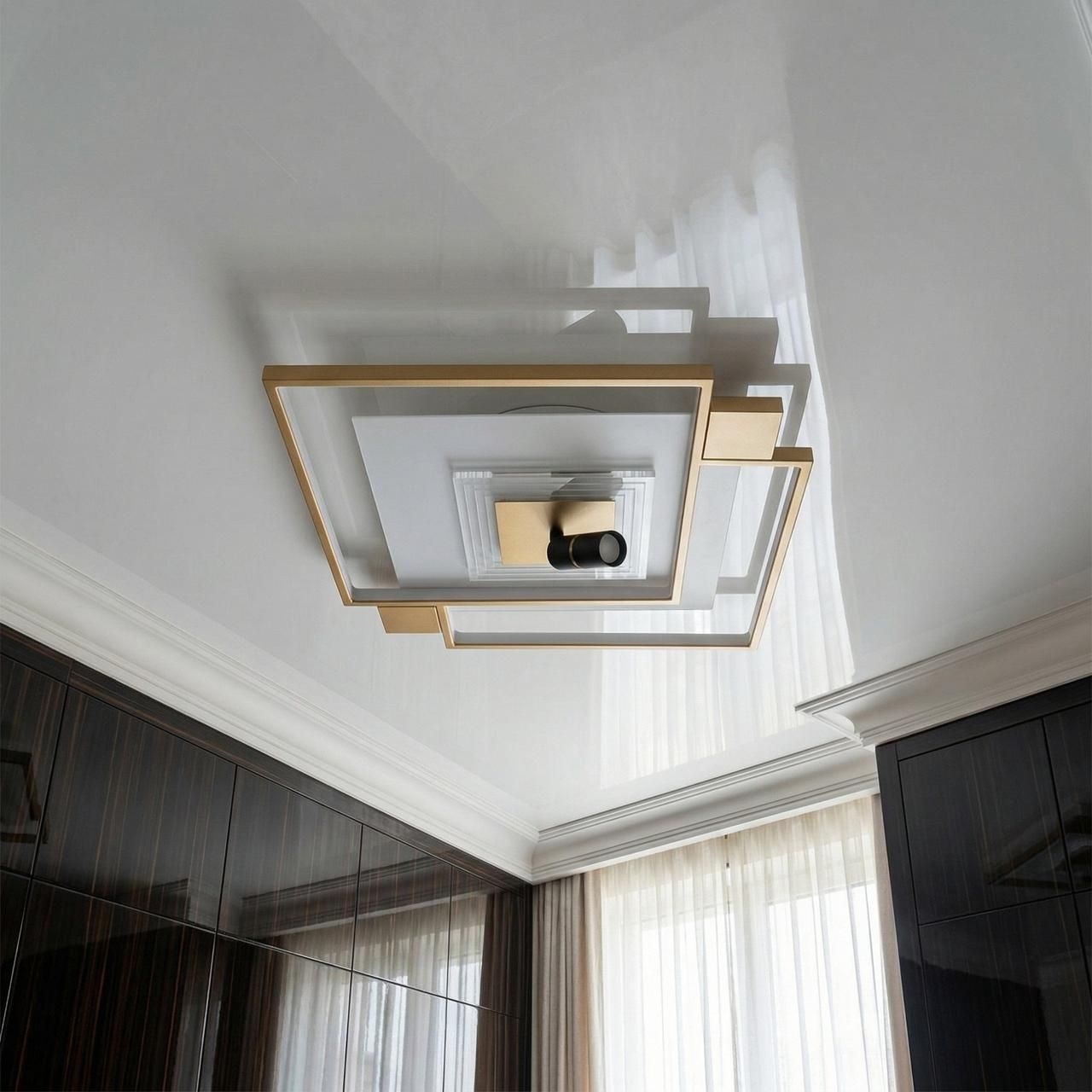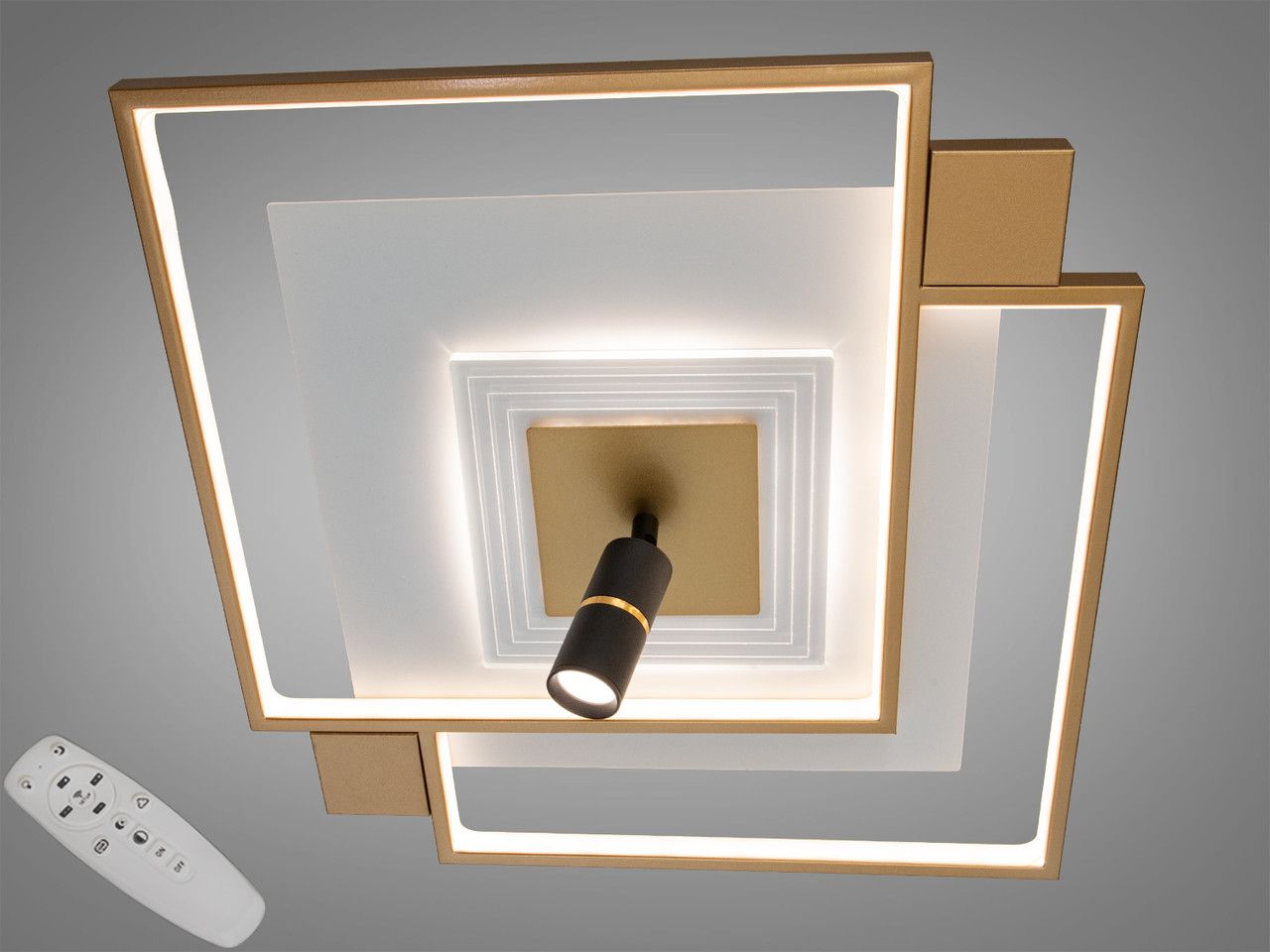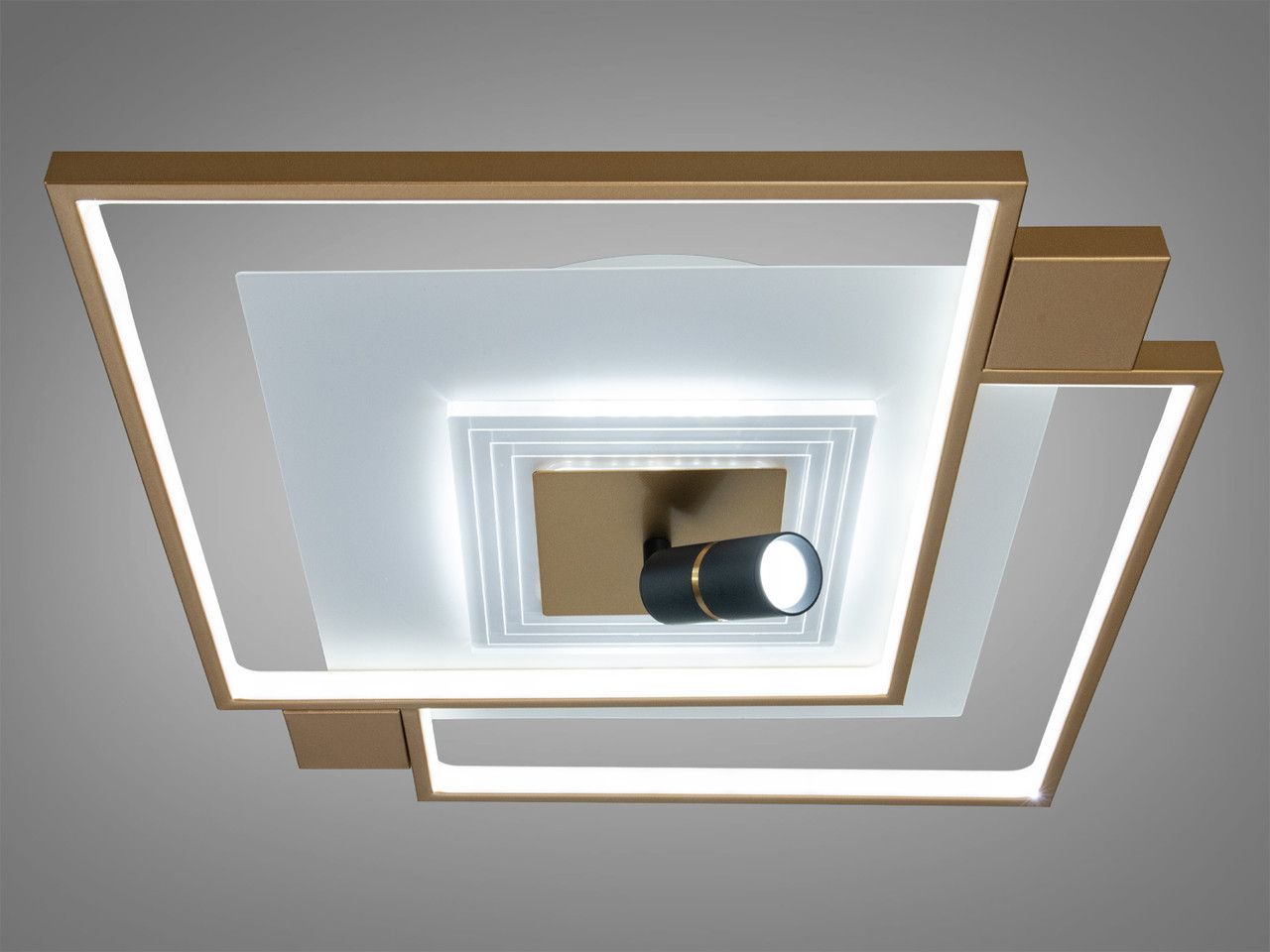 Інноваційне світлове рішення, що поєднує потужну основну люстру та функціональний спрямований прожектор. Завдяки дизайну «квадрат у квадраті» та акцентному золотому покриттю, модель ідеально підходить для приміщень площею до 15–18 м², де потрібне як загальне світло, так і підсвічування конкретних зон (робочого столу, картини чи зони відпочинку).