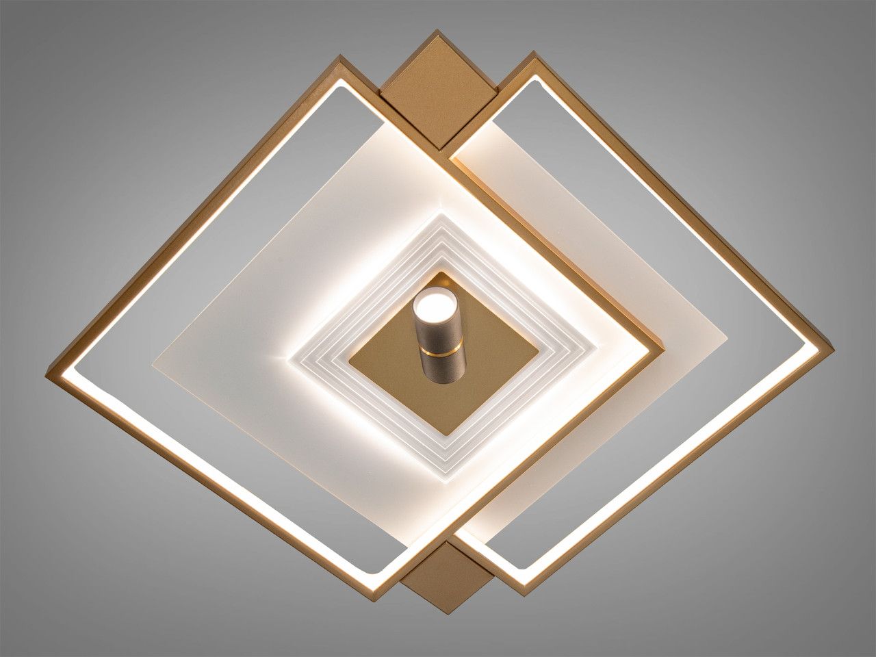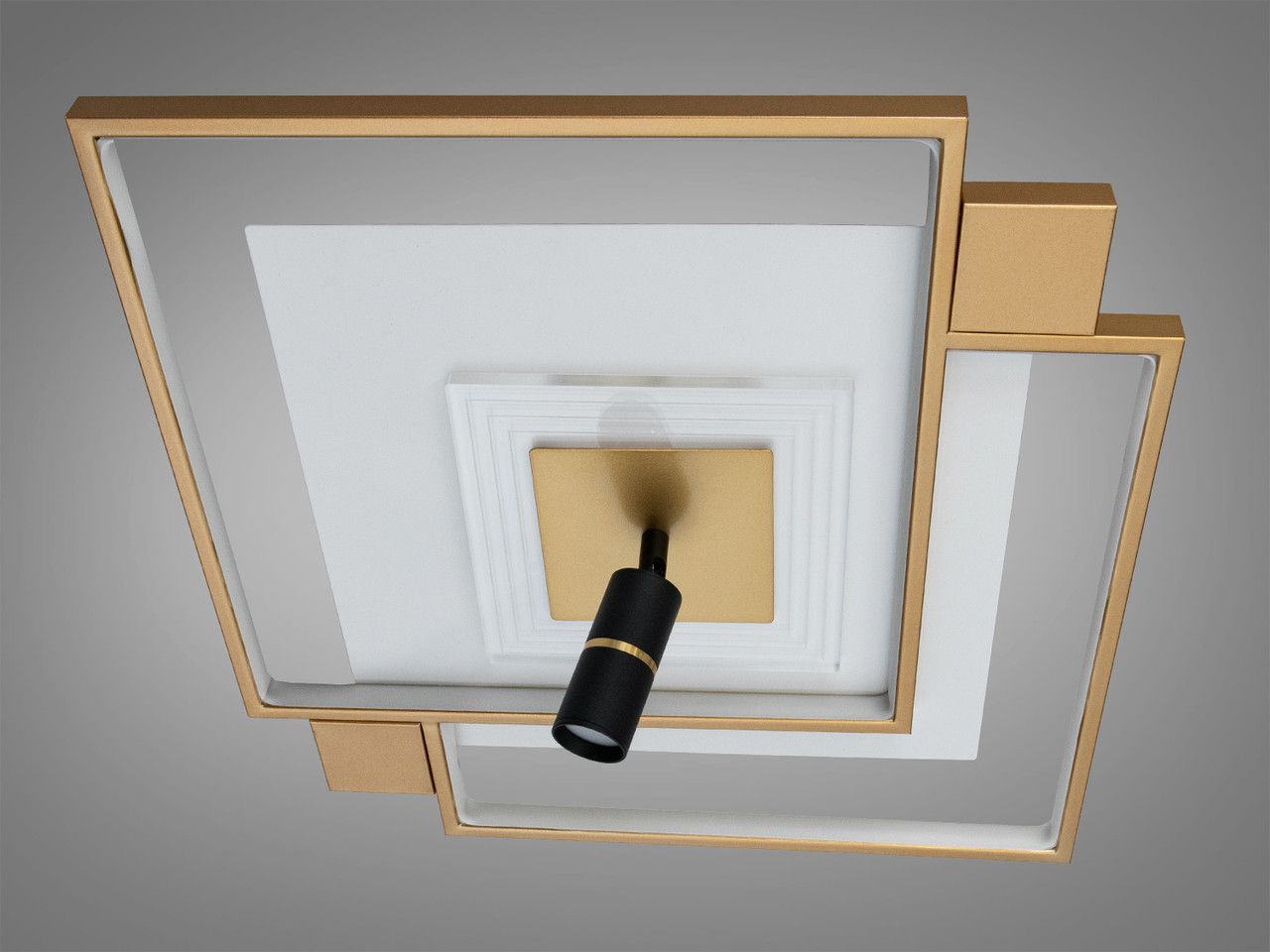 Дизайн моделі базується на багатошаровій геометрії: два великих світлових квадрати зміщені відносно центру, створюючи динамічну композицію. Корпус виконаний у благородному білому матовому кольорі з преміальними золотими вставками. Головна особливість — центральний поворотний спот у чорно-золотому виконанні, який додає приладу індустріального шику та розширює його функціональні можливості. Люстра виглядає архітектурно та сучасно, стаючи головним візуальним центром інтер'єру.