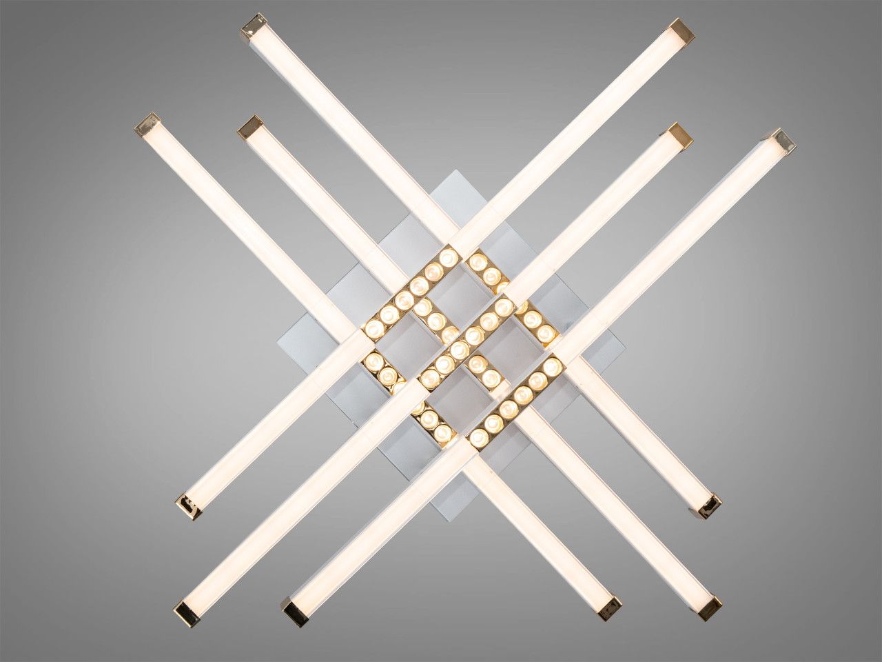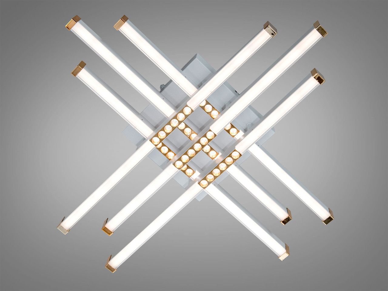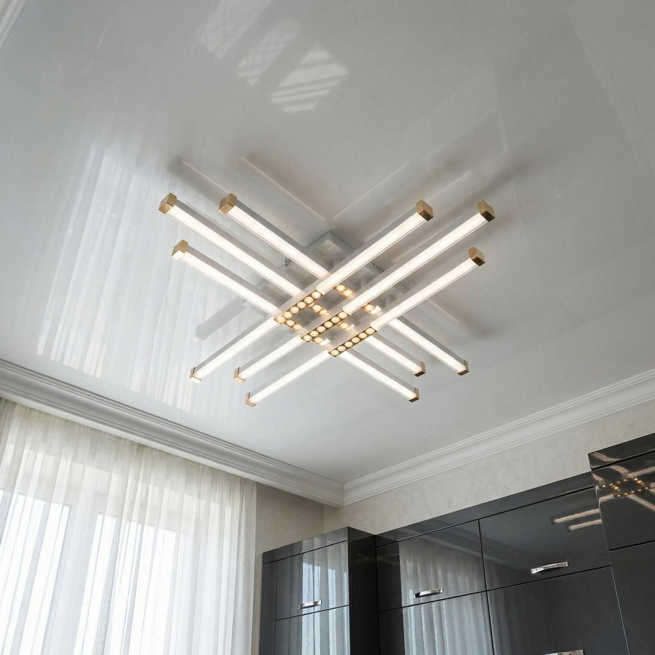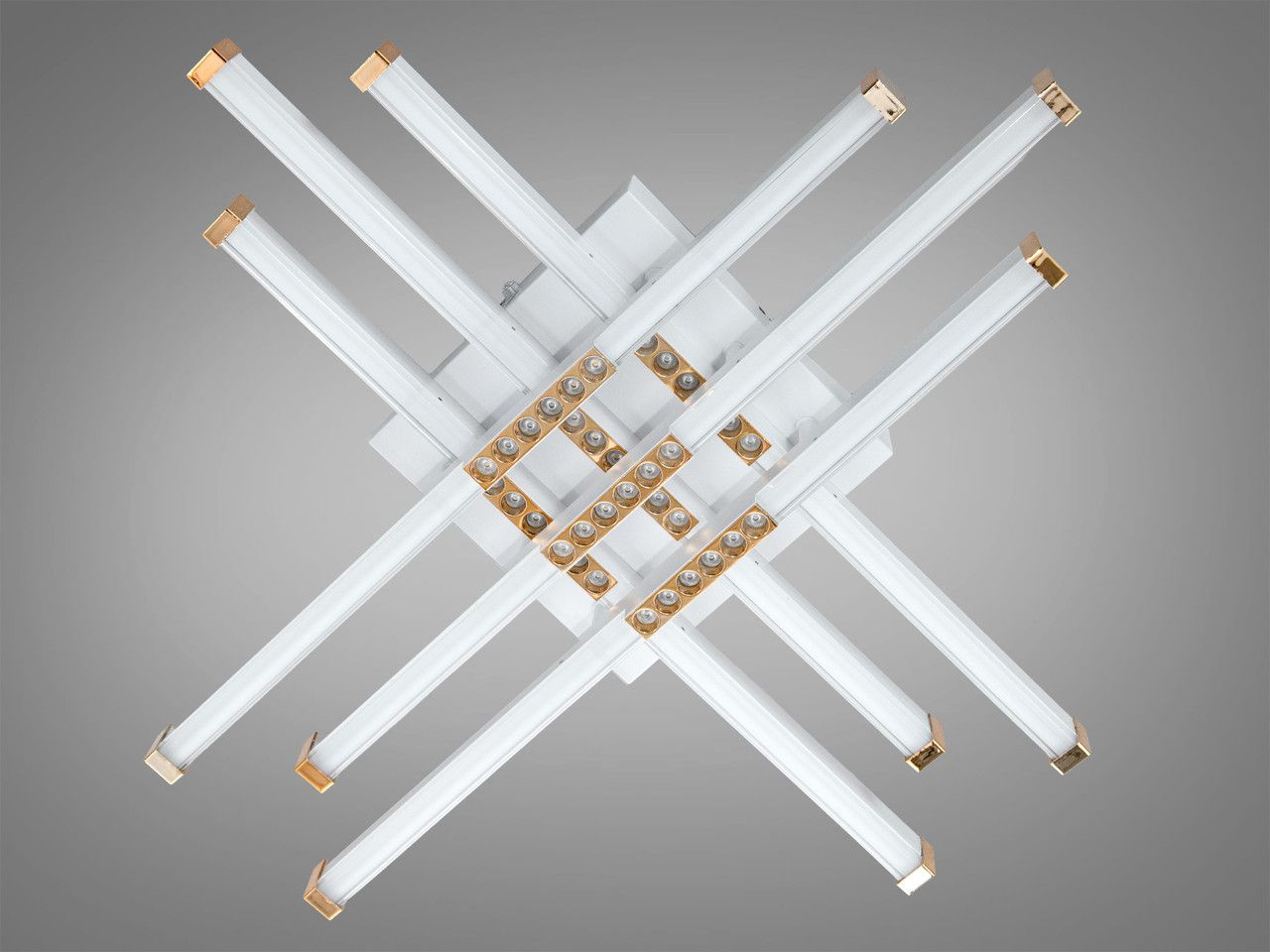 Футуристичне світлове рішення для сучасних інтер'єрів площею до 16 м². Завдяки унікальній архітектурній формі з перехресних світлових ліній та чистому білому кольору, люстра створює ефект динамічного простору, забезпечуючи потужний світловий потік у 3300 Лм.