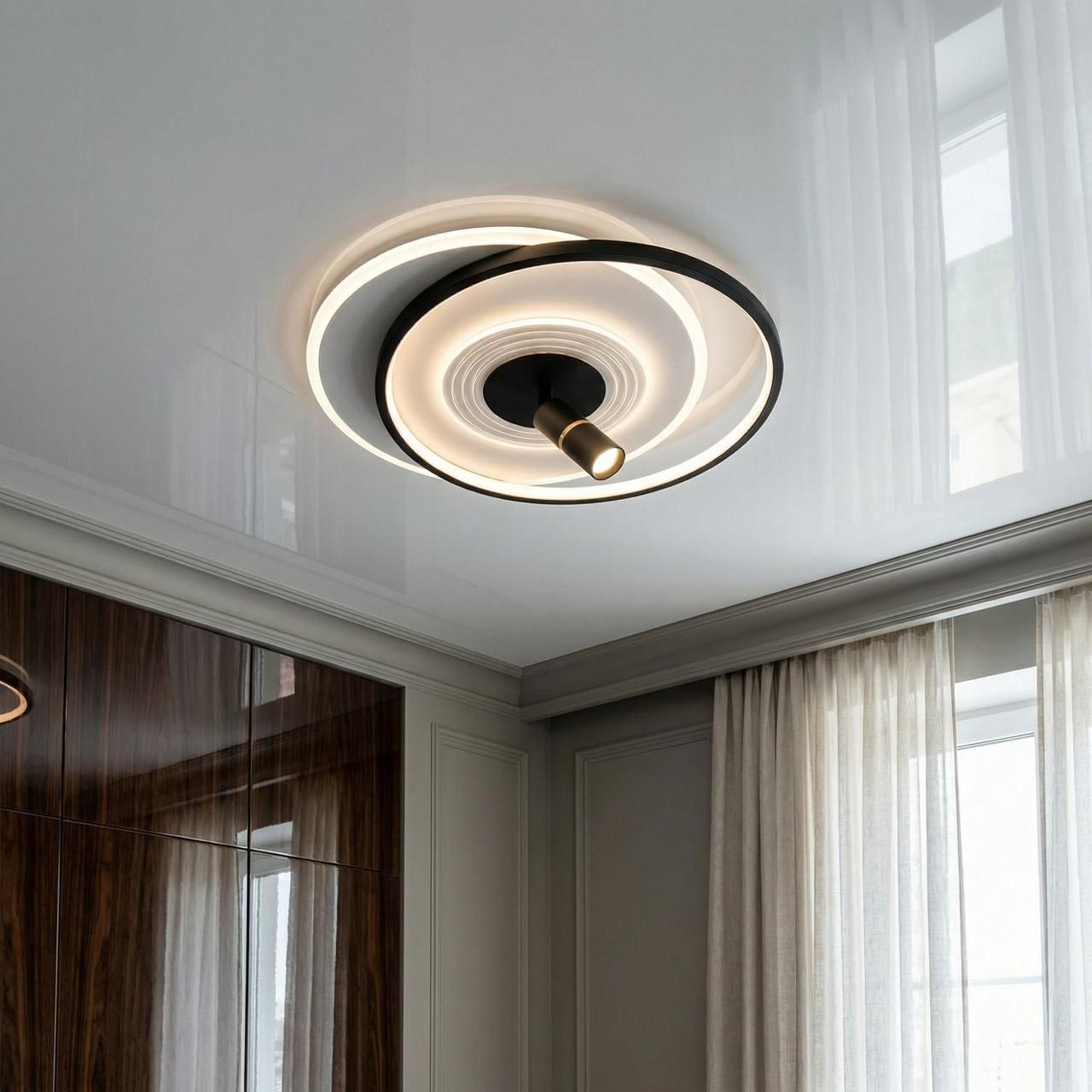 Дизайн моделі побудований на грі форм та контрастів: два світлових кільця (одне в білому матовому виконанні, інше — в чорному) перетинаються, створюючи динамічний силует. Головним функціональним акцентом є центральний поворотний спот, що дозволяє спрямувати світло саме туди, де воно потрібне (на робочий стіл, картину чи дзеркало). Чорна матова основа діаметром 39 см надійно приховує технічні виводи та гармонійно виглядає на сучасних стелях.