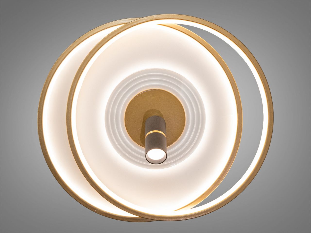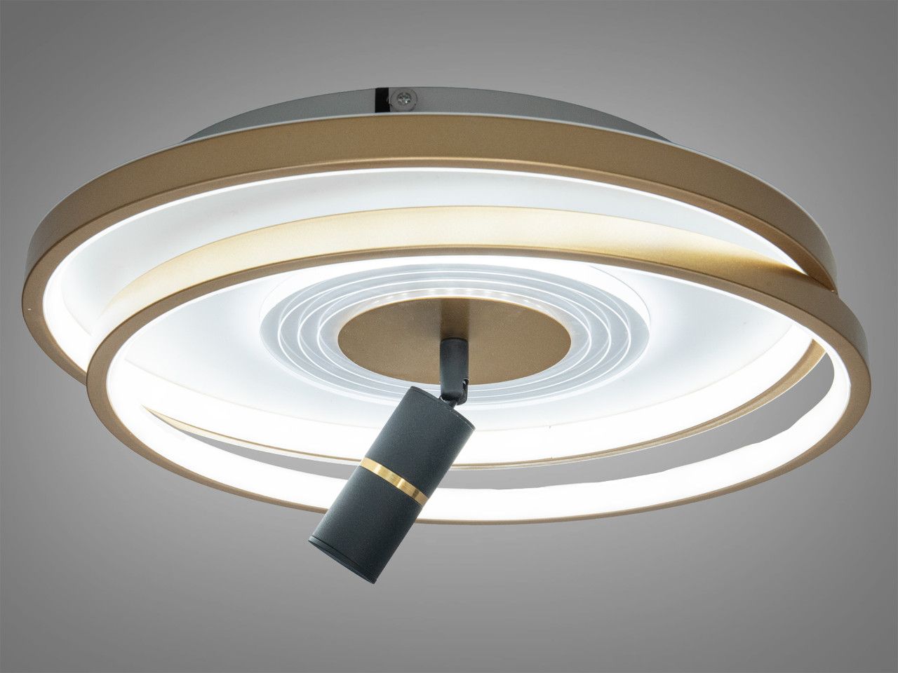 Дизайн моделі побудований на поєднанні м'яких ліній та індустріальних акцентів: два переплетених кільця (біле та золоте) створюють об'ємну композицію. Корпус виготовлений з металу з преміальним гальванічним покриттям кольору «золото» та якісним білим фарбуванням. Головна перевага — центральний поворотний спот, який дозволяє спрямувати промінь світла на робочий стіл, зону читання або ігрову частину кімнати.