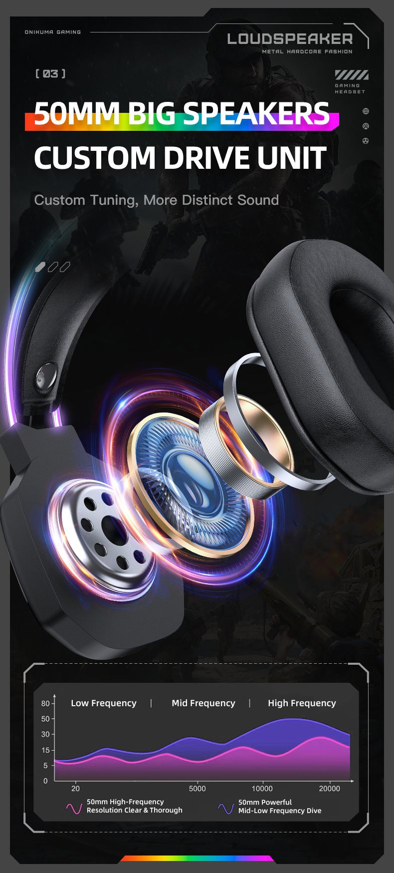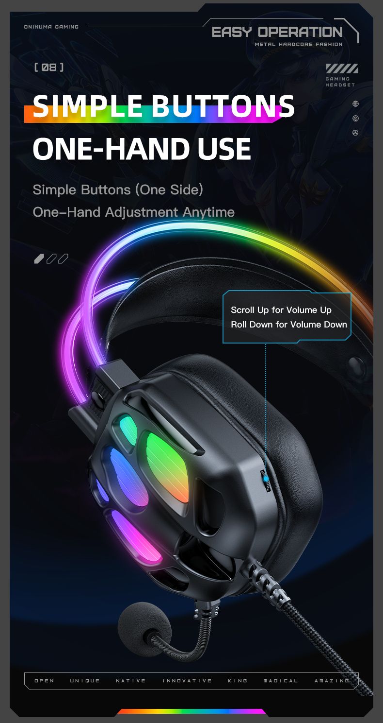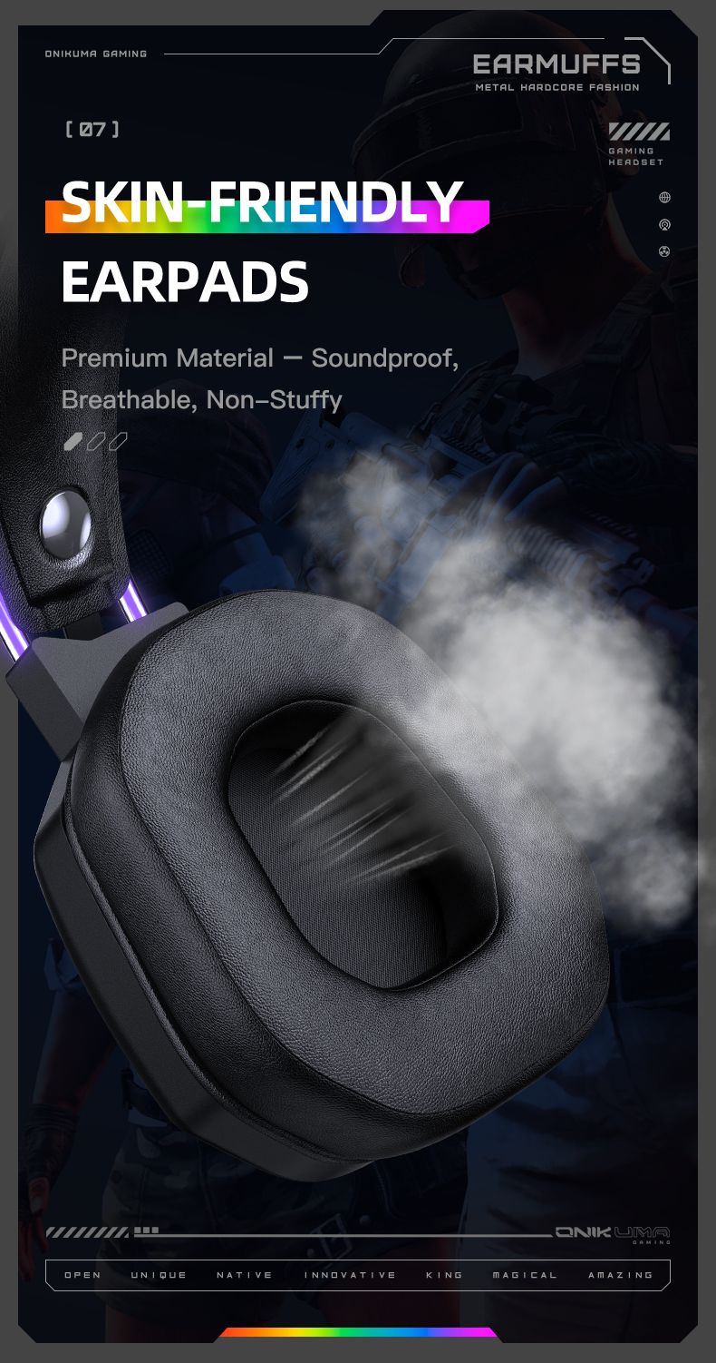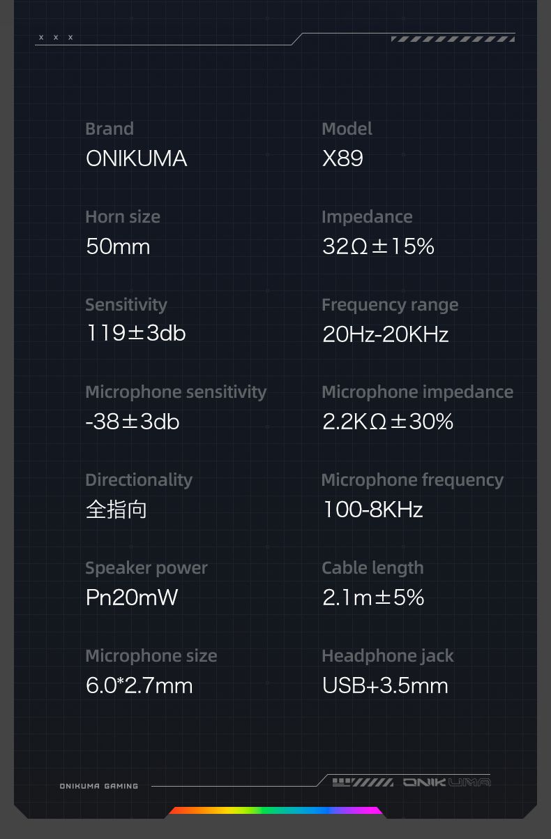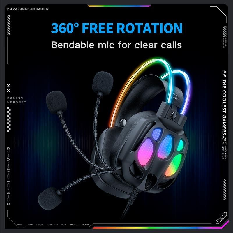 Onikuma X89 - це провідна ігрова гарнітура з потужними 50-мм динаміками, ефектним RGB-підсвічуванням та ергономічним дизайном. Модель розроблена для геймерів, яким важливим є якісний звук, точна передача голосу та комфорт навіть при тривалих ігрових сесіях.