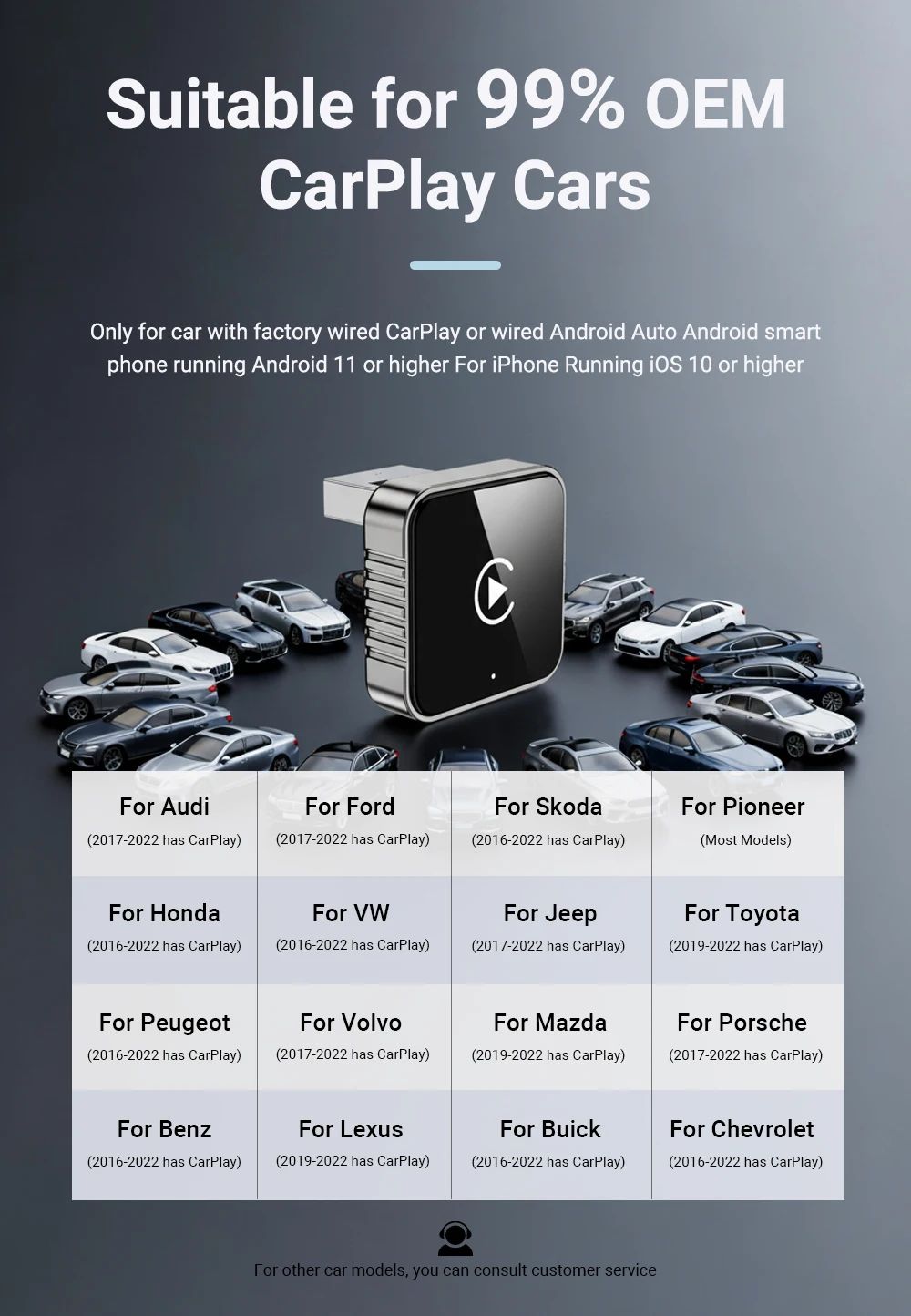 - Працює приблизно з 99% автомобілів, оснащених штатним дротовим CarPlay або Android Auto (OEM системи).