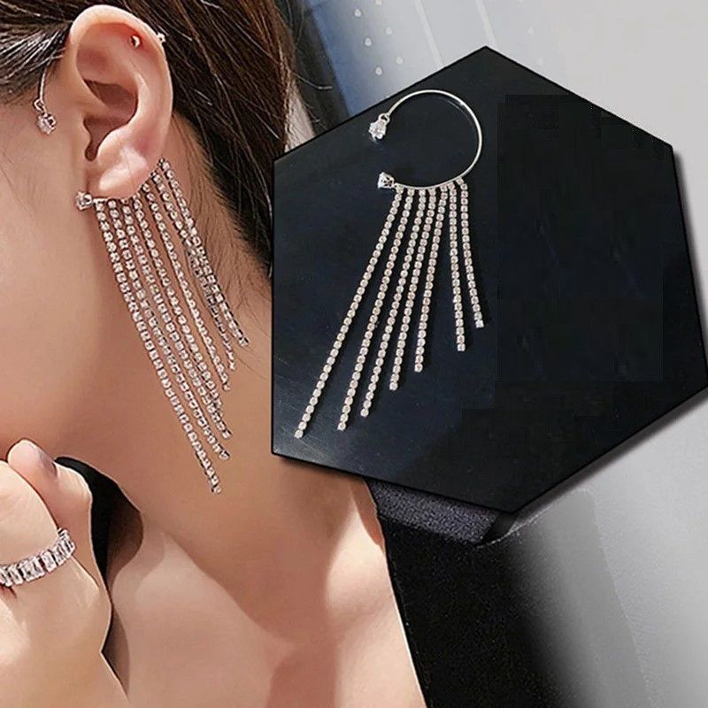 Елегантні сережки-манжети кафф з пензликами та кристалами 1шт висячі без проколу