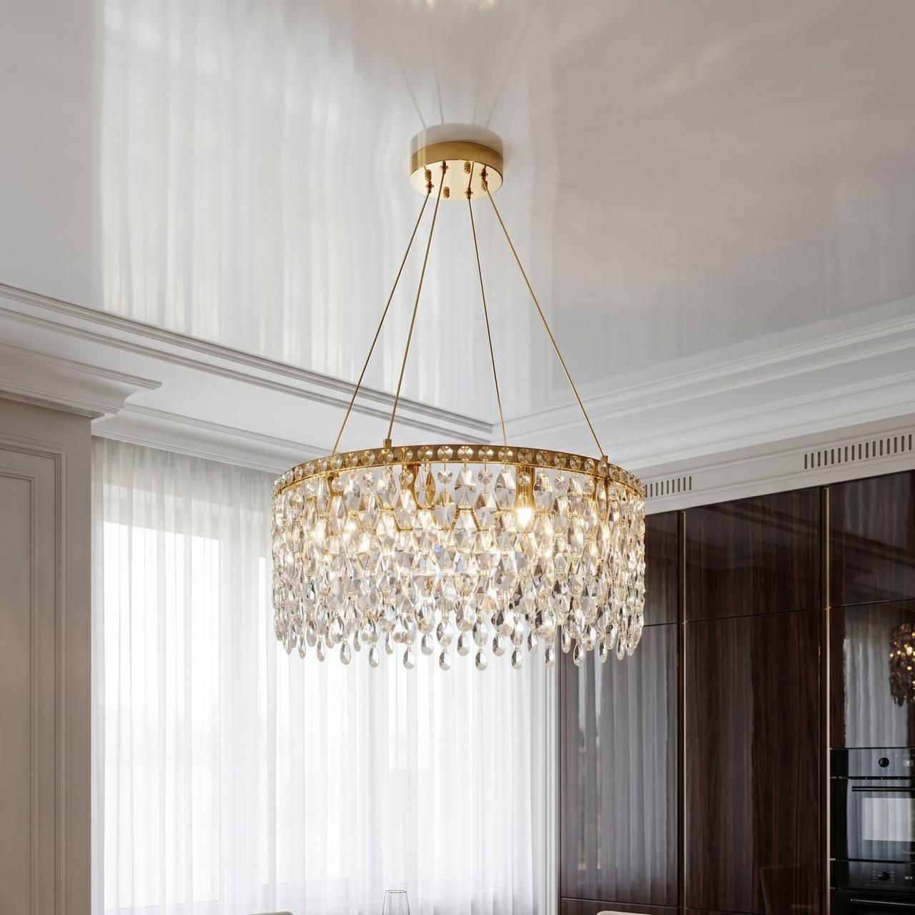 Кругла форма люстри діаметром 59 см бездоганно центрує обідню групу. Хрустальні каскади м'яко заломлюють світло, створюючи затишну та урочисту атмосферу для сімейних вечерь. Регульована висота дає змогу виставити ідеальну відстань до стільниці (рекомендується 70-90 см), забезпечуючи яскраве підсвічування без сліпучого ефекту.